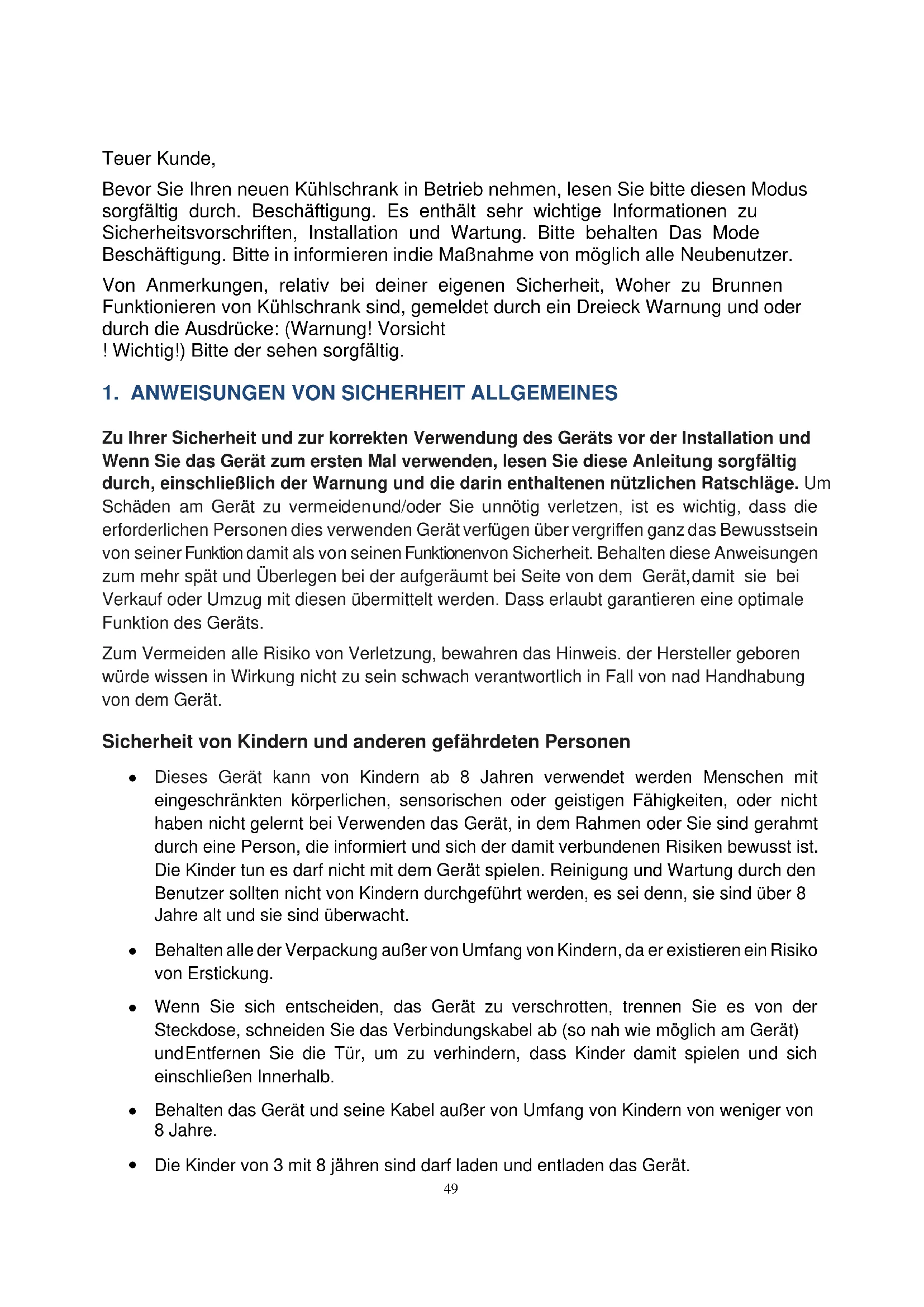 Teuer Kunde, Bevor Sie Ihren neuen Kühlschrank in Betrieb nehmen, lesen Sie bitte diesen Modus sorgfältig durch. Beschäftigung. Es enthält sehr wichtige Informationen zu Sicherheitsvorschriften, Installation und Wartung. Bitte behalten Das Mode Beschäftigung. Bitte in informieren in die Maßnahme von möglich alle Neubenutzer. Von Anmerkungen, relativ bei deiner eigenen Sicherheit, Woher zu Brunnen Funktionieren von Kühlschrank sind, gemeldet durch ein Dreieck Warnung und oder durch die Ausdrücke: (Warnung! Vorsicht ! Wichtig!) Bitte der sehen sorgfältig.