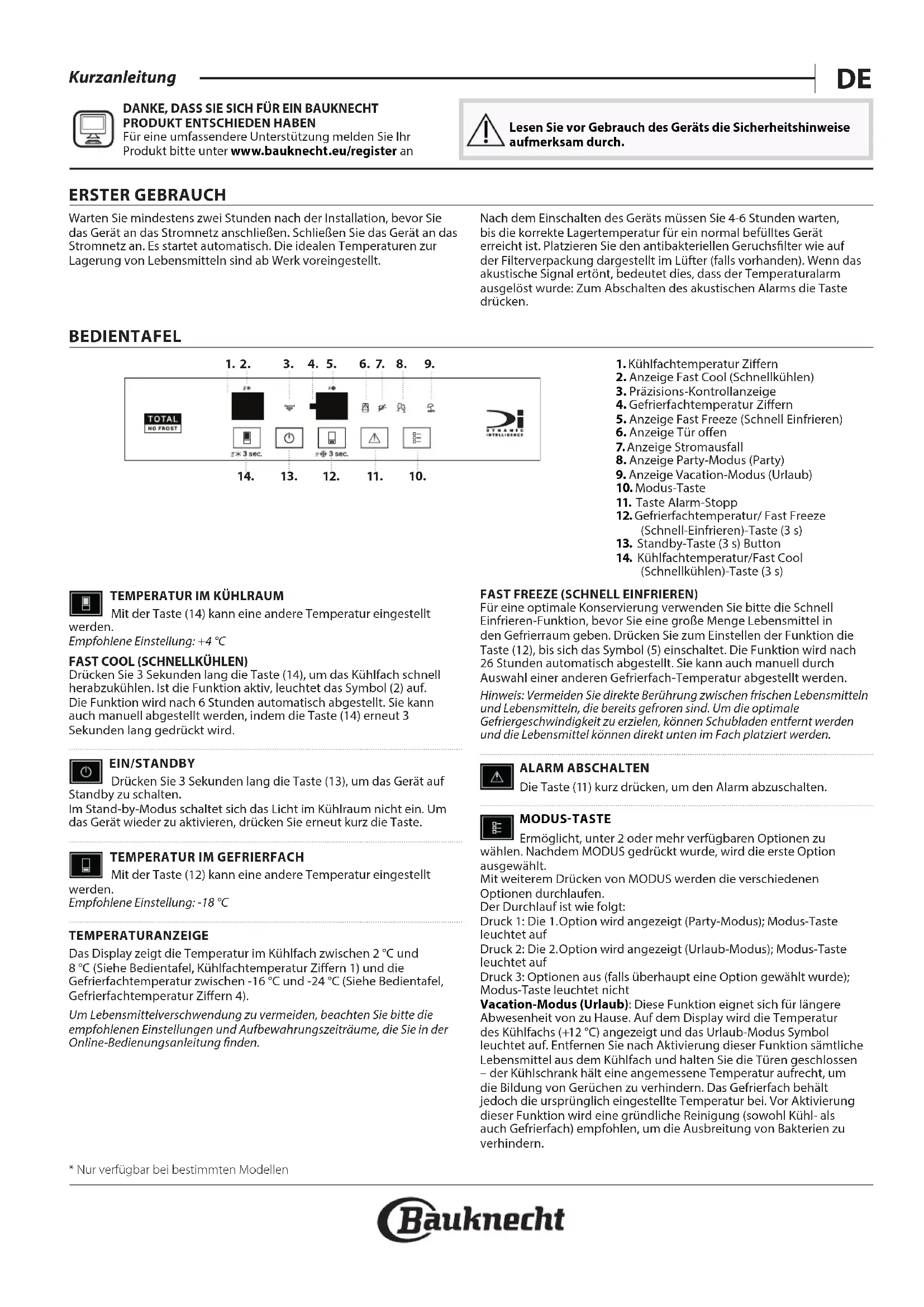 Für eine umfassendere Unterstützung melden Sie Ihr Produkt bitte unter www.bauknecht.eu/register an Lesen Sie vor Gebrauch des Geräts die Sicherheitshinweise aufmerksam durch. ERSTER GEBRAUCH Warten Sie mindestens zwei Stunden nach der Installation, bevor Sie das Gerät an das Stromnetz anschließen. Schließen Sie das Gerät an das Stromnetz an. Es startet automatisch. Die idealen Temperaturen zur Lagerung von Lebensmitteln sind ab Werk voreingestellt. Nach dem Einschalten des Geräts müssen Sie 4-6Stunden warten, bis die korrekte Lagertemperatur für ein normal befülltes Gerät erreicht ist. Platzieren Sie den antibakteriellen Geruchslter wie auf der Filterverpackung dargestellt im Lüfter (falls vorhanden). Wenn das akustische Signal ertönt, bedeutet dies, dass der Temperaturalarm ausgelöst wurde: Zum Abschalten des akustischen Alarms die Taste drücken. BEDIENTAFEL