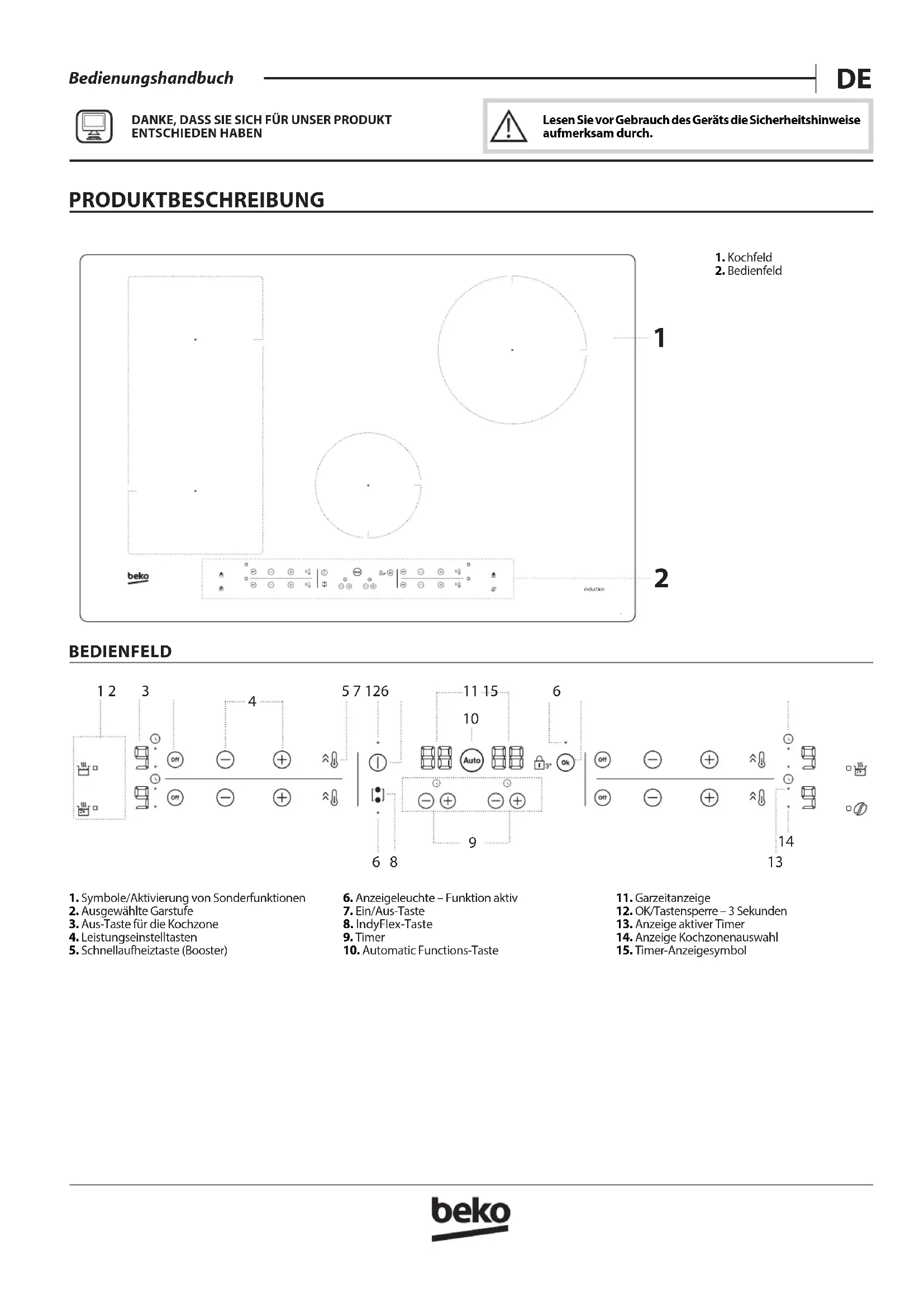 BEDIENFELD 1. Symbole/Aktivierung von Sonderfunktionen2. Ausgewählte Garstufe3. Aus-Taste für die Kochzone4. Leistungseinstelltasten5. Schnellaufheiztaste (Booster)6. Anzeigeleuchte – Funktion aktiv7. Ein/Aus-Taste8. IndyFlex-Taste9. Timer10. Automatic Functions-Taste11. Garzeitanzeige12. OK/Tastensperre – 3Sekunden13. Anzeige aktiver Timer14. Anzeige Kochzonenauswahl15. Timer-AnzeigesymbolDANKE, DASS SIE SICH FÜR UNSER PRODUKT ENTSCHIEDEN HABEN