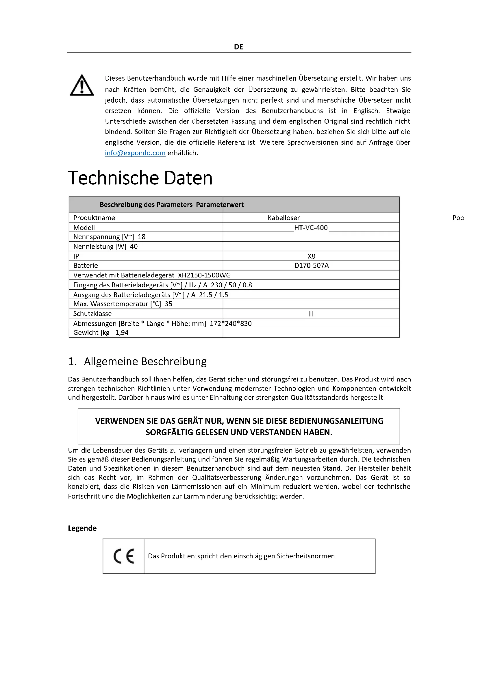 NAVODILA ZA UPORABODE Produktname Poolsauger EN Product name Cordless pool vacuum cleaner PL Nazwa produktu Bezprzewodowy odkurzacz do basenu CZ Název výrobku Akumulátorový bazénový vysavač FR Nom du produit Aspirateur de piscine sans fil IT Nome del prodotto Aspirapolvere per piscina senza fili ES Nombre del producto Aspiradora de piscina inalámbrica HU Termék neve Akkus medence porszívó DA Produktnavn Ledningsfri poolstøvsuger FI Tuotteen nimi Langaton allaspölynimuri NL Productnaam Snoerloze zwembadstofzuiger NO Produktnavn Trådløs bassengstøvsuger SE Produktnamn Sladdlös pooldammsugare PT Nome do produto Aspirador de pó para piscina sem fio SK Názov produktu Akumulátorový bazénový vysávač BG Име на продукта Безжична прахосмукачка за басейн EL Όνομα προϊόντος Ασύρματη ηλεκτρική σκούπα πισίνας HR Naziv proizvoda Bežični usisivač za bazen LT Produkto pavadinimas Belaidis baseino dulkių siurblys RO Numele produsului Aspirator de piscina fara fir SL Ime izdelka Brezžični sesalnik za bazen DE Modell | EN Product model | PL Model produktu | CZ Model výrobku | FR Modèle | IT Modello | ES Modelo | HU Modell | DA Model | FI Tuotteen malli | NL Productmodel | NO Produktmodell | SE Produktmodell | PT Modelo do produto | SK Model | BG Модел на продукт | EL Μοντέλο προϊόντος | HR Model proizvoda | LT: Gaminio modelis | RO: Model de produs | SL: Model izdelka HT-VC-400 DE Hersteller | EN Manufacturer | PL Producent | CZ Výrobce | FR Fabricant | IT Produttore | ES Fabricante | HU Termelő | DA Producent | FI Valmistaja | NL Producent | NO Produsent | SE Tillverkare | PT Fabricante | SK Výrobca | BG Производител | EL Κατασκευαστής | HR Proizvođač | LT Gamintojas | RO Producător | SL Proizvajalec expondo Polska sp. z o.o. sp. k. DE Anschrift des Herstellers | EN Manufacturer Address | PL Adres producenta | CZ Adresa výrobce | FR Adresse du fabricant | IT Indirizzo del produttore | ES Dirección del fabricante | HU A gyártó címe | DA Producentens adresse | FI Valmistajan osoite | NL Adres producent | NO Produsentens adresse | SE Tillverkarens adress | PT Endereço do fabricante | SK Adresa výrobcu | BG Адрес на производителя | EL: Διεύθυνση κατασκευαστή | HR Adresa proizvođača | LT Gamintojo adresas | RO Adresa producătorului | SL Naslov proizvajalca ul. Nowy Kisielin – Innowacyjna 7, 66-002 Zielona Góra | Poland, EUDE Dieses Benutzerhandbuch wurde mit Hilfe einer maschinellen Übersetzung erstellt. Wir haben uns nach Kräften bemüht, die Genauigkeit der Übersetzung zu gewährleisten. Bitte beachten Sie jedoch, dass automatische Übersetzungen nicht perfekt sind und menschliche Übersetzer nicht ersetzen können. Die offizielle Version des Benutzerhandbuchs ist in Englisch. Etwaige Unterschiede zwischen der übersetzten Fassung und dem englischen Original sind rechtlich nicht bindend. Sollten Sie Fragen zur Richtigkeit der Übersetzung haben, beziehen Sie sich bitte auf die englische Version, die die offizielle Referenz ist. Weitere Sprachversionen sind auf Anfrage über info@expondo.com erhältlich. Technische Daten Beschreibung des Parameters Parameterwert Produktname Kabelloser Pool-Staubsauger Modell Nennspannung [V~] 18 Nennleistung [W] 40 IP X8 Batterie D170-507A Verwendet mit Batterieladegerät XH2150-1500WG Eingang des Batterieladegeräts [V~] / Hz / A 230 / 50 / 0.8 Ausgang des Batterieladegeräts [V~] / A 21.5 / 1.5 Max. Wassertemperatur [°C] 35 Schutzklasse Abmessungen [Breite * Länge * Höhe; mm] 172*240*830 Gewicht [kg] 1,94