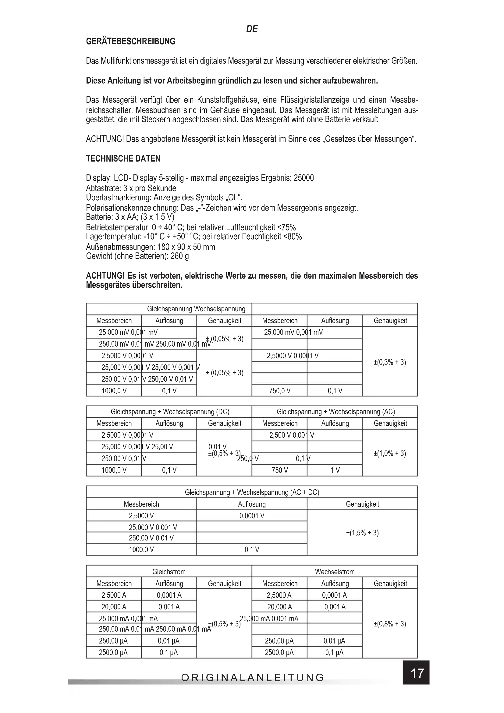 GERÄTEBESCHREIBUNG Das Multifunktionsmessgerät ist ein digitales Messgerät zur Messung verschiedener elektrischer Größen. Diese Anleitung ist vor Arbeitsbeginn gründlich zu lesen und sicher aufzubewahren. Das Messgerät verfügt über ein Kunststoff gehäuse, eine Flüssigkristallanzeige und einen Messbe- reichsschalter. Messbuchsen sind im Gehäuse eingebaut. Das Messgerät ist mit Messleitungen aus- gestattet, die mit Steckern abgeschlossen sind. Das Messgerät wird ohne Batterie verkauft. ACHTUNG! Das angebotene Messgerät ist kein Messgerät im Sinne des „Gesetzes über Messungen“. TECHNISCHE DATEN Display: LCD- Display 5-stellig - maximal angezeigtes Ergebnis: 25000 Abtastrate: 3 x pro Sekunde Überlastmarkierung: Anzeige des Symbols „OL“. Polarisationskennzeichnung: Das „-“-Zeichen wird vor dem Messergebnis angezeigt. Batterie: 3 x AA; (3 x 1.5 V) Betriebstemperatur: 0 ÷ 40° C; bei relativer Luftfeuchtigkeit <75% Lagertemperatur: -10° C ÷ +50° °C; bei relativer Feuchtigkeit <80% Außenabmessungen: 180 x 90 x 50 mm Gewicht (ohne Batterien): 260 g ACHTUNG! Es ist verboten, elektrische Werte zu messen, die den maximalen Messbereich des Messgerätes überschreiten. Gleichspannung Wechselspannung Messbereich Aufl ösung Genauigkeit Messbereich Aufl ösung Genauigkeit 25,000 mV 0,001 mV ± (0,05% + 3) 25,000 mV 0,001 mV ±(0,3% + 3) 250,00 mV 0,01 mV 250,00 mV 0,01 mV 2,5000 V 0,0001 V ± (0,05% + 3) 2,5000 V 0,0001 V 25,000 V 0,001 V 25,000 V 0,001 V 250,00 V 0,01 V 250,00 V 0,01 V 1000,0 V 0,1 V 750,0 V 0,1 V Gleichspannung + Wechselspannung (DC) Gleichspannung + Wechselspannung (AC) Messbereich Aufl ösung Genauigkeit Messbereich Aufl ösung Genauigkeit 2,5000 V 0,0001 V ±(0,5% + 3) 2,500 V 0,001 V ±(1,0% + 3) 25,000 V 0,001 V 25,00 V 0,01 V 250,00 V 0,01 V 250,0 V 0,1 V 1000,0 V 0,1 V 750 V 1 V Gleichspannung + Wechselspannung (AC + DC) Messbereich Aufl ösung Genauigkeit 2,5000 V 0,0001 V ±(1,5% + 3) 25,000 V 0,001 V 250,00 V 0,01 V 1000,0 V 0,1 V Gleichstrom Wechselstrom Messbereich Aufl ösung Genauigkeit Messbereich Aufl ösung Genauigkeit 2,5000 A 0,0001 A ±(0,5% + 3) 2,5000 A 0,0001 A ±(0,8% + 3) 20,000 A 0,001 A 20,000 A 0,001 A 25,000 mA 0,001 mA 25,000 mA 0,001 mA 250,00 mA 0,01 mA 250,00 mA 0,01 mA 250,00 μA 0,01 μA 250,00 μA 0,01 μA 2500,0 μA 0,1 μA 2500,0 μA 0,1 μA18 ORIGINALANLEITUNG