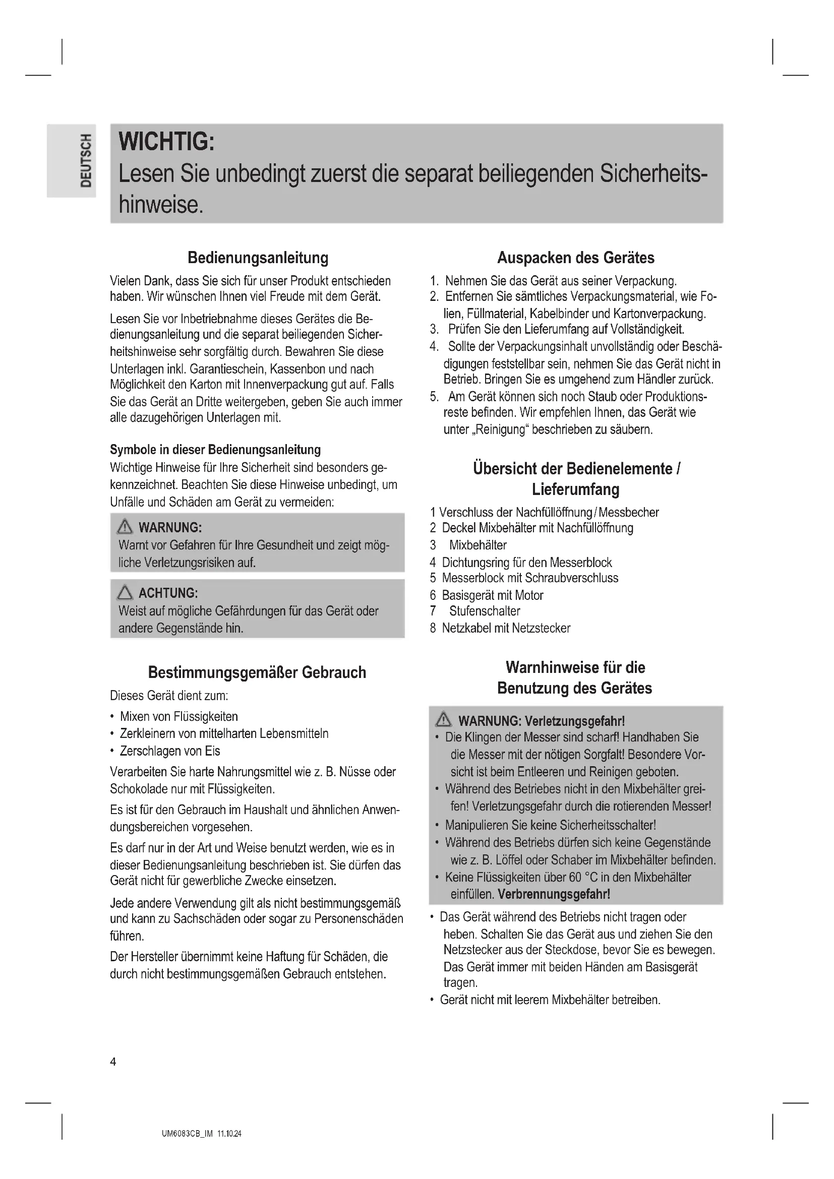 Übersicht der Bedienelemente Overview of the Components • Overzicht van de bedieningselementen Liste des différents éléments de commande • Indicación de los elementos de manejo Elementi di comando • Przegląd elementów obsługi • A kezelőelemek áttekintése Обзор деталей прибора •4 UM6083CB_IM 11.10.24 WICHTIG: Lesen Sie unbedingt zuerst die separat beiliegenden Sicherheits- hinweise. Bedienungsanleitung Vielen Dank, dass Sie sich für unser Produkt entschieden haben. Wir wünschen Ihnen viel Freude mit dem Gerät. Lesen Sie vor Inbetriebnahme dieses Gerätes die Be- dienungsanleitung und die separat beiliegenden Sicher- heitshinweise sehr sorgfältig durch. Bewahren Sie diese Unterlagen inkl. Garantieschein, Kassenbon und nach Möglichkeit den Karton mit Innenverpackung gut auf. Falls Sie das Gerät an Dritte weitergeben, geben Sie auch immer alle dazugehörigen Unterlagen mit. Symbole in dieser Bedienungsanleitung Wichtige Hinweise für Ihre Sicherheit sind besonders ge- kennzeichnet. Beachten Sie diese Hinweise unbedingt, um Unfälle und Schäden am Gerät zu vermeiden: WARNUNG: Warnt vor Gefahren für Ihre Gesundheit und zeigt mög- liche Verletzungsrisiken auf. ACHTUNG: Weist auf mögliche Gefährdungen für das Gerät oder andere Gegenstände hin. Bestimmungsgemäßer Gebrauch Dieses Gerät dient zum: