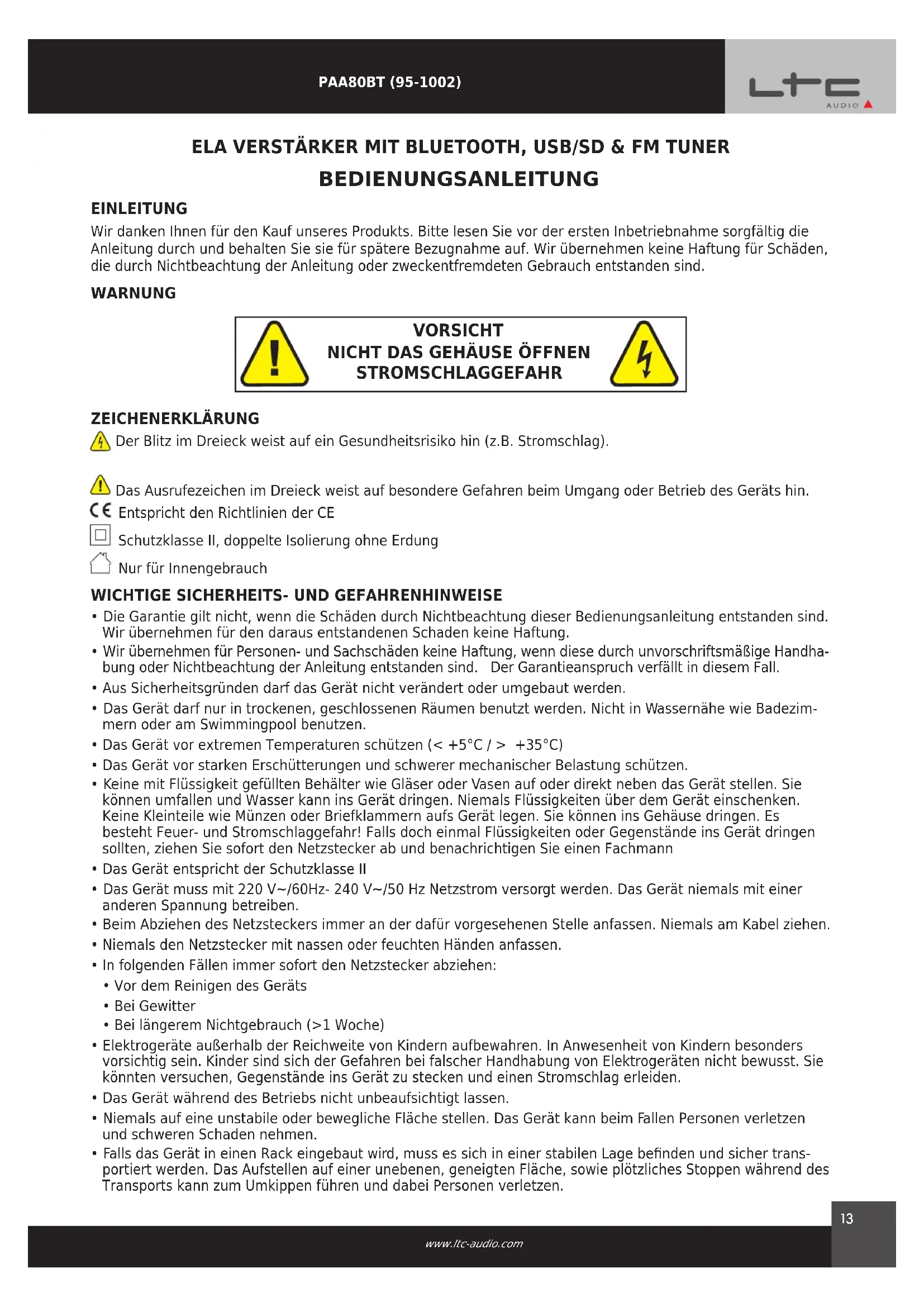 Finden Sie kostenlos die Bedienungsanleitung des Geräts PAA80BT LTC als PDF.