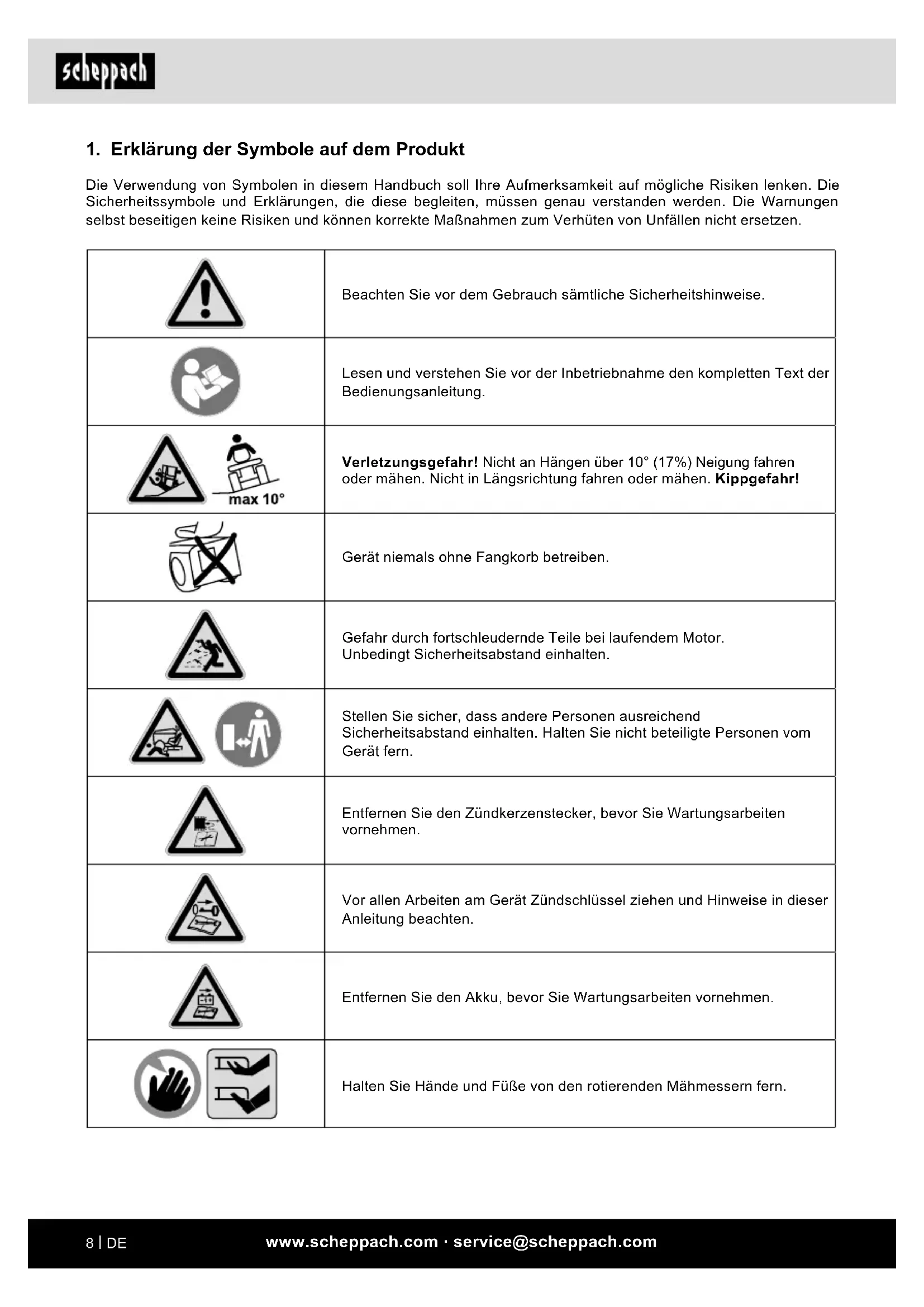Die Verwendung von Symbolen in diesem Handbuch soll Ihre Aufmerksamkeit auf mögliche Risiken lenken. Die Sicherheitssymbole und Erklärungen, die diese begleiten, müssen genau verstanden werden. Die Warnungen selbst beseitigen keine Risiken und können korrekte Maßnahmen zum Verhüten von Unfällen nicht ersetzen. Beachten Sie vor dem Gebrauch sämtliche Sicherheitshinweise. Lesen und verstehen Sie vor der Inbetriebnahme den kompletten Text der Bedienungsanleitung. Verletzungsgefahr! Nicht an Hängen über 10° (17%) Neigung fahren oder mähen. Nicht in Längsrichtung fahren oder mähen. Kippgefahr! Gerät niemals ohne Fangkorb betreiben. Gefahr durch fortschleudernde Teile bei laufendem Motor. Unbedingt Sicherheitsabstand einhalten. Stellen Sie sicher, dass andere Personen ausreichend Sicherheitsabstand einhalten. Halten Sie nicht beteiligte Personen vom Gerät fern. Entfernen Sie den Zündkerzenstecker, bevor Sie Wartungsarbeiten vornehmen. Vor allen Arbeiten am Gerät Zündschlüssel ziehen und Hinweise in dieser Anleitung beachten. Entfernen Sie den Akku, bevor Sie Wartungsarbeiten vornehmen. Halten Sie Hände und Füße von den rotierenden Mähmessern fern.www.scheppach.com · service@scheppach.com
