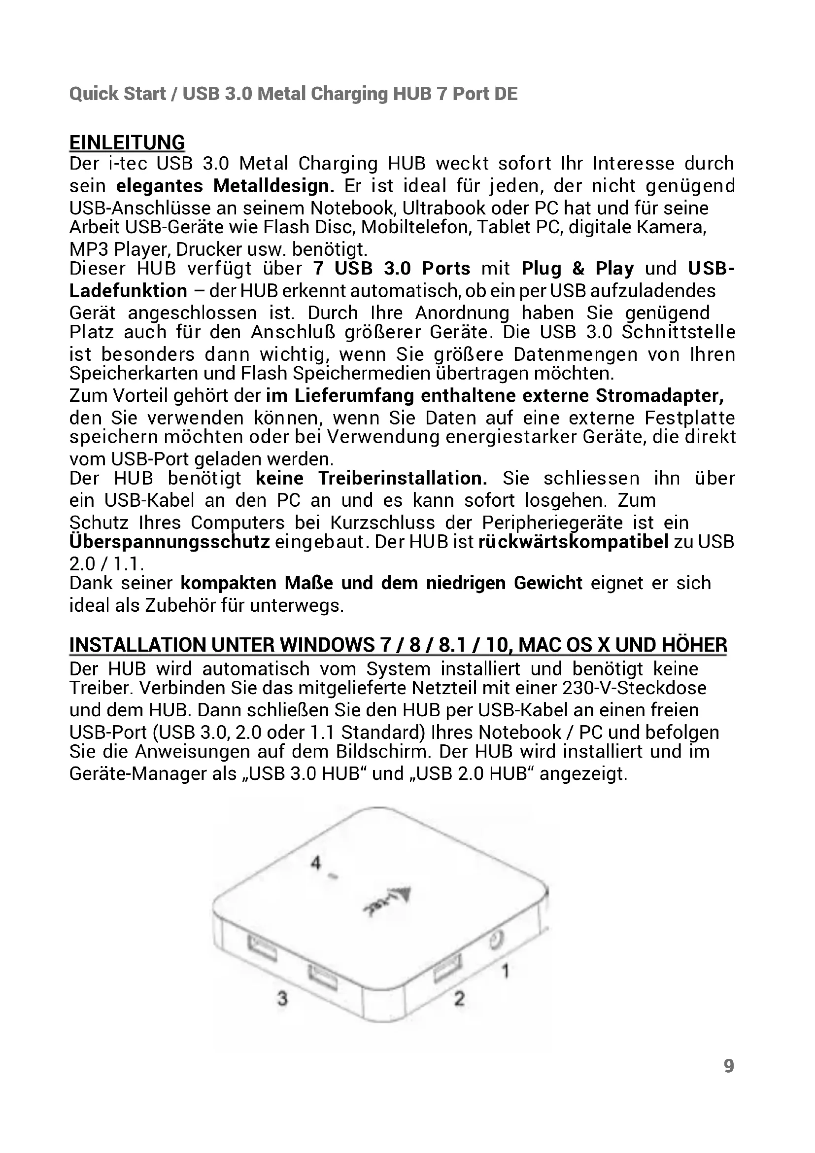 Available on our website www.i-tec.cz/en on the “FAQ” tab of this product.9 Quick Start / USB 3.0 Metal Charging HUB 7 Port DE EINLEITUNG Der i-tec USB 3.0 Metal Charging HUB weckt sofort Ihr Interesse durch sein elegantes Metalldesign. Er ist ideal für jeden, der nicht genügend USB-Anschlüsse an seinem Notebook, Ultrabook oder PC hat und für seine Arbeit USB-Geräte wie Flash Disc, Mobiltelefon, Tablet PC, digitale Kamera, MP3 Player, Drucker usw. benötigt. Dieser HUB verfügt über 7 USB 3.0 Ports mit Plug & Play und USB- Ladefunktion – der HUB erkennt automatisch, ob ein per USB aufzuladendes Gerät angeschlossen ist. Durch Ihre Anordnung haben Sie genügend Platz auch für den Anschluß größerer Geräte. Die USB 3.0 Schnittstelle ist besonders dann wichtig, wenn Sie größere Datenmengen von Ihren Speicherkarten und Flash Speichermedien übertragen möchten. Zum Vorteil gehört der im Lieferumfang enthaltene externe Stromadapter, den Sie verwenden können, wenn Sie Daten auf eine externe Festplatte speichern möchten oder bei Verwendung energiestarker Geräte, die direkt vom USB-Port geladen werden. Der HUB benötigt keine Treiberinstallation. Sie schliessen ihn über ein USB-Kabel an den PC an und es kann sofort losgehen. Zum Schutz Ihres Computers bei Kurzschluss der Peripheriegeräte ist ein Überspannungsschutz eingebaut. Der HUB ist rückwärtskompatibel zu USB