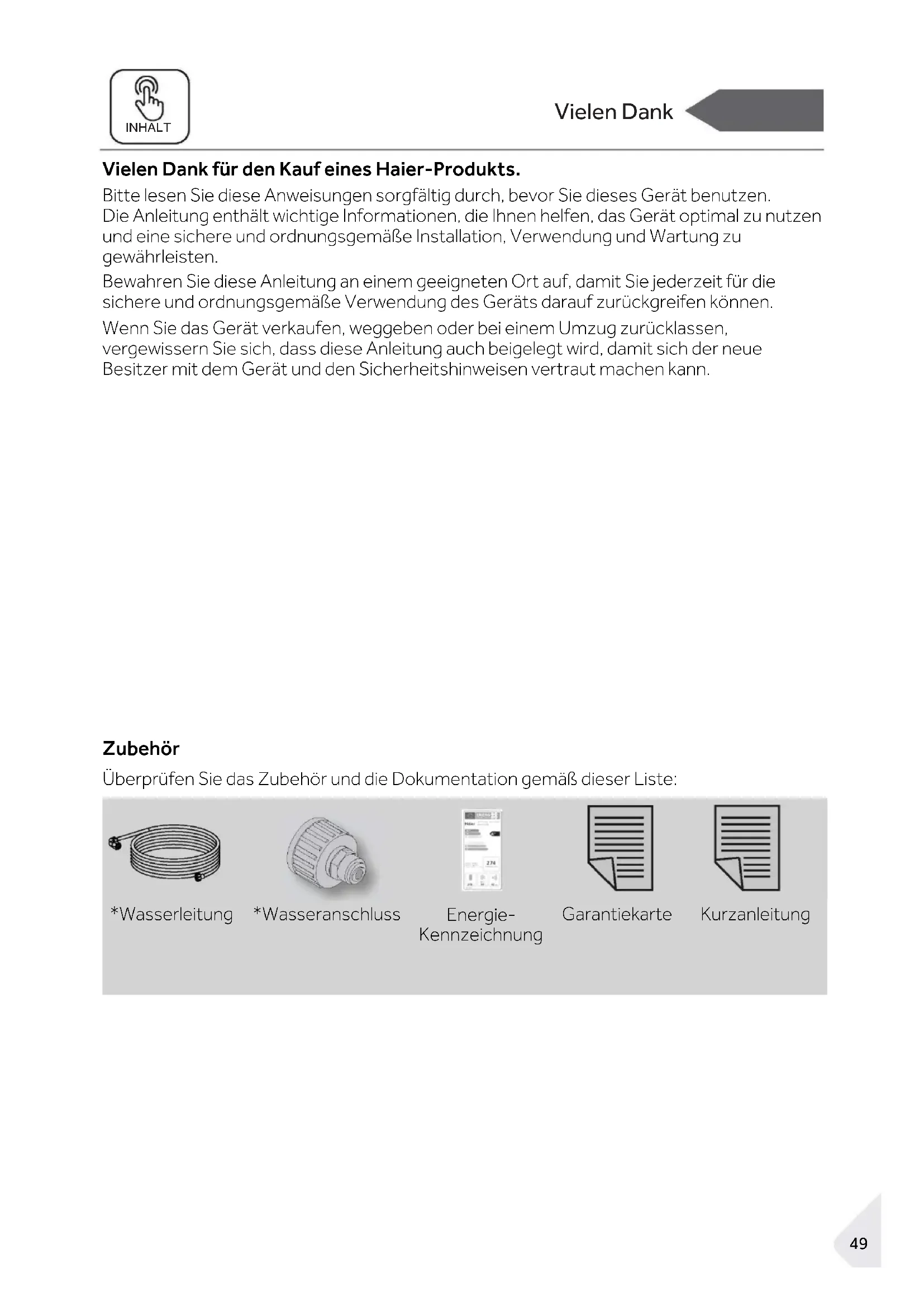 - Kundendienst Vielen Dank INHALT Vielen Dank für den Kauf eines Haier-Produkts. Bitte lesen Sie diese Anweisungen sorgfältig durch, bevor Sie dieses Gerät benutzen. Die Anleitung enthält wichtige Informationen, die Ihnen helfen, das Gerät optimal zu nutzen und eine sichere und ordnungsgemäße Installation, Verwendung und Wartung zu gewährleisten. Bewahren Sie diese Anleitung an einem geeigneten Ort auf, damit Sie jederzeit für die sichere und ordnungsgemäße Verwendung des Geräts darauf zurückgreifen können. Wenn Sie das Gerät verkaufen, weggeben oder bei einem Umzug zurücklassen, vergewissern Sie sich, dass diese Anleitung auch beigelegt wird, damit sich der neue Besitzer mit dem Gerät und den Sicherheitshinweisen vertraut machen kann. Zubehör Überprüfen Sie das Zubehör und die Dokumentation gemäß dieser Liste: p. 8949
