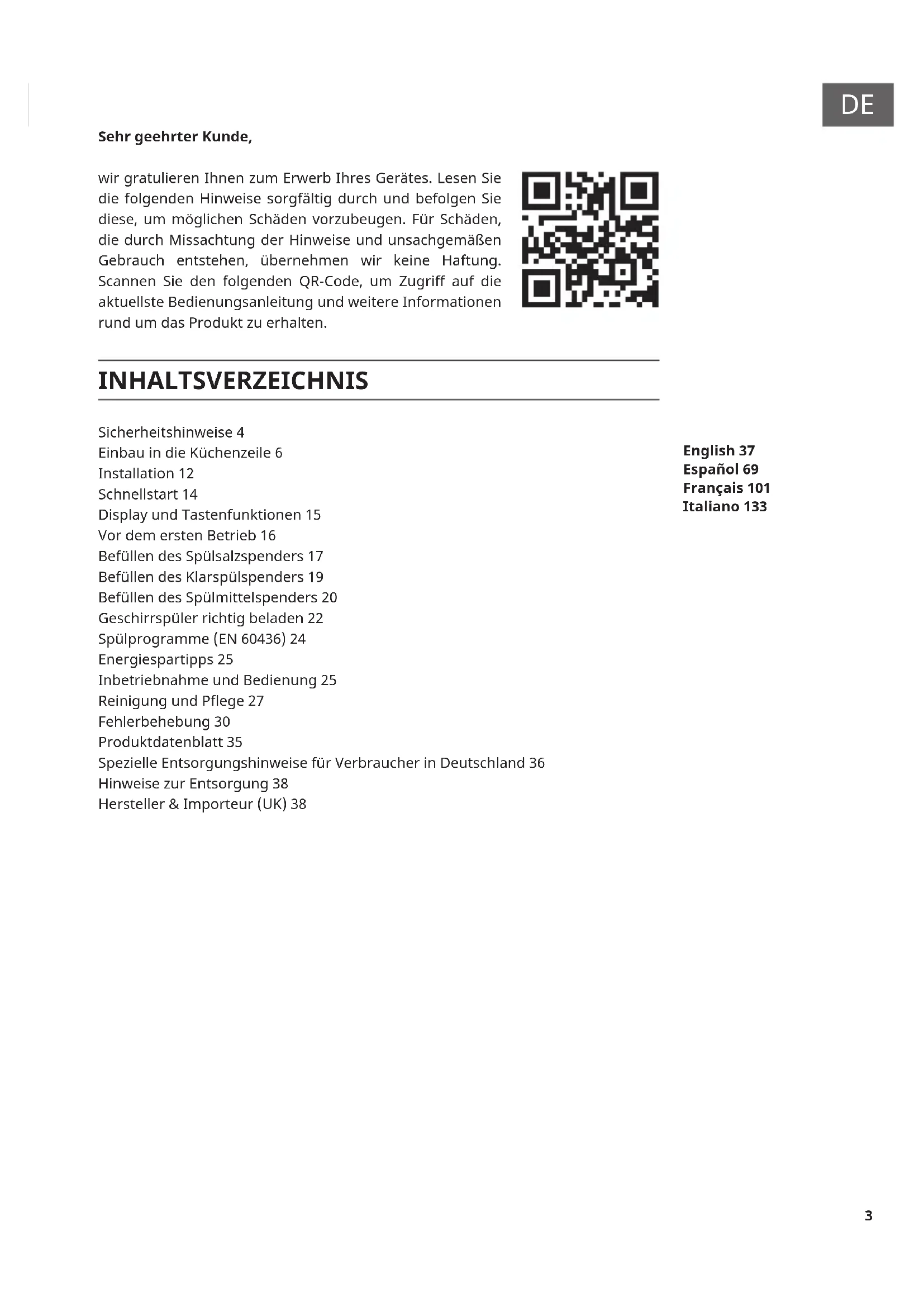 Sehr geehrter Kunde, wir gratulieren Ihnen zum Erwerb Ihres Gerätes. Lesen Sie die folgenden Hinweise sorgfältig durch und befolgen Sie diese, um möglichen Schäden vorzubeugen. Für Schäden, die durch Missachtung der Hinweise und unsachgemäßen Gebrauch entstehen, übernehmen wir keine Haftung. Scannen Sie den folgenden QR-Code, um Zugriff auf die aktuellste Bedienungsanleitung und weitere Informationen rund um das Produkt zu erhalten. INHALTSVERZEICHNIS English 37 Español 69 Français 101 Italiano 133 Sicherheitshinweise 4 Einbau in die Küchenzeile 6 Installation 12 Schnellstart 14 Display und Tastenfunktionen 15 Vor dem ersten Betrieb 16 Befüllen des Spülsalzspenders 17 Befüllen des Klarspülspenders 19 Befüllen des Spülmittelspenders 20 Geschirrspüler richtig beladen 22 Spülprogramme (EN 60436) 24 Energiespartipps 25 Inbetriebnahme und Bedienung 25 Reinigung und Pege 27 Fehlerbehebung 30 Produktdatenblatt 35 Spezielle Entsorgungshinweise für Verbraucher in Deutschland 36 Hinweise zur Entsorgung 38 Hersteller & Importeur (UK) 384
