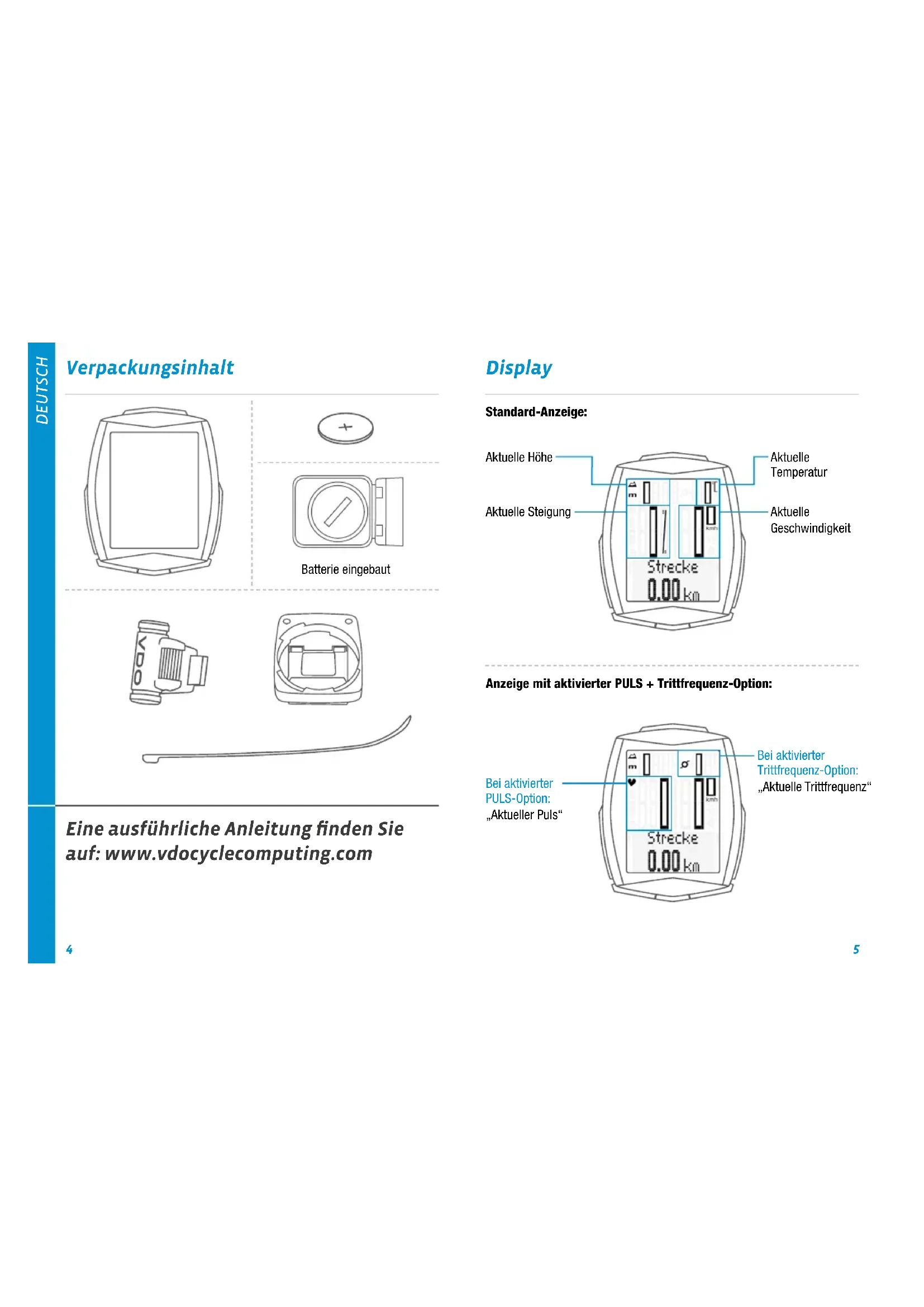 Verpackungsinhalt Batterie eingebaut Eine ausführliche Anleitung finden Sie auf: www.vdocyclecomputing.com Display Aktuelle Geschwindigkeit Aktuelle Steigung Aktuelle Temperatur Aktuelle Höhe Standard-Anzeige: Bei aktivierter PULS-Option: „Aktueller Puls“ Bei aktivierter Trittfrequenz-Option: „Aktuelle Trittfrequenz“ Anzeige mit aktivierter PULS + Trittfrequenz-Option:DEUTSCH