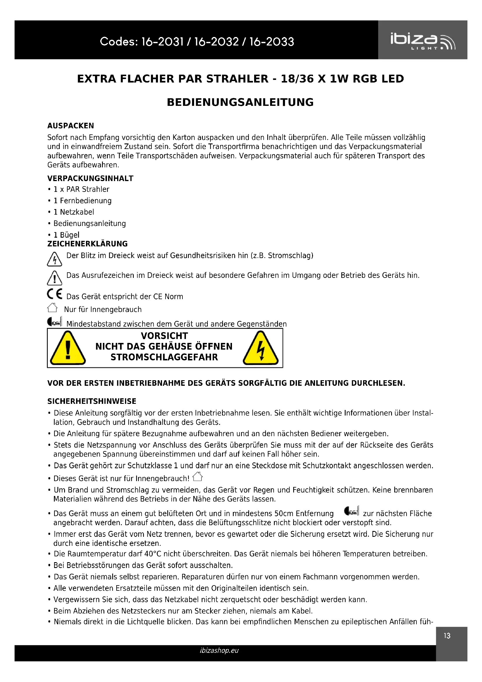 ibizashop.eu EXTRA FLACHER PAR STRAHLER - 18/36 X 1W RGB LED BEDIENUNGSANLEITUNG AUSPACKEN Sofort nach Empfang vorsichtig den Karton auspacken und den Inhalt überprüfen. Alle Teile müssen vollzählig und in einwandfreiem Zustand sein. Sofort die Transportrma benachrichtigen und das Verpackungsmaterial aufbewahren, wenn Teile Transportschäden aufweisen. Verpackungsmaterial auch für späteren Transport des Geräts aufbewahren. VERPACKUNGSINHALT