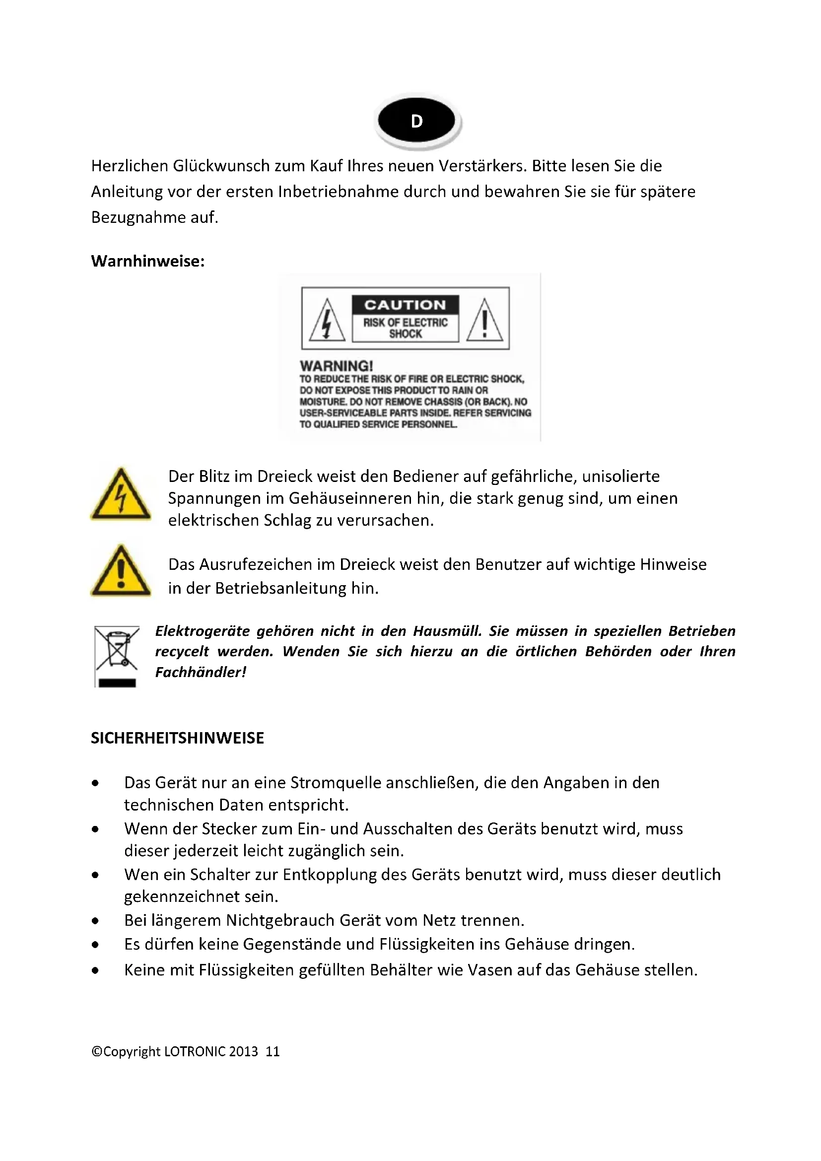 Herzlichen Glückwunsch zum Kauf Ihres neuen Verstärkers. Bitte lesen Sie die Anleitung vor der ersten Inbetriebnahme durch und bewahren Sie sie für spätere Bezugnahme auf. Warnhinweise: