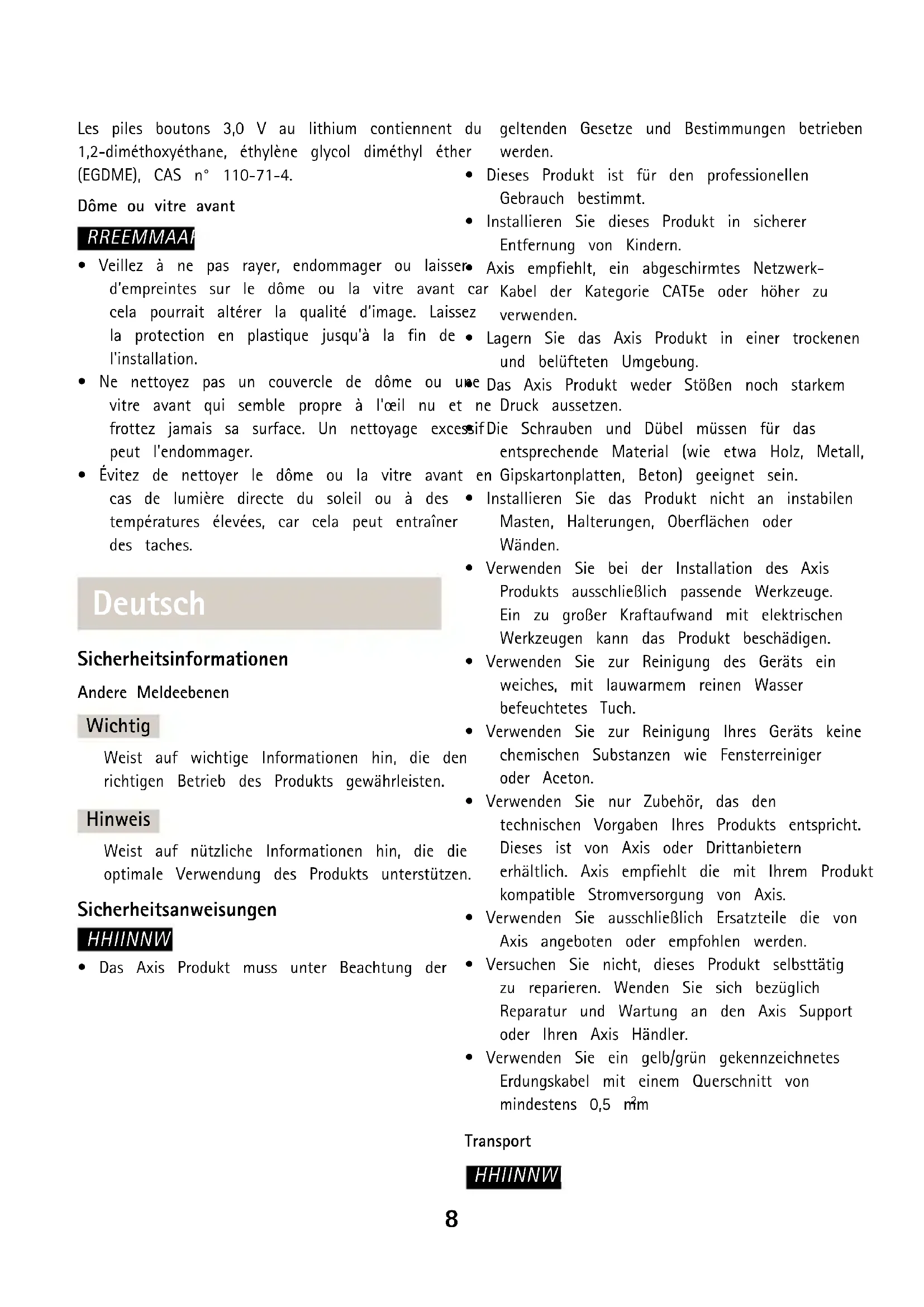 - Évitez de nettoyer le dôme ou la vitre avant en cas de lumière directe du soleil ou à des températures élevées, car cela peut entraîner des taches. Deutsch Sicherheitsinformationen Andere Meldeebenen Wichtig Weist auf wichtige Informationen hin, die den richtigen Betrieb des Produkts gewährleisten. Hinweis Weist auf nützliche Informationen hin, die die optimale Verwendung des Produkts unterstützen. Sicherheitsanweisungen HHIINNWWEEIISS