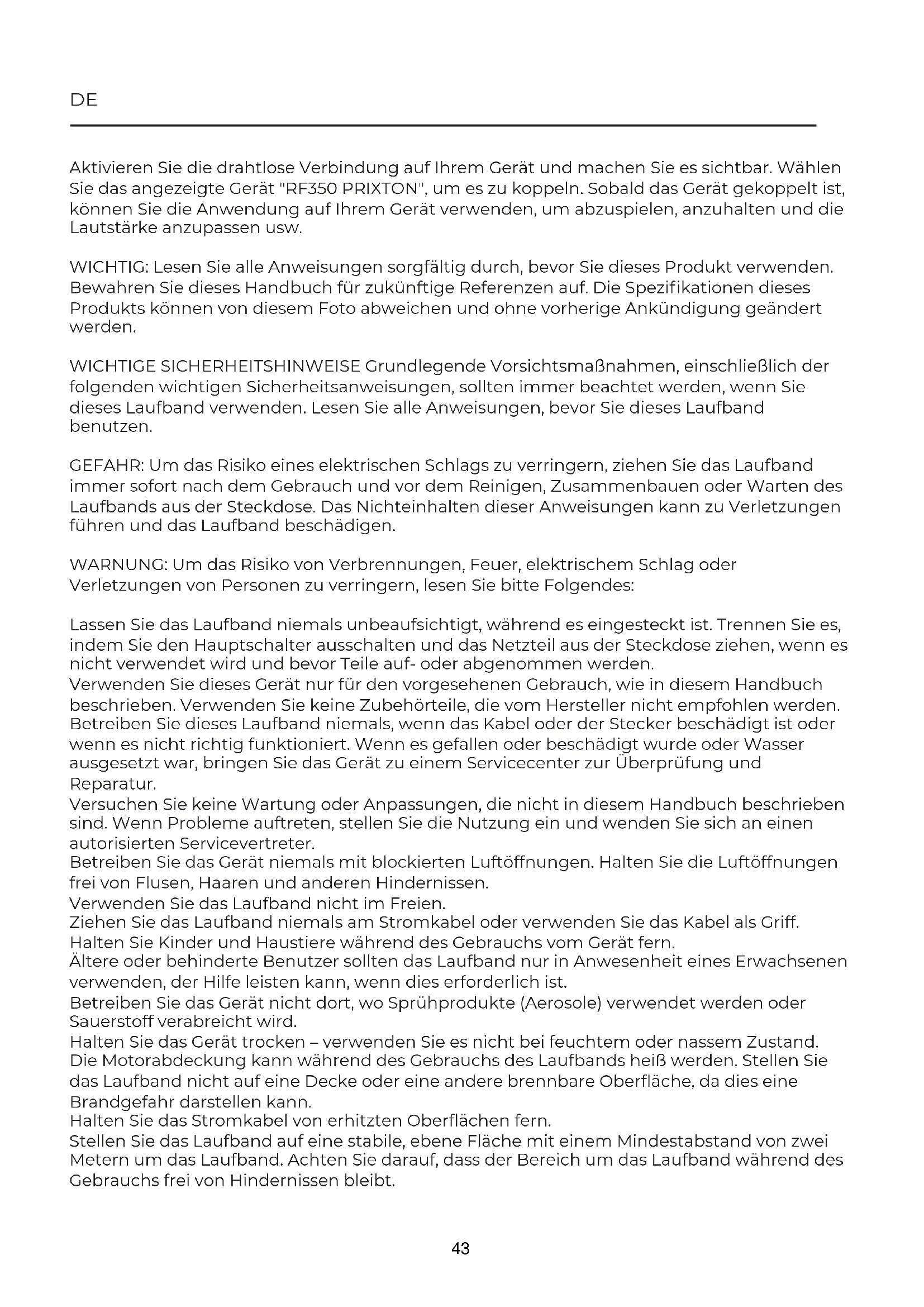 CATEGORIA Prixton RUN FIT RF350 TREADMILL Fitness Le caratteristiche tecniche ed elettriche qui riportate corrispondono alle unità tipiche e possono essere modificate senza preavviso per migliorare le qualità del dispositivo. 42DE Aktivieren Sie die drahtlose Verbindung auf Ihrem Gerät und machen Sie es sichtbar. Wählen Sie das angezeigte Gerät "RF350 PRIXTON", um es zu koppeln. Sobald das Gerät gekoppelt ist, können Sie die Anwendung auf Ihrem Gerät verwenden, um abzuspielen, anzuhalten und die Lautstärke anzupassen usw. WICHTIG: Lesen Sie alle Anweisungen sorgfältig durch, bevor Sie dieses Produkt verwenden. Bewahren Sie dieses Handbuch für zukünftige Referenzen auf. Die Spezifikationen dieses Produkts können von diesem Foto abweichen und ohne vorherige Ankündigung geändert werden. WICHTIGE SICHERHEITSHINWEISE Grundlegende Vorsichtsmaßnahmen, einschließlich der folgenden wichtigen Sicherheitsanweisungen, sollten immer beachtet werden, wenn Sie dieses Laufband verwenden. Lesen Sie alle Anweisungen, bevor Sie dieses Laufband benutzen. GEFAHR: Um das Risiko eines elektrischen Schlags zu verringern, ziehen Sie das Laufband immer sofort nach dem Gebrauch und vor dem Reinigen, Zusammenbauen oder Warten des Laufbands aus der Steckdose. Das Nichteinhalten dieser Anweisungen kann zu Verletzungen führen und das Laufband beschädigen. WARNUNG: Um das Risiko von Verbrennungen, Feuer, elektrischem Schlag oder Verletzungen von Personen zu verringern, lesen Sie bitte Folgendes: Lassen Sie das Laufband niemals unbeaufsichtigt, während es eingesteckt ist. Trennen Sie es, indem Sie den Hauptschalter ausschalten und das Netzteil aus der Steckdose ziehen, wenn es nicht verwendet wird und bevor Teile auf- oder abgenommen werden. Verwenden Sie dieses Gerät nur für den vorgesehenen Gebrauch, wie in diesem Handbuch beschrieben. Verwenden Sie keine Zubehörteile, die vom Hersteller nicht empfohlen werden. Betreiben Sie dieses Laufband niemals, wenn das Kabel oder der Stecker beschädigt ist oder wenn es nicht richtig funktioniert. Wenn es gefallen oder beschädigt wurde oder Wasser ausgesetzt war, bringen Sie das Gerät zu einem Servicecenter zur Überprüfung und Reparatur. Versuchen Sie keine Wartung oder Anpassungen, die nicht in diesem Handbuch beschrieben sind. Wenn Probleme auftreten, stellen Sie die Nutzung ein und wenden Sie sich an einen autorisierten Servicevertreter. Betreiben Sie das Gerät niemals mit blockierten Luftöffnungen. Halten Sie die Luftöffnungen frei von Flusen, Haaren und anderen Hindernissen. Verwenden Sie das Laufband nicht im Freien. Ziehen Sie das Laufband niemals am Stromkabel oder verwenden Sie das Kabel als Griff. Halten Sie Kinder und Haustiere während des Gebrauchs vom Gerät fern. Ältere oder behinderte Benutzer sollten das Laufband nur in Anwesenheit eines Erwachsenen verwenden, der Hilfe leisten kann, wenn dies erforderlich ist. Betreiben Sie das Gerät nicht dort, wo Sprühprodukte (Aerosole) verwendet werden oder Sauerstoff verabreicht wird. Halten Sie das Gerät trocken – verwenden Sie es nicht bei feuchtem oder nassem Zustand. Die Motorabdeckung kann während des Gebrauchs des Laufbands heiß werden. Stellen Sie das Laufband nicht auf eine Decke oder eine andere brennbare Oberfläche, da dies eine Brandgefahr darstellen kann. Halten Sie das Stromkabel von erhitzten Oberflächen fern. Stellen Sie das Laufband auf eine stabile, ebene Fläche mit einem Mindestabstand von zwei Metern um das Laufband. Achten Sie darauf, dass der Bereich um das Laufband während des Gebrauchs frei von Hindernissen bleibt. 43Fester Knopf x 2 Haupt-Laufband Dichtung x 2 Knopf x 2 Halten Sie sich immer an den Handläufen fest, während Sie das Laufband benutzen. Stellen Sie immer sicher, dass der Federknopf und der Rundknopf an ihrem Platz sind, wenn Sie das Laufband zusammenklappen und bewegen. Lassen Sie Kinder unter 12 Jahren niemals unbeaufsichtigt in der Nähe oder auf dem Laufband. Zum Abschalten drehen Sie alle Bedienelemente in die Aus-Position und ziehen Sie dann den Stecker aus der Steckdose. Dieses Gerät ist nicht für Personen (einschließlich Kinder) mit eingeschränkten körperlichen, sensorischen oder geistigen Fähigkeiten oder mangelnder Erfahrung und Wissen bestimmt, es sei denn, sie wurden bezüglich der Nutzung des Geräts durch eine für ihre Sicherheit verantwortliche Person beaufsichtigt oder instruiert. Kinder sollten zu keinem Zeitpunkt auf oder in der Nähe des Laufbands spielen dürfen. VORSICHT - VERLETZUNGSGEFAHR FÜR PERSONEN - Um Verletzungen zu vermeiden, gehen Sie mit äußerster Vorsicht vor, wenn Sie auf das laufende Laufband steigen oder es verlassen. Lesen Sie diese Bedienungsanleitung sorgfältig durch, bevor Sie das Laufband benutzen. Maximale Gewichtskapazität beträgt 100 kg. Ziehen Sie den Sicherheitsschlüssel für den Notstopp heraus. Das Gerät muss an eine 220-240 Volt 50 Hz Steckdose angeschlossen werden, die geerdet ist. Halten Sie Ihre Hände von allen beweglichen Teilen fern. Legen Sie niemals Hände oder Füße unter das Laufband, während es in Betrieb ist. Verwenden Sie das Laufband nicht auf einem Teppich, der höher als 1,3 cm ist. Überprüfen Sie vor der Verwendung des Laufbands, ob das Band ausgerichtet und auf dem Laufdeck zentriert ist und alle sichtbaren Befestigungen am Laufband ausreichend fest und sicher sind. Kinder dürfen mit dem Gerät nicht spielen. Reinigung und Wartung dürfen nicht von Kindern ohne Aufsicht durchgeführt werden. Wenn das Netzkabel beschädigt ist, muss es vom Hersteller, seinem Service-Agenten oder ähnlichen qualifizierten Personen ersetzt werden, um eine Gefahr zu vermeiden. Betreiben Sie dieses Laufband niemals, wenn es sich im zusammengeklappten Zustand befindet. Lassen Sie das Laufband vollständig anhalten und ziehen Sie das Netzkabel aus der Steckdose, bevor Sie das Laufband zusammenklappen. Stehen Sie immer in Richtung des Computer-Konsolenbildschirms und laufen Sie nicht