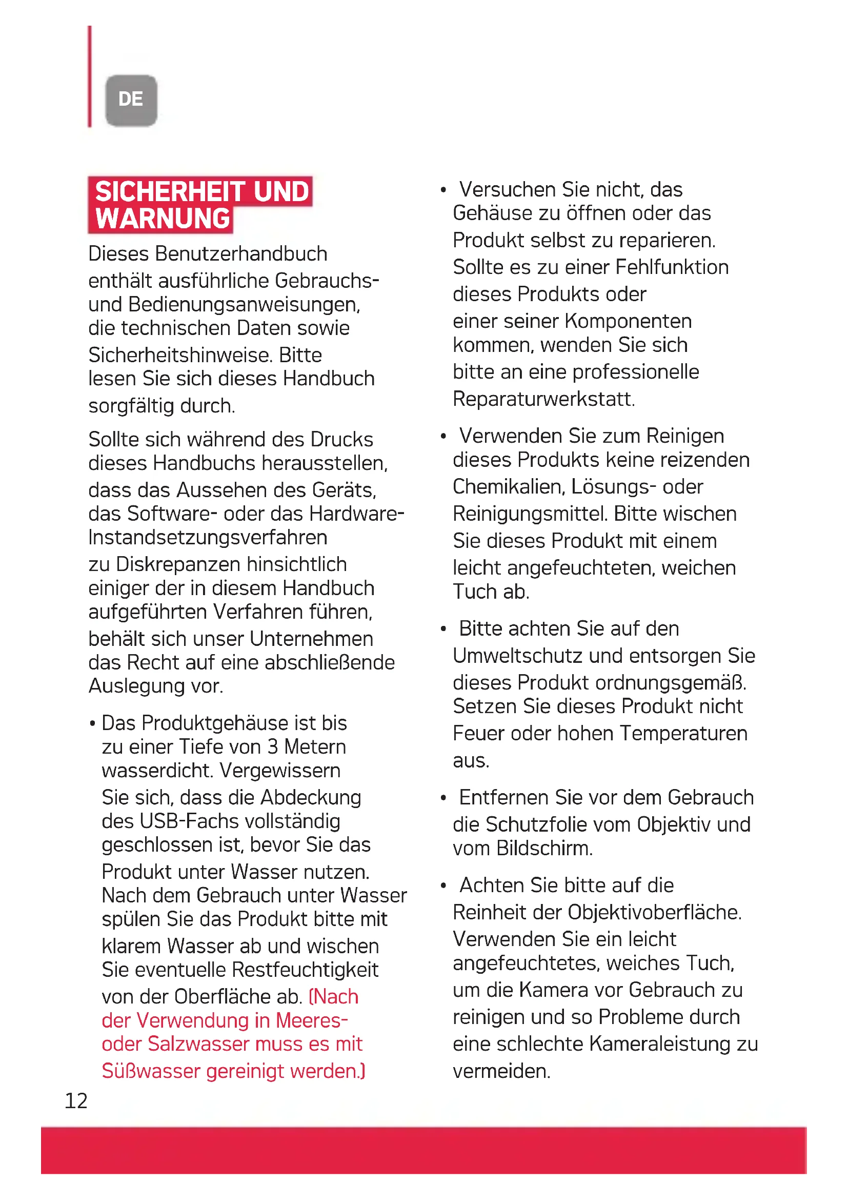 Das Produktgehäuse ist bis zu einer Tiefe von 3 Metern wasserdicht. Vergewissern Sie sich, dass die Abdeckung des USB-Fachs vollständig geschlossen ist, bevor Sie das Produkt unter Wasser nutzen. Nach dem Gebrauch unter Wasser spülen Sie das Produkt bitte mit klarem Wasser ab und wischen Sie eventuelle Restfeuchtigkeit von der Oberfläche ab. (Nach der Verwendung in Meeres- oder Salzwasser muss es mit Süßwasser gereinigt werden.)