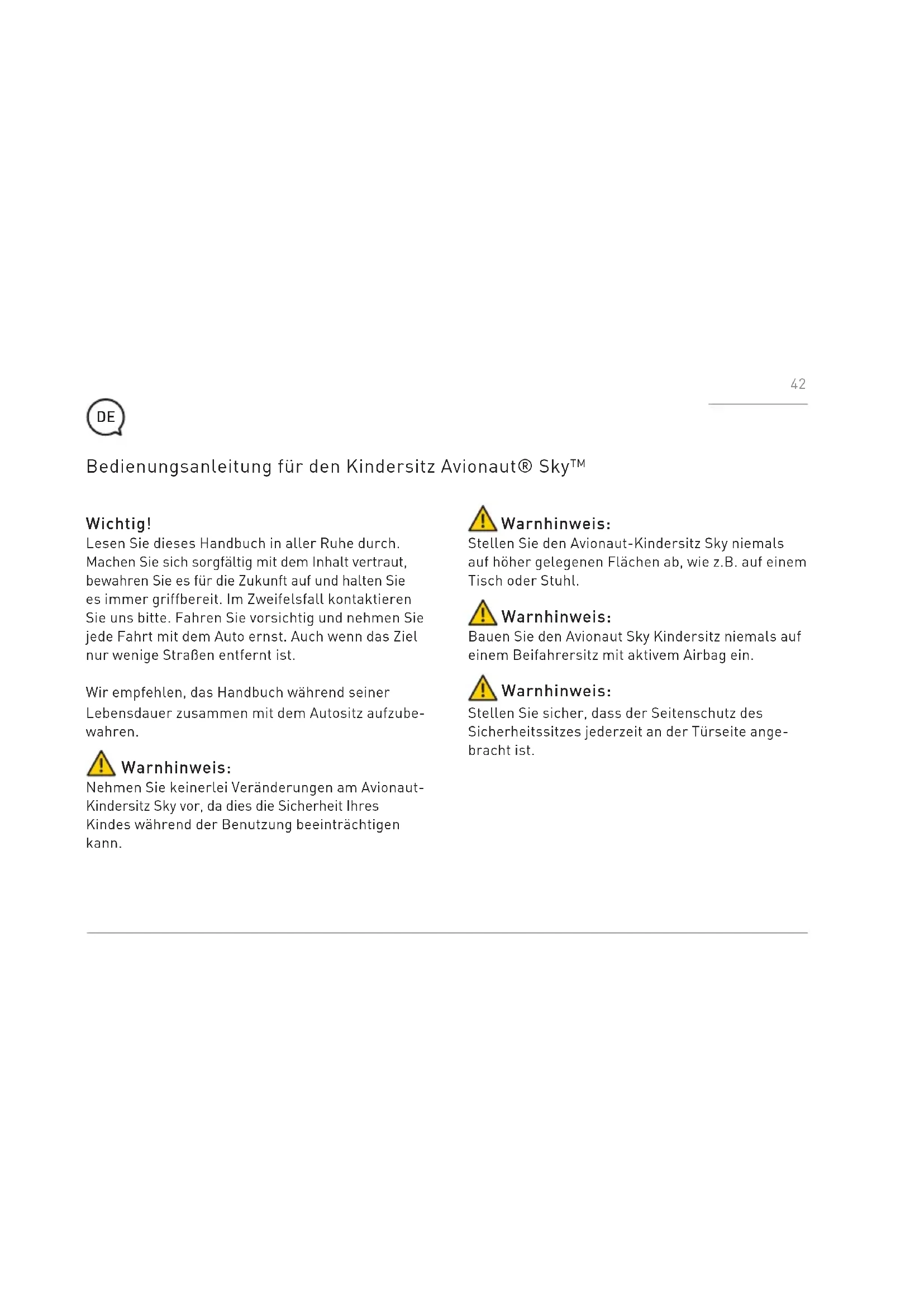 - Tato záruka byla připravená firmou KARWALA zaregistrovanou v Polsku. 40Adresa firmy: KARWALA Szarlejka, ul. Lukaszewicza 172 42-130 Wreczyca Wielka, Polska (1) Zakoupené výrobky sodstraněnými nebo změněnými štítky nebo identifikačními čísly se považují za neautorizované. V souvislosti s tím, že autentičnost takových výrobků nelze 41Wichtig! Lesen Sie dieses Handbuch in aller Ruhe durch. Machen Sie sich sorgfältig mit dem Inhalt vertraut, bewahren Sie es für die Zukunft auf und halten Sie es immer griffbereit. Im Zweifelsfall kontaktieren Sie uns bitte. Fahren Sie vorsichtig und nehmen Sie jede Fahrt mit dem Auto ernst. Auch wenn das Ziel nur wenige Straßen entfernt ist. Wir empfehlen, das Handbuch während seiner Lebensdauer zusammen mit dem Autositz aufzube- wahren. Warnhinweis: Nehmen Sie keinerlei Veränderungen am Avionaut- Kindersitz Sky vor, da dies die Sicherheit Ihres Kindes während der Benutzung beeinträchtigen kann. Bedienungsanleitung für den Kindersitz Avionaut® Sky™ Warnhinweis: Stellen Sie den Avionaut-Kindersitz Sky niemals auf höher gelegenen Flächen ab, wie z.B. auf einem Tisch oder Stuhl. Warnhinweis: Bauen Sie den Avionaut Sky Kindersitz niemals auf einem Beifahrersitz mit aktivem Airbag ein. Warnhinweis: Stellen Sie sicher, dass der Seitenschutz des Sicherheitssitzes jederzeit an der Türseite ange- bracht ist.