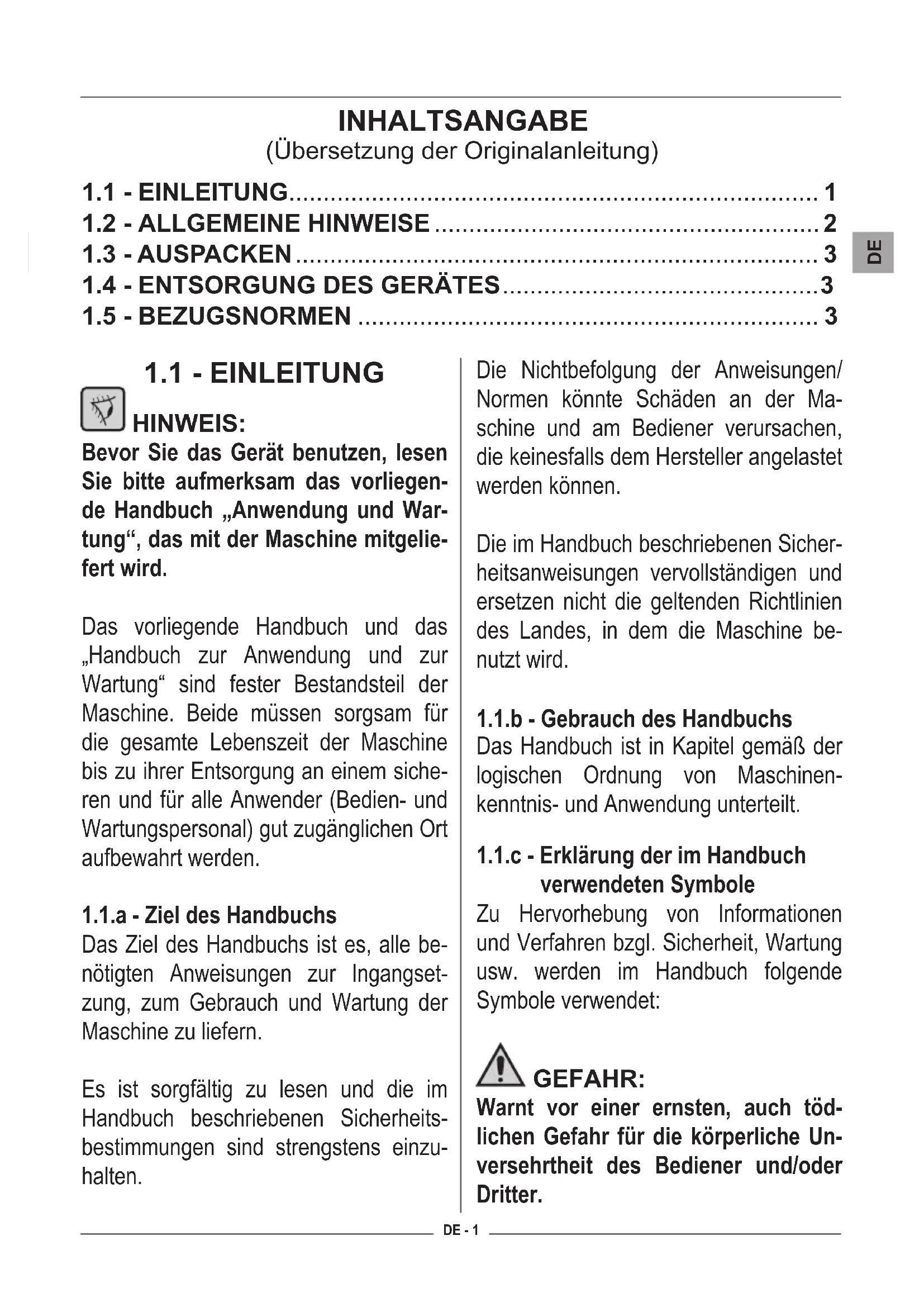 HINWEIS: Bevor Sie das Gerät benutzen, lesen Sie bitte aufmerksam das vorliegen- de Handbuch „Anwendung und War- tung“, das mit der Maschine mitgelie- fert wird. Das vorliegende Handbuch und das „Handbuch zur Anwendung und zur Wartung“ sind fester Bestandsteil der Maschine. Beide müssen sorgsam für die gesamte Lebenszeit der Maschine bis zu ihrer Entsorgung an einem siche- ren und für alle Anwender (Bedien- und Wartungspersonal) gut zugänglichen Ort aufbewahrt werden.