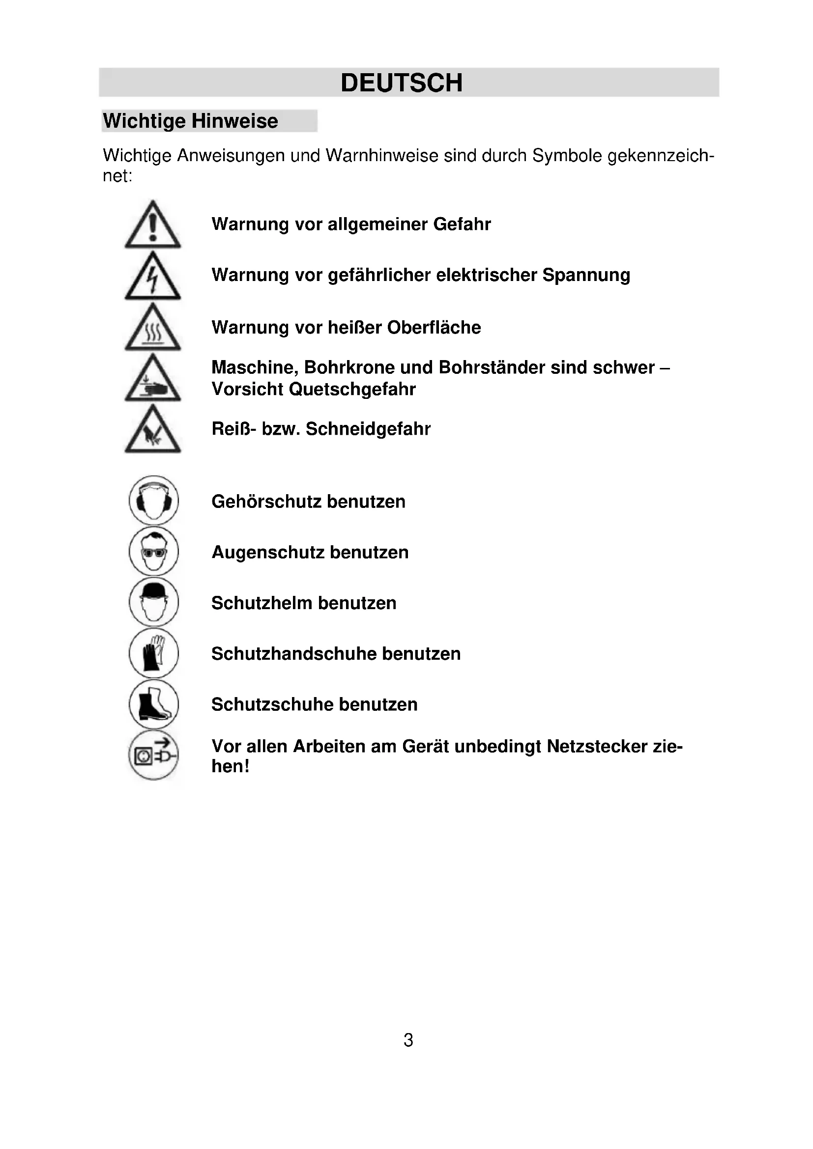 Für den Betrieb der Kernbohrmaschine sind deren Be- dienungsanleitung und die zugehörigen Sicherheitshin- weise strikt zu beachten!