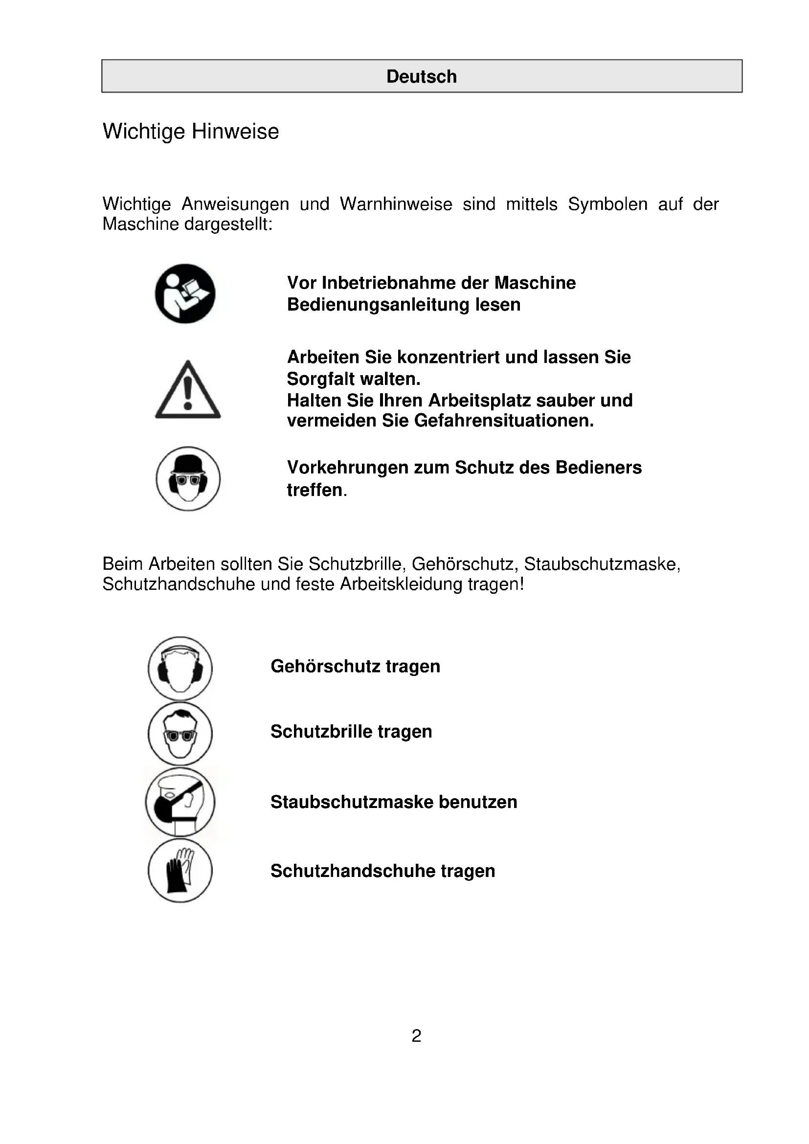 Beim Arbeiten sollten Sie Schutzbrille, Gehörschutz, Staubschutzmaske, Schutzhandschuhe und feste Arbeitskleidung tragen!