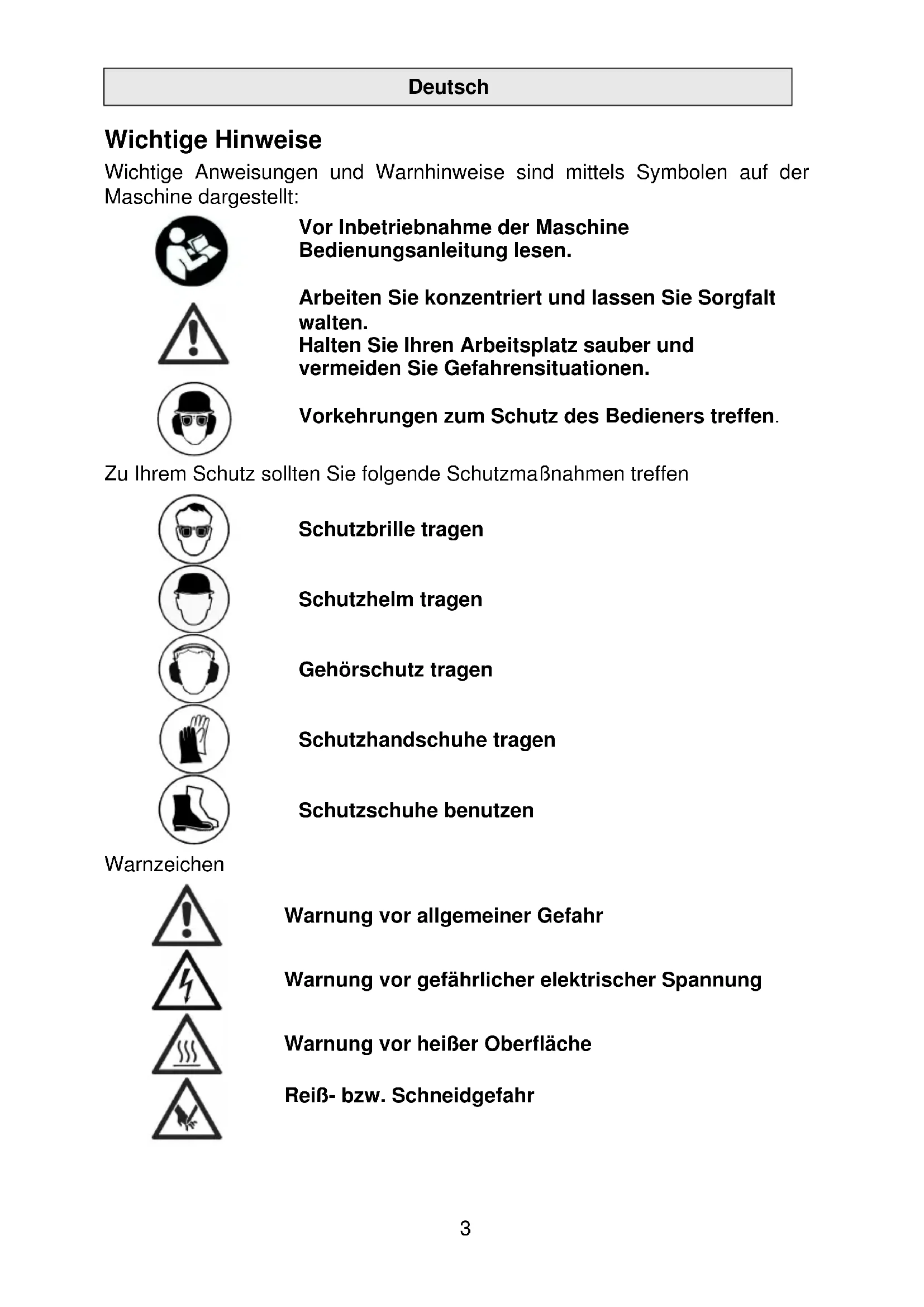 GB23 Deutsch Wichtige Hinweise Wichtige Anweisungen und Warnhinweise sind mittels Symbolen auf der Maschine dargestellt: