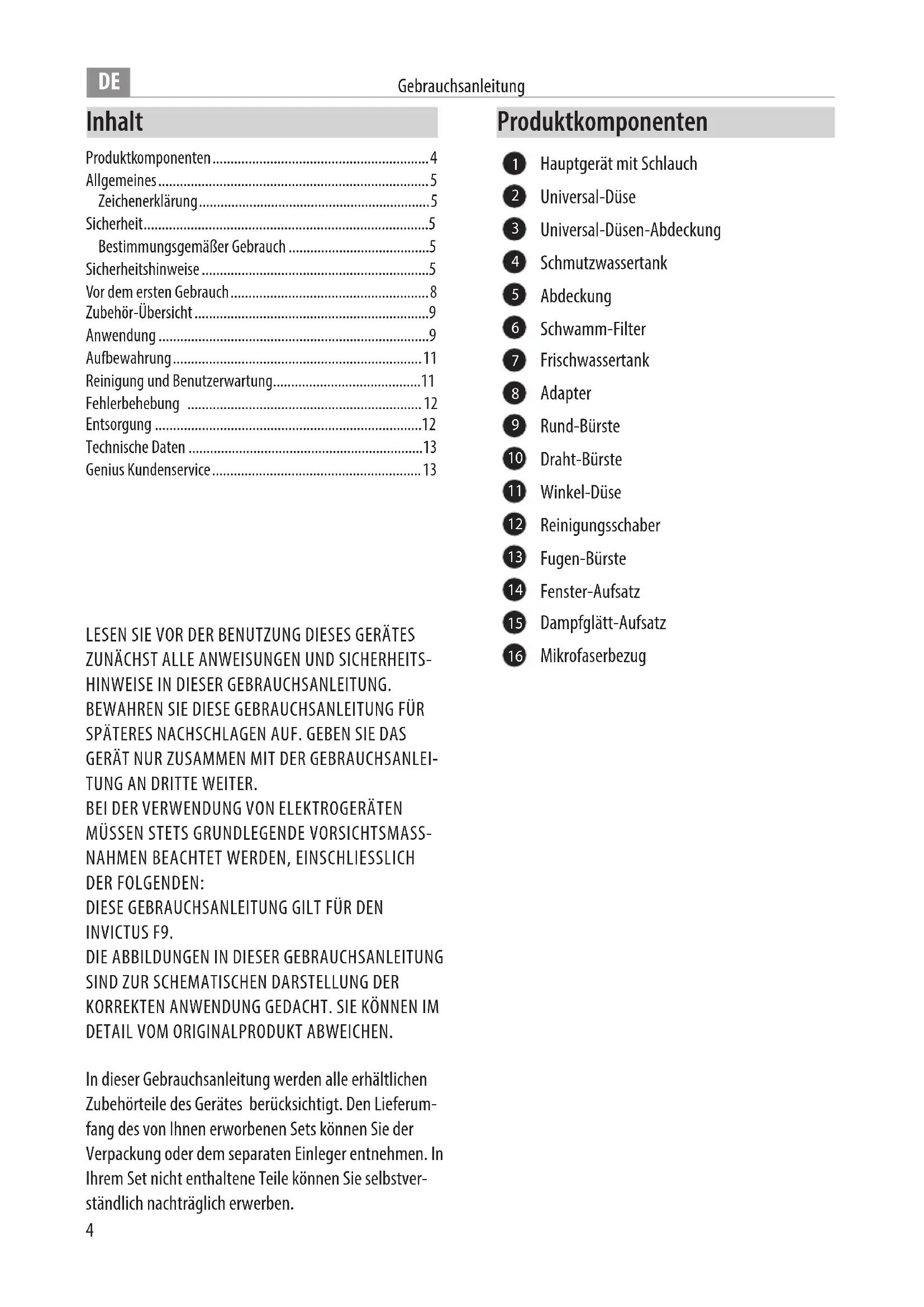 Technische Daten Gerät INVICTUS F9 Modell INVSC-F9 Abmessungen 350 x 325 x 225 mm Stromversorgung 220-240V Leistung 2000 W Volumen Frischwassertank 1600 ml Volumen Schmutzwassertank 1300 ml Genius Kundenservice Einfach den QR-Code scannen und alle Service-Informationen auf einen Blick erhalten! Alternativ können Sie sich auch telefonisch an den Kundenservice wenden: +49 (0) 6431 9 21 96 00 Entsorgung (Anwendbar in der Europäischen Union und anderen europäischen Staaten mit Systemen zur getrennten Sammlung von Wertstoen) Altgeräte dürfen nicht in den Hausmüll! Sollte das Gerät einmal nicht mehr benutzt werden können, so ist jeder Verbraucher gesetzlich verpichtet, Altgeräte getrennt vom Hausmüll, z. B. bei einer Sammelstelle seiner Gemeinde/seines Stadtteils, abzugeben. Damit wird gewährleistet, dass Altgeräte fachgerecht verwertet und negative Auswirkungen auf die Umwelt vermieden werden. Deswegen sind Elektrogeräte mit dem hier abgebildeten Symbol gekennzeichnet. Tragen auch Sie mit der ordnungsgemäßen Entsorgung Ihres Gerätes zum Schutz der Umwelt und der Gesundheit Ihrer Mitmenschen bei. Materialrecycling hilft, den Verbrauch von Rohstoen zu verringern. Weitere Informationen zu Entsorgung und Recycling dieses Gerätes erhalten Sie bei den kommunalen Entsorgungsbetrieben, dem Geschäft, in dem Sie das Produkt gekauft haben oder beim Hersteller. Mikrofaserbezug: 100% Baumwolle14