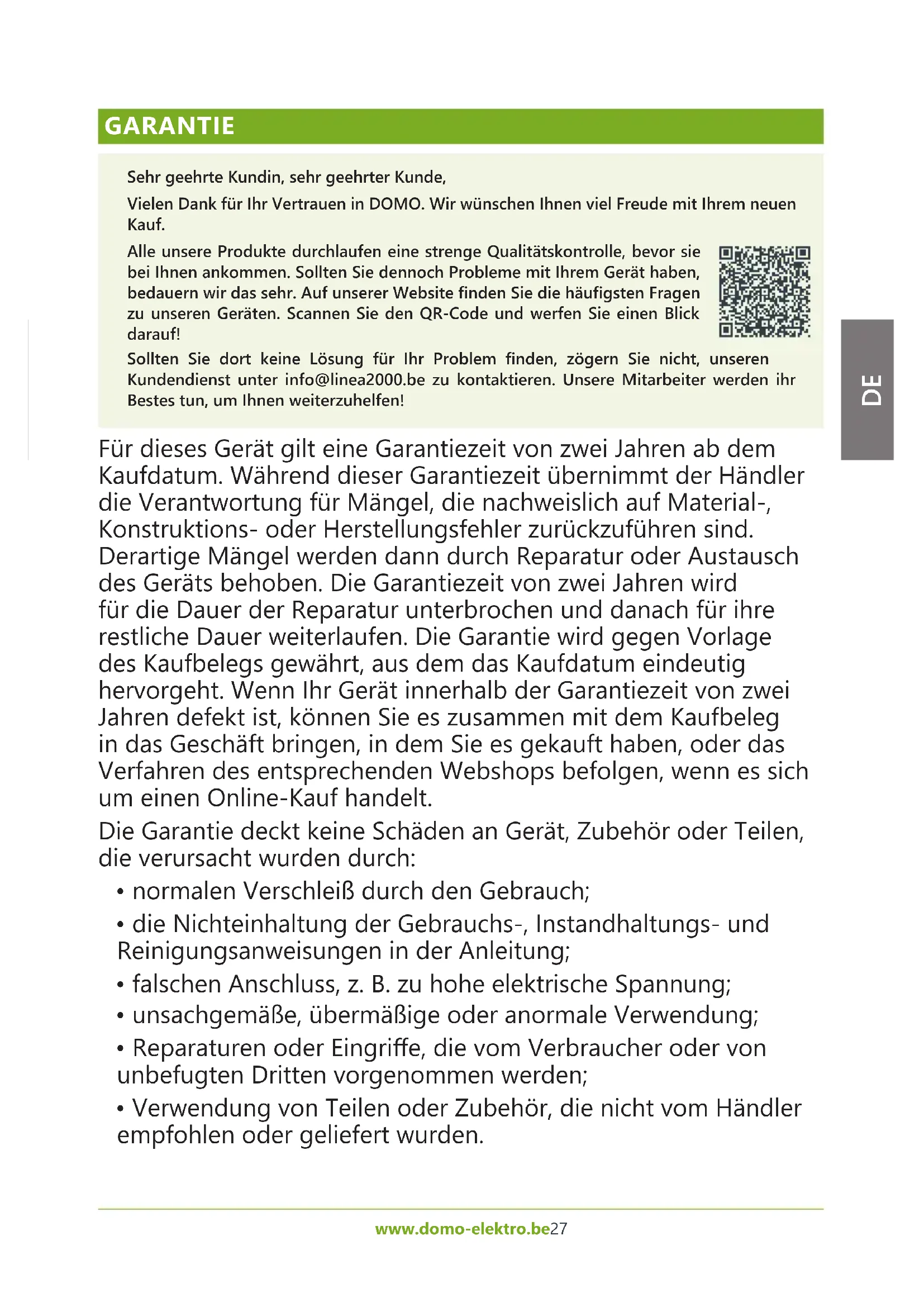 GARANTIE Sehr geehrte Kundin, sehr geehrter Kunde, Vielen Dank für Ihr Vertrauen in DOMO. Wir wünschen Ihnen viel Freude mit Ihrem neuen Kauf. Alle unsere Produkte durchlaufen eine strenge Qualitätskontrolle, bevor sie bei Ihnen ankommen. Sollten Sie dennoch Probleme mit Ihrem Gerät haben, bedauern wir das sehr. Auf unserer Website nden Sie die häugsten Fragen zu unseren Geräten. Scannen Sie den QR-Code und werfen Sie einen Blick darauf! Sollten Sie dort keine Lösung für Ihr Problem nden, zögern Sie nicht, unseren Kundendienst unter info@linea2000.be zu kontaktieren. Unsere Mitarbeiter werden ihr Bestes tun, um Ihnen weiterzuhelfen! Für dieses Gerät gilt eine Garantiezeit von zwei Jahren ab dem Kaufdatum. Während dieser Garantiezeit übernimmt der Händler die Verantwortung für Mängel, die nachweislich auf Material-, Konstruktions- oder Herstellungsfehler zurückzuführen sind. Derartige Mängel werden dann durch Reparatur oder Austausch des Geräts behoben. Die Garantiezeit von zwei Jahren wird für die Dauer der Reparatur unterbrochen und danach für ihre restliche Dauer weiterlaufen. Die Garantie wird gegen Vorlage des Kaufbelegs gewährt, aus dem das Kaufdatum eindeutig hervorgeht. Wenn Ihr Gerät innerhalb der Garantiezeit von zwei Jahren defekt ist, können Sie es zusammen mit dem Kaufbeleg in das Geschäft bringen, in dem Sie es gekauft haben, oder das Verfahren des entsprechenden Webshops befolgen, wenn es sich um einen Online-Kauf handelt. Die Garantie deckt keine Schäden an Gerät, Zubehör oder Teilen, die verursacht wurden durch: