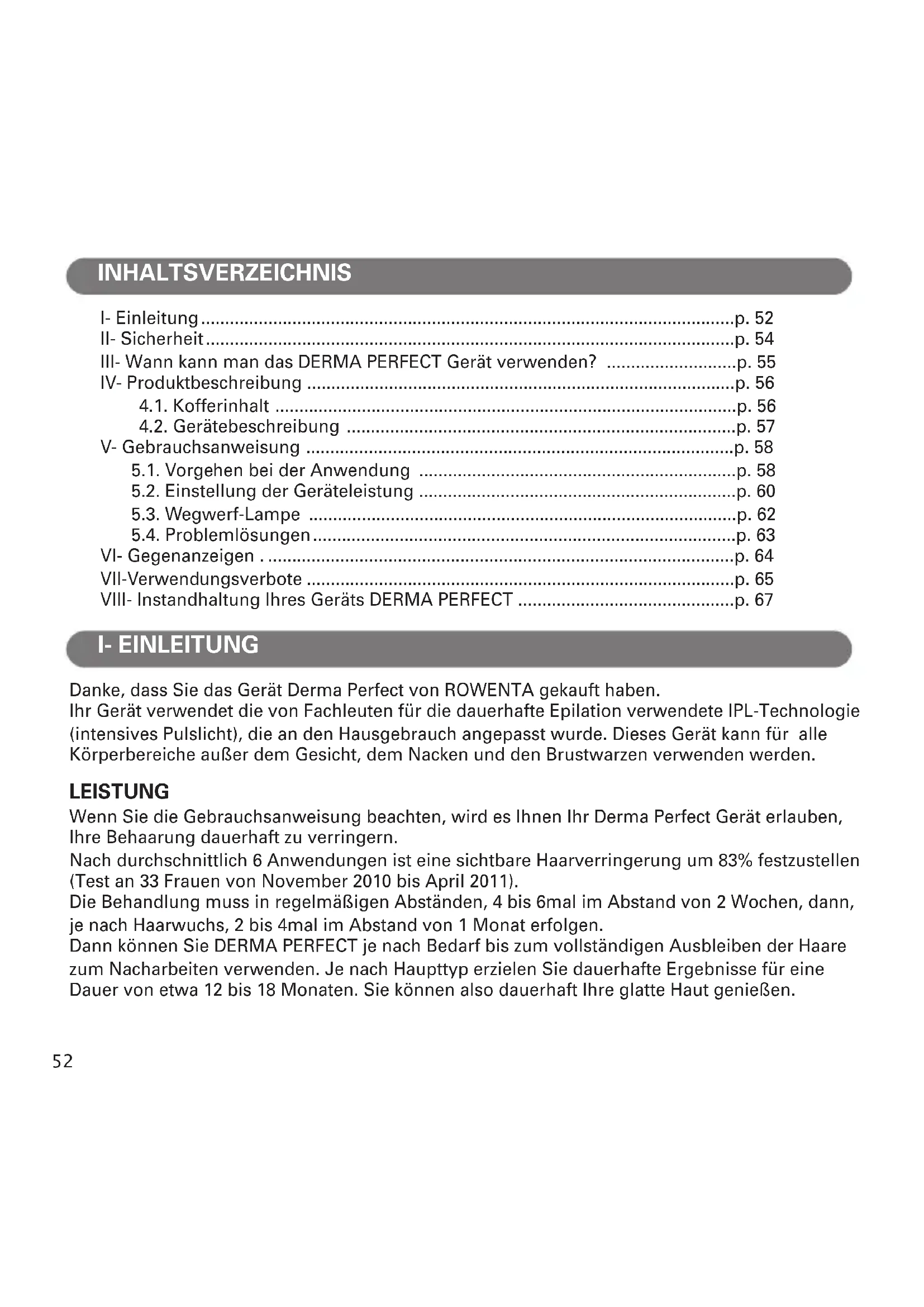 RO_EP9830_DERMA-PERFECT_1800122477_1800122477 03/02/12 15:52 Page51I- Einleitung...............................................................................................................p. 52 II- Sicherheit..............................................................................................................p. 54 III- Wann kann man das DERMA PERFECT Gerät verwenden? ...........................p. 55 IV- Produktbeschreibung .........................................................................................p. 56 4.1. Kofferinhalt ................................................................................................p. 56 4.2. Gerätebeschreibung .................................................................................p. 57 V- Gebrauchsanweisung .........................................................................................p. 58 5.1. Vorgehen bei der Anwendung ..................................................................p. 58 5.2. Einstellung der Geräteleistung ..................................................................p. 60 5.3. Wegwerf-Lampe .........................................................................................p. 62 5.4. Problemlösungen........................................................................................p. 63 VI- Gegenanzeigen ...................................................................................................p. 64 VII-Verwendungsverbote .........................................................................................p. 65 VIII- Instandhaltung Ihres Geräts DERMA PERFECT .............................................p. 67 Danke, dass Sie das Gerät Derma Perfect von ROWENTA gekauft haben. Ihr Gerät verwendet die von Fachleuten für die dauerhafte Epilation verwendete IPL-Technologie (intensives Pulslicht), die an den Hausgebrauch angepasst wurde. Dieses Gerät kann für alle Körperbereiche außer dem Gesicht, dem Nacken und den Brustwarzen verwenden werden. LEISTUNG Wenn Sie die Gebrauchsanweisung beachten, wird es Ihnen Ihr Derma Perfect Gerät erlauben, Ihre Behaarung dauerhaft zu verringern. Nach durchschnittlich 6 Anwendungen ist eine sichtbare Haarverringerung um 83% festzustellen (Test an 33 Frauen von November 2010 bis April 2011). Die Behandlung muss in regelmäßigen Abständen, 4 bis 6mal im Abstand von 2 Wochen, dann, je nach Haarwuchs, 2 bis 4mal im Abstand von 1 Monat erfolgen. Dann können Sie DERMA PERFECT je nach Bedarf bis zum vollständigen Ausbleiben der Haare zum Nacharbeiten verwenden. Je nach Haupttyp erzielen Sie dauerhafte Ergebnisse für eine Dauer von etwa 12 bis 18 Monaten. Sie können also dauerhaft Ihre glatte Haut genießen. INHALTSVERZEICHNIS I- EINLEITUNG