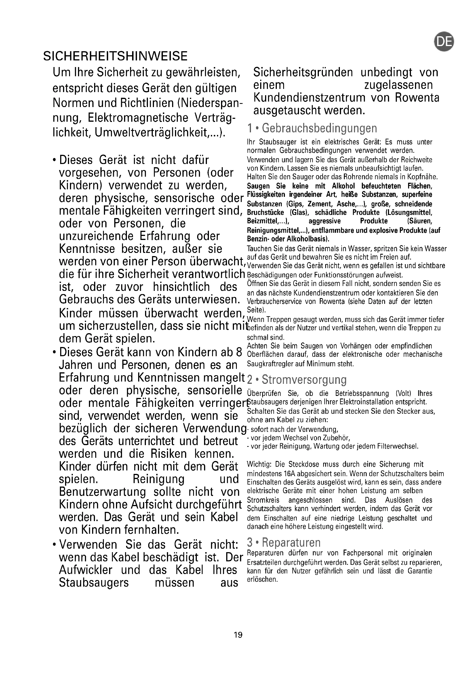 - Verwenden Sie das Gerät nicht: wenn das Kabel beschädigt ist. Der Aufwickler und das Kabel Ihres Staubsaugers müssen aus Sicherheitsgründen unbedingt von einem zugelassenen Kundendienstzentrum von Rowenta ausgetauscht werden. 1 • Gebrauchsbedingungen Ihr Staubsauger ist ein elektrisches Gerät: Es muss unter normalen Gebrauchsbedingungen verwendet werden. Verwenden und lagern Sie das Gerät außerhalb der Reichweite von Kindern. Lassen Sie es niemals unbeaufsichtigt laufen. Halten Sie den Sauger oder das Rohrende niemals in Kopfnähe. Saugen Sie keine mit Alkohol befeuchteten Flächen, Flüssigkeiten irgendeiner Art, heiße Substanzen, superfeine Substanzen (Gips, Zement, Asche,…), große, schneidende Bruchstücke (Glas), schädliche Produkte (Lösungsmittel, Beizmittel,…), aggressive Produkte (Säuren, Reinigungsmittel,...), entflammbare und explosive Produkte (auf Benzin- oder Alkoholbasis). Tauchen Sie das Gerät niemals in Wasser, spritzen Sie kein Wasser auf das Gerät und bewahren Sie es nicht im Freien auf. Verwenden Sie das Gerät nicht, wenn es gefallen ist und sichtbare Beschädigungen oder Funktionsstörungen aufweist. Öffnen Sie das Gerät in diesem Fall nicht, sondern senden Sie es an das nächste Kundendienstzentrum oder kontaktieren Sie den Verbraucherservice von Rowenta (siehe Daten auf der letzten Seite). Wenn Treppen gesaugt werden, muss sich das Gerät immer tiefer befinden als der Nutzer und vertikal stehen, wenn die Treppen zu schmal sind. Achten Sie beim Saugen von Vorhängen oder empfindlichen Oberflächen darauf, dass der elektronische oder mechanische Saugkraftregler auf Minimum steht. 2 • Stromversorgung Überprüfen Sie, ob die Betriebsspannung (Volt) Ihres Staubsaugers derjenigen Ihrer Elektroinstallation entspricht. Schalten Sie das Gerät ab und stecken Sie den Stecker aus, ohne am Kabel zu ziehen: - sofort nach der Verwendung, - vor jedem Wechsel von Zubehör, - vor jeder Reinigung, Wartung oder jedem Filterwechsel. Wichtig: Die Steckdose muss durch eine Sicherung mit mindestens 16A abgesichert sein. Wenn der Schutzschalters beim Einschalten des Geräts ausgelöst wird, kann es sein, dass andere elektrische Geräte mit einer hohen Leistung am selben Stromkreis angeschlossen sind. Das Auslösen des Schutzschalters kann verhindert werden, indem das Gerät vor dem Einschalten auf eine niedrige Leistung geschaltet und danach eine höhere Leistung eingestellt wird. 3 • Reparaturen Reparaturen dürfen nur von Fachpersonal mit originalen Ersatzteilen durchgeführt werden. Das Gerät selbst zu reparieren, kann für den Nutzer gefährlich sein und lässt die Garantie erlöschen. SICHERHEITSHINWEISE