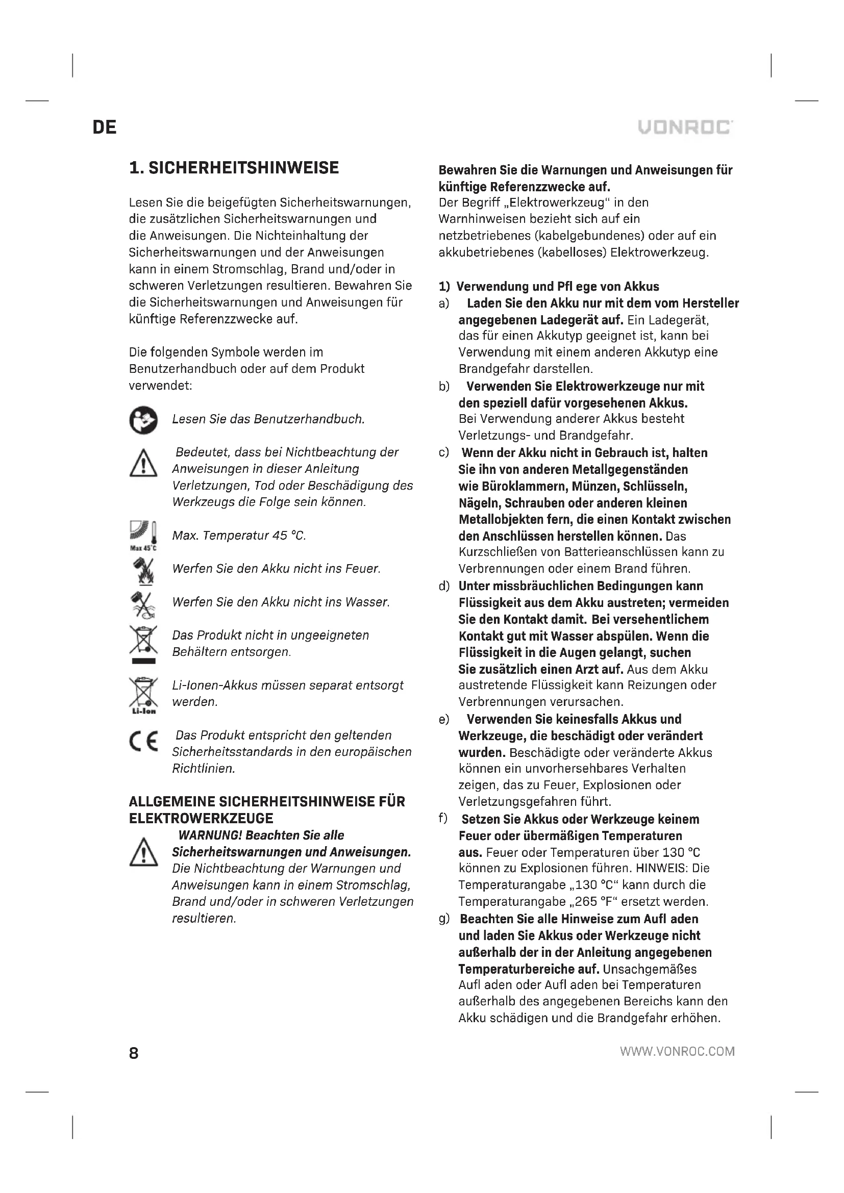 Lesen Sie die beigefügten Sicherheitswarnungen, die zusätzlichen Sicherheitswarnungen und die Anweisungen. Die Nichteinhaltung der Sicherheitswarnungen und der Anweisungen kann in einem Stromschlag, Brand und/oder in schweren Verletzungen resultieren. Bewahren Sie die Sicherheitswarnungen und Anweisungen für künftige Referenzzwecke auf. Die folgenden Symbole werden im Benutzerhandbuch oder auf dem Produkt verwendet: Lesen Sie das Benutzerhandbuch. Bedeutet, dass bei Nichtbeachtung der Anweisungen in dieser Anleitung Verletzungen, Tod oder Beschädigung des Werkzeugs die Folge sein können. Max. Temperatur 45 °C. Werfen Sie den Akku nicht ins Feuer. Werfen Sie den Akku nicht ins Wasser. Das Produkt nicht in ungeeigneten Behältern entsorgen. Li-Ionen-Akkus müssen separat entsorgt werden. Das Produkt entspricht den geltenden Sicherheitsstandards in den europäischen Richtlinien.