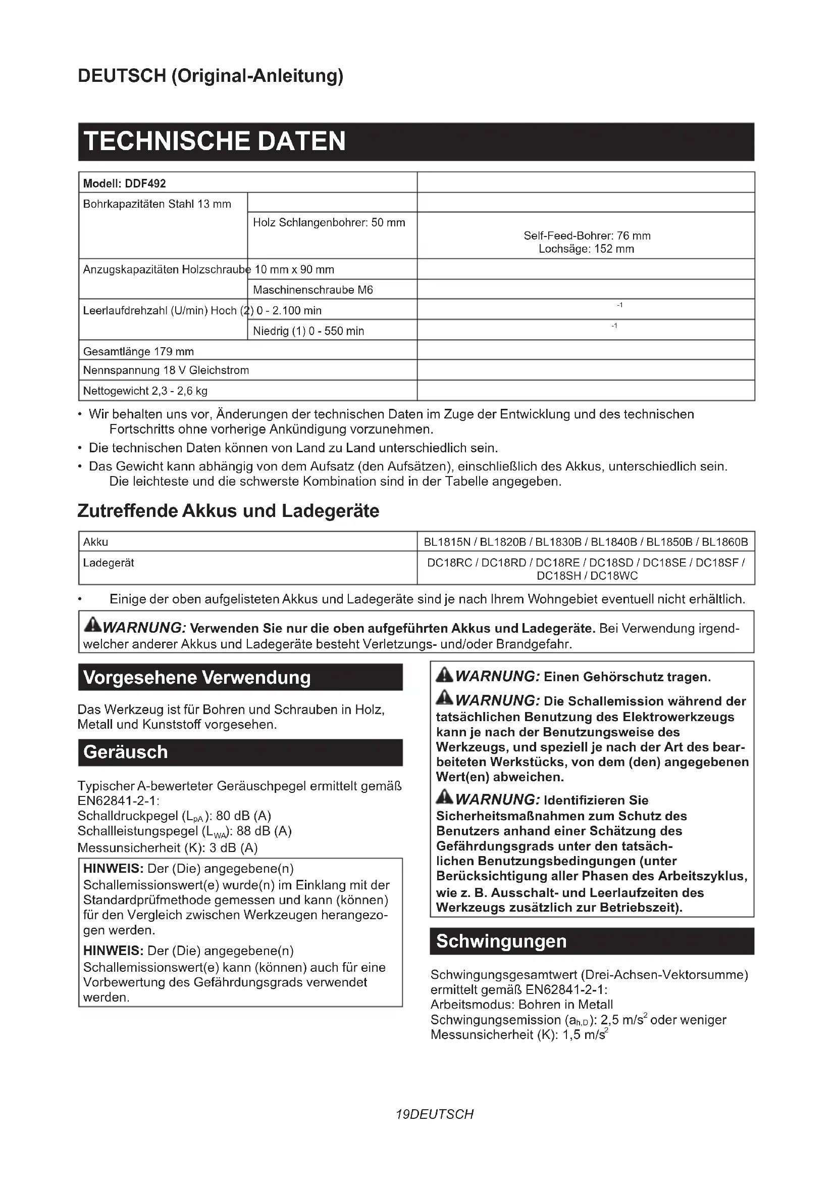 - EinigederobenaufgelistetenAkkusundLadegerätesindjenachIhremWohngebieteventuellnichterhältlich. WARNUNG: Verwenden Sie nur die oben aufgeführten Akkus und Ladegeräte. Bei Verwendung irgend- welcher anderer Akkus und Ladegeräte besteht Verletzungs- und/oder Brandgefahr. Vorgesehene Verwendung Das Werkzeug ist für Bohren und Schrauben in Holz, MetallundKunststovorgesehen. Geräusch TypischerA-bewerteterGeräuschpegelermitteltgemäß EN62841-2-1: Schalldruckpegel (L