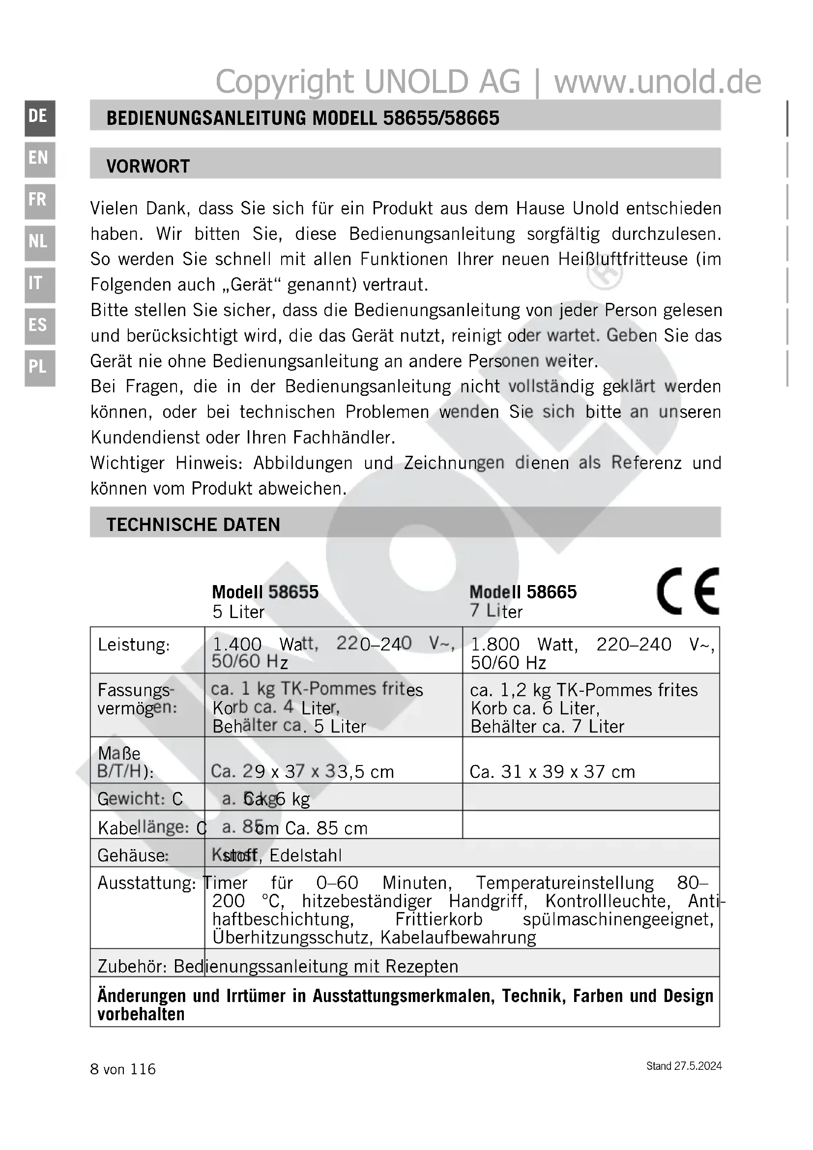 50/60 Hz Fassungs- vermögen: ca. 1 kg TK-Pommes frites Korb ca. 4 Liter, Behälter ca. 5 Liter ca. 1,2 kg TK-Pommes frites Korb ca. 6 Liter, Behälter ca. 7 Liter Maße B/T/H): Ca. 29 x 37 x 33,5 cm Ca. 31 x 39 x 37 cm Gewicht: Ca. 5 kg Ca. 6 kg Kabellänge: Ca. 85 cm Ca. 85 cm Gehäuse: Kunststoff, Edelstahl Ausstattung: Timer für 0–60 Minuten, Temperatureinstellung 80– 200 °C, hitzebeständiger Handgriff, Kontrollleuchte, Anti- haftbeschichtung, Frittierkorb spülmaschinengeeignet, Überhitzungsschutz, Kabelaufbewahrung Zubehör: Bedienungssanleitung mit Rezepten Änderungen und Irrtümer in Ausstattungsmerkmalen, Technik, Farben und Design vorbehalten Copyright UNOLD AG | www.unold.deStand 27.5.2024 9 von 116