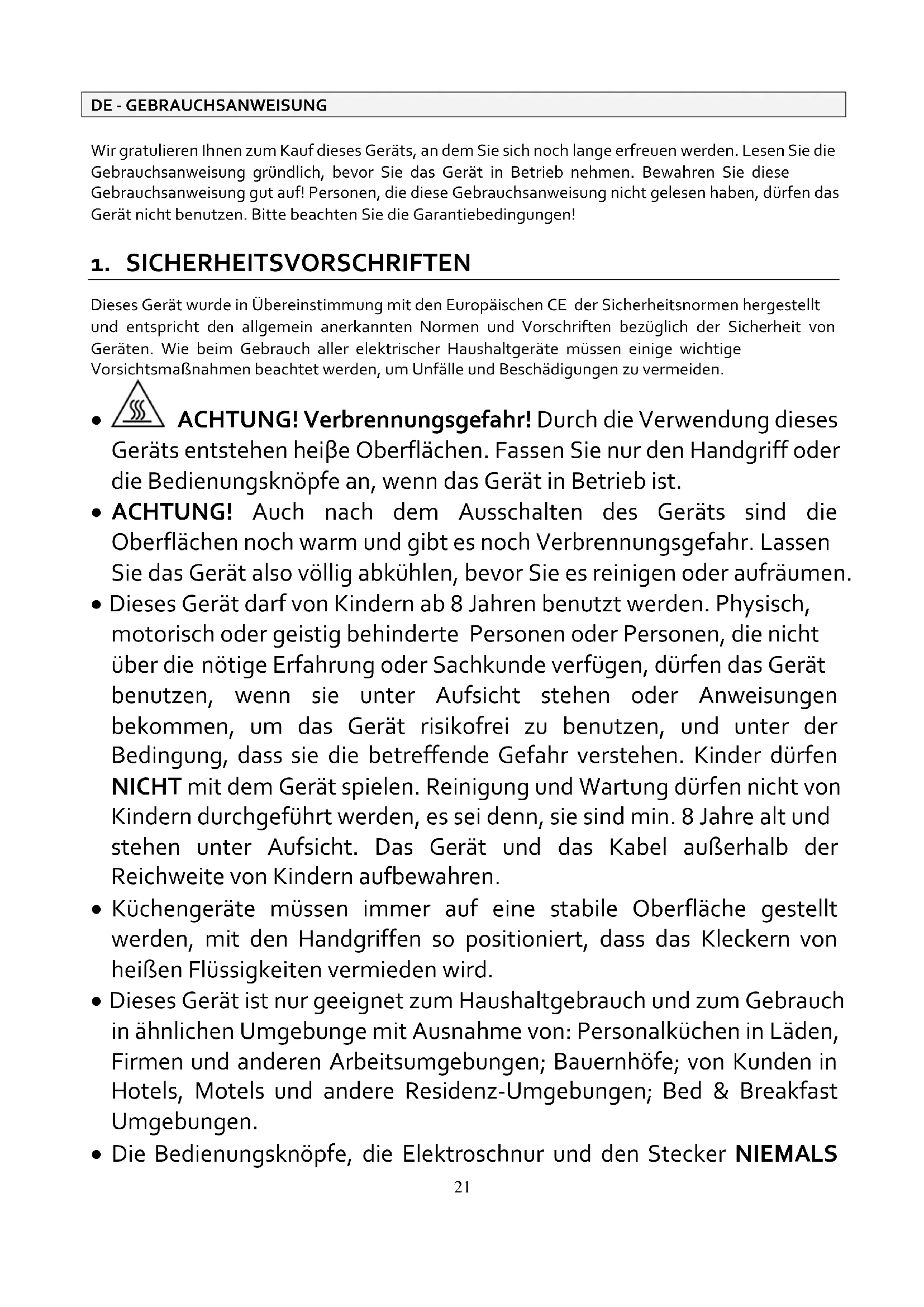 - ACHTUNG! Verbrennungsgefahr! Durch die Verwendung dieses Geräts entstehen heiβe Oberflächen. Fassen Sie nur den Handgriff oder die Bedienungsknöpfe an, wenn das Gerät in Betrieb ist.