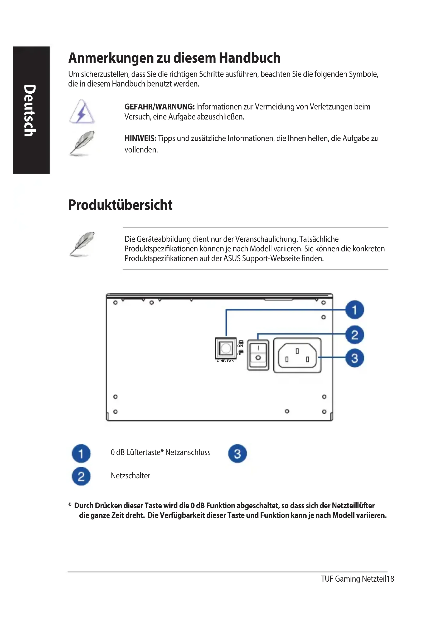 Cet appareil et ses accessoires se recyclentTUF Gaming Netzteil18 Deutsch Deutsch Anmerkungen zu diesem Handbuch Um sicherzustellen, dass Sie die richtigen Schritte ausführen, beachten Sie die folgenden Symbole, die in diesem Handbuch benutzt werden. GEFAHR/WARNUNG: Informationen zur Vermeidung von Verletzungen beim Versuch, eine Aufgabe abzuschließen. HINWEIS: Tipps und zusätzliche Informationen, die Ihnen helfen, die Aufgabe zu vollenden. Produktübersicht O dB Fan