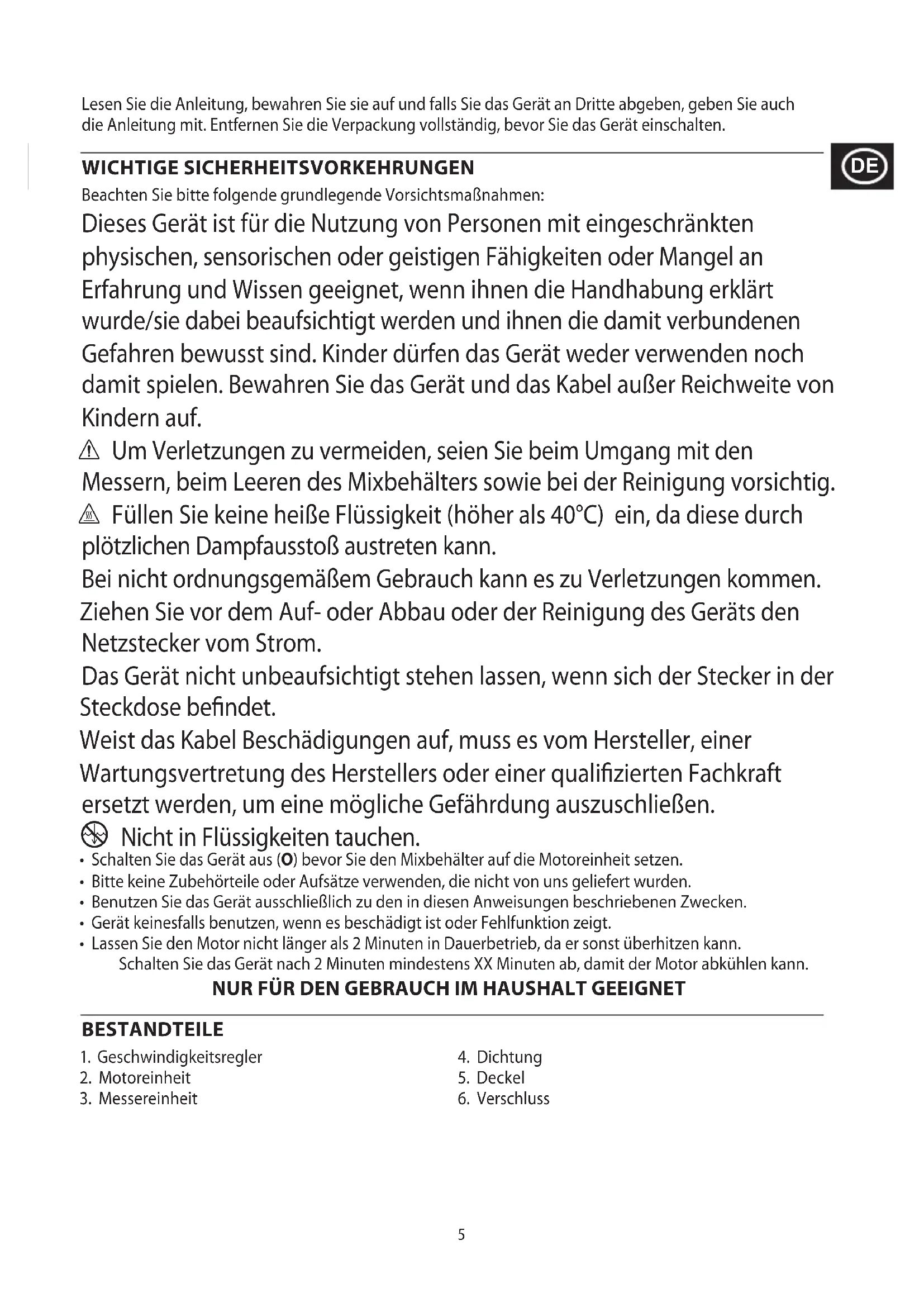 - Lassen Sie den Motor nicht länger als 2 Minuten in Dauerbetrieb, da er sonst überhitzen kann. Schalten Sie das Gerät nach 2 Minuten mindestens XX Minuten ab, damit der Motor abkühlen kann. NUR FÜR DEN GEBRAUCH IM HAUSHALT GEEIGNET BESTANDTEILE