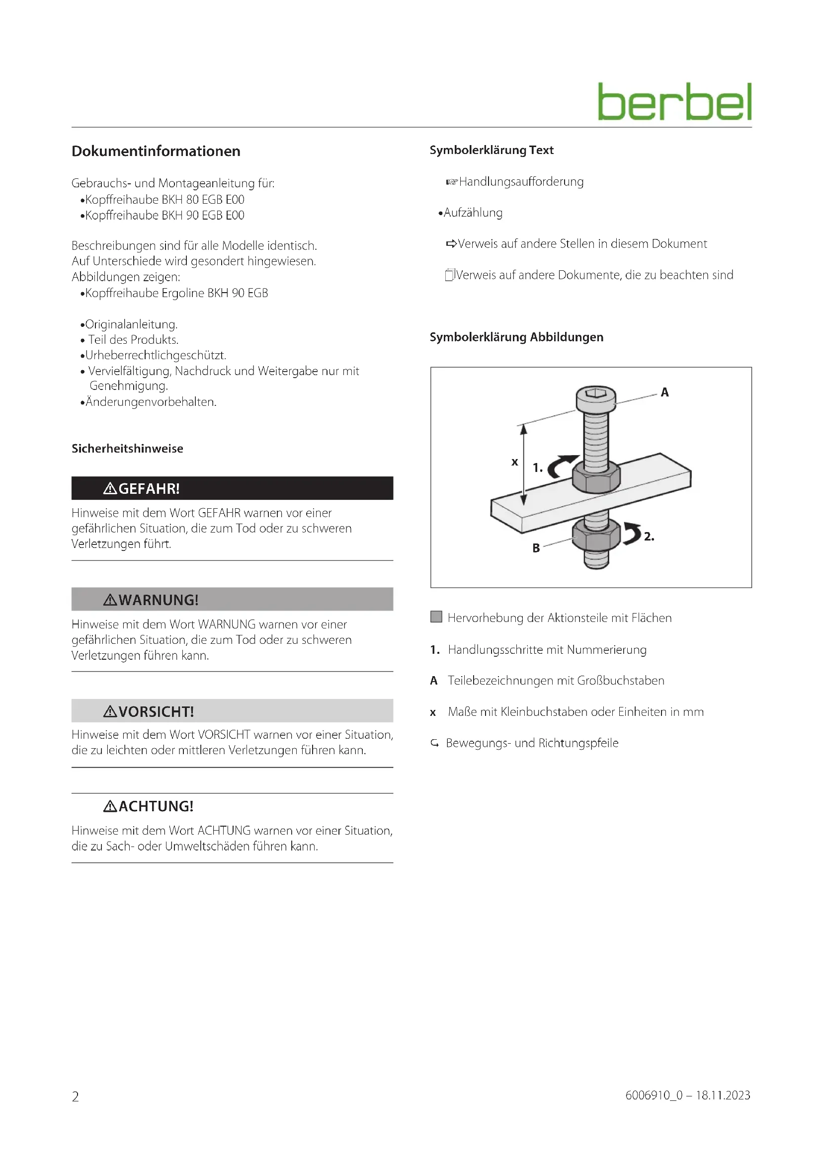 Operating and installation instructions for the models / BKH 80 EGB / BKH 90 EGB 6006910_02 6006910_0 – 18.11.2023 Dokumentinformationen Gebrauchs- und Montageanleitung für: 2 Kopffreihaube BKH 80 EGB E00 2 Kopffreihaube BKH 90 EGB E00 Beschreibungen sind für alle Modelle identisch. Auf Unterschiede wird gesondert hingewiesen. Abbildungen zeigen: 2 Kopffreihaube Ergoline BKH 90 EGB 2 Originalanleitung. 2 Teil des Produkts. 2 Urheberrechtlich geschützt. 2 Vervielfältigung, Nachdruck und Weitergabe nur mit Genehmigung. 2 Änderungen vorbehalten. Sicherheitshinweise . GEFAHR! Hinweise mit dem Wort GEFAHR warnen vor einer gefährlichen Situation, die zum Tod oder zu schweren Verletzungen führt. . WARNUNG! Hinweise mit dem Wort WARNUNG warnen vor einer gefährlichen Situation, die zum Tod oder zu schweren Verletzungen führen kann. . VORSICHT! Hinweise mit dem Wort VORSICHT warnen vor einer Situation, die zu leichten oder mittleren Verletzungen führen kann. . ACHTUNG! Hinweise mit dem Wort ACHTUNG warnen vor einer Situation, die zu Sach- oder Umweltschäden führen kann. Symbolerklärung Text 1 Handlungsaufforderung 2 Aufzählung , Verweis auf andere Stellen in diesem Dokument - Verweis auf andere Dokumente, die zu beachten sind Symbolerklärung Abbildungen