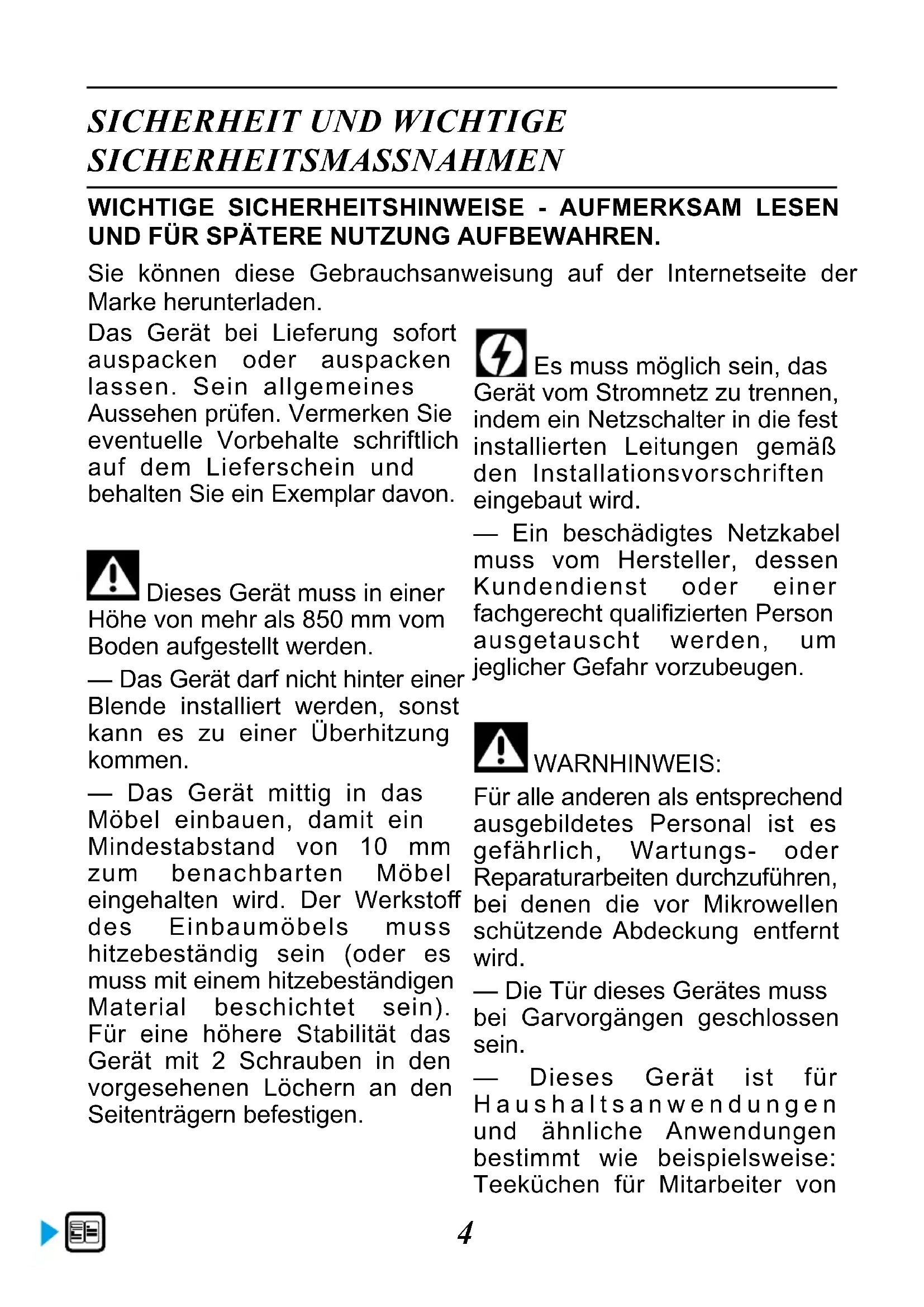 SICHERHEITSMASSNAHMEN Das Gerät bei Lieferung sofort auspacken oder auspacken lassen. Sein allgemeines Aussehen prüfen. Vermerken Sie eventuelle Vorbehalte schriftlich auf dem Lieferschein und behalten Sie ein Exemplar davon. Dieses Gerät muss in einer Höhe von mehr als 850 mm vom Boden aufgestellt werden. — Das Gerät darf nicht hinter einer Blende installiert werden, sonst kann es zu einer Überhitzung kommen. — Das Gerät mittig in das Möbel einbauen, damit ein Mindestabstand von 10 mm zum benachbarten Möbel eingehalten wird. Der Werksto des Einbaumöbels muss hitzebeständig sein (oder es muss mit einem hitzebeständigen Material beschichtet sein). Für eine höhere Stabilität das Gerät mit 2 Schrauben in den vorgesehenen Löchern an den Seitenträgern befestigen. Es muss möglich sein, das Gerät vom Stromnetz zu trennen, indem ein Netzschalter in die fest installierten Leitungen gemäß den Installationsvorschriften eingebaut wird. — Ein beschädigtes Netzkabel muss vom Hersteller, dessen Kundendienst oder einer fachgerecht qualizierten Person ausgetauscht werden, um jeglicher Gefahr vorzubeugen. WARNHINWEIS: Für alle anderen als entsprechend ausgebildetes Personal ist es gefährlich, Wartungs- oder Reparaturarbeiten durchzuführen, bei denen die vor Mikrowellen schützende Abdeckung entfernt wird. — Die Tür dieses Gerätes muss bei Garvorgängen geschlossen sein. — Dieses Gerät ist für Haushaltsanwendungen und ähnliche Anwendungen bestimmt wie beispielsweise: Teeküchen für Mitarbeiter von