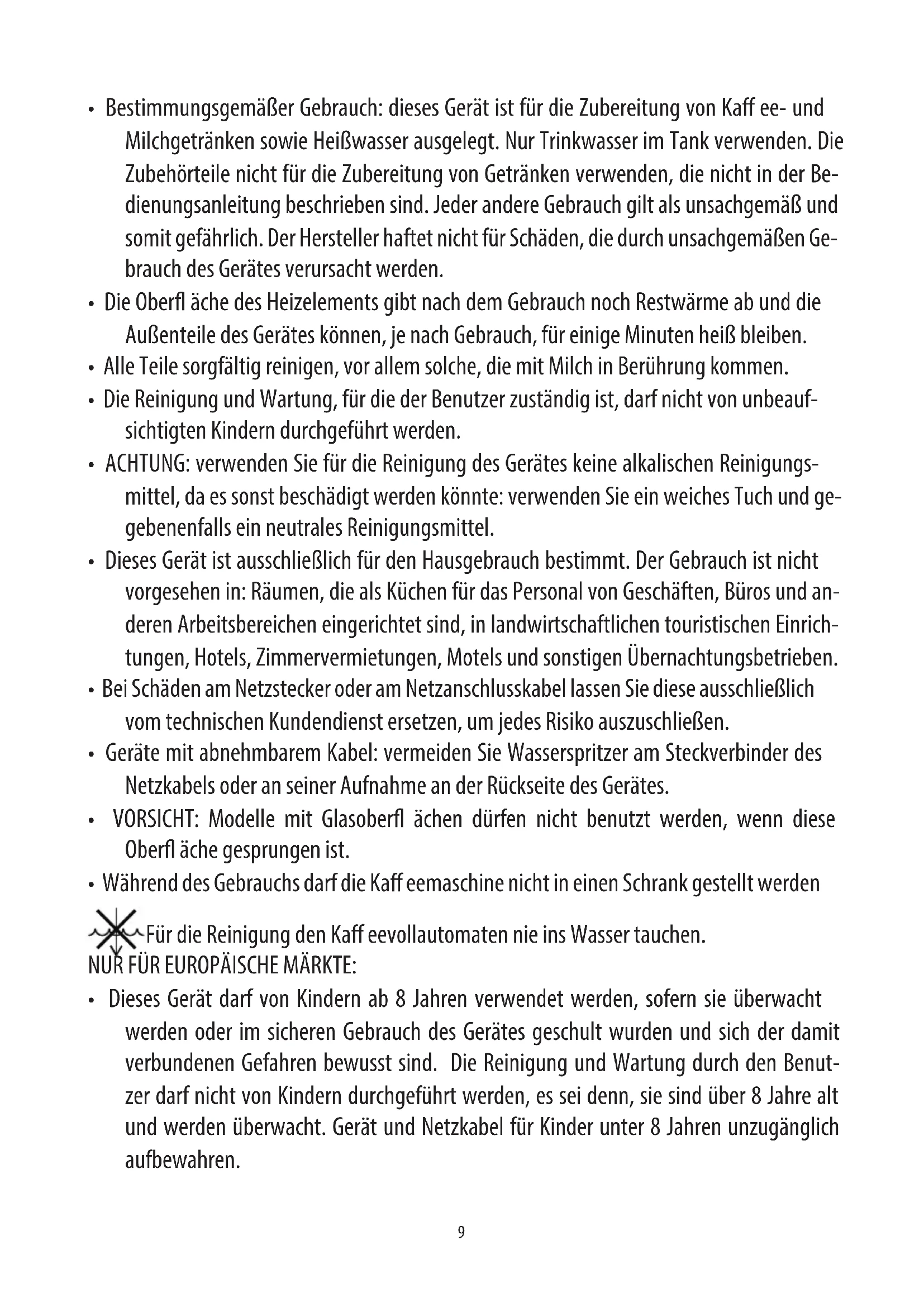 - Während des Gebrauchs darf die Ka eemaschine nicht in einen Schrank gestellt werden Für die Reinigung den Ka eevollautomaten nie ins Wasser tauchen. NUR FÜR EUROPÄISCHE MÄRKTE: