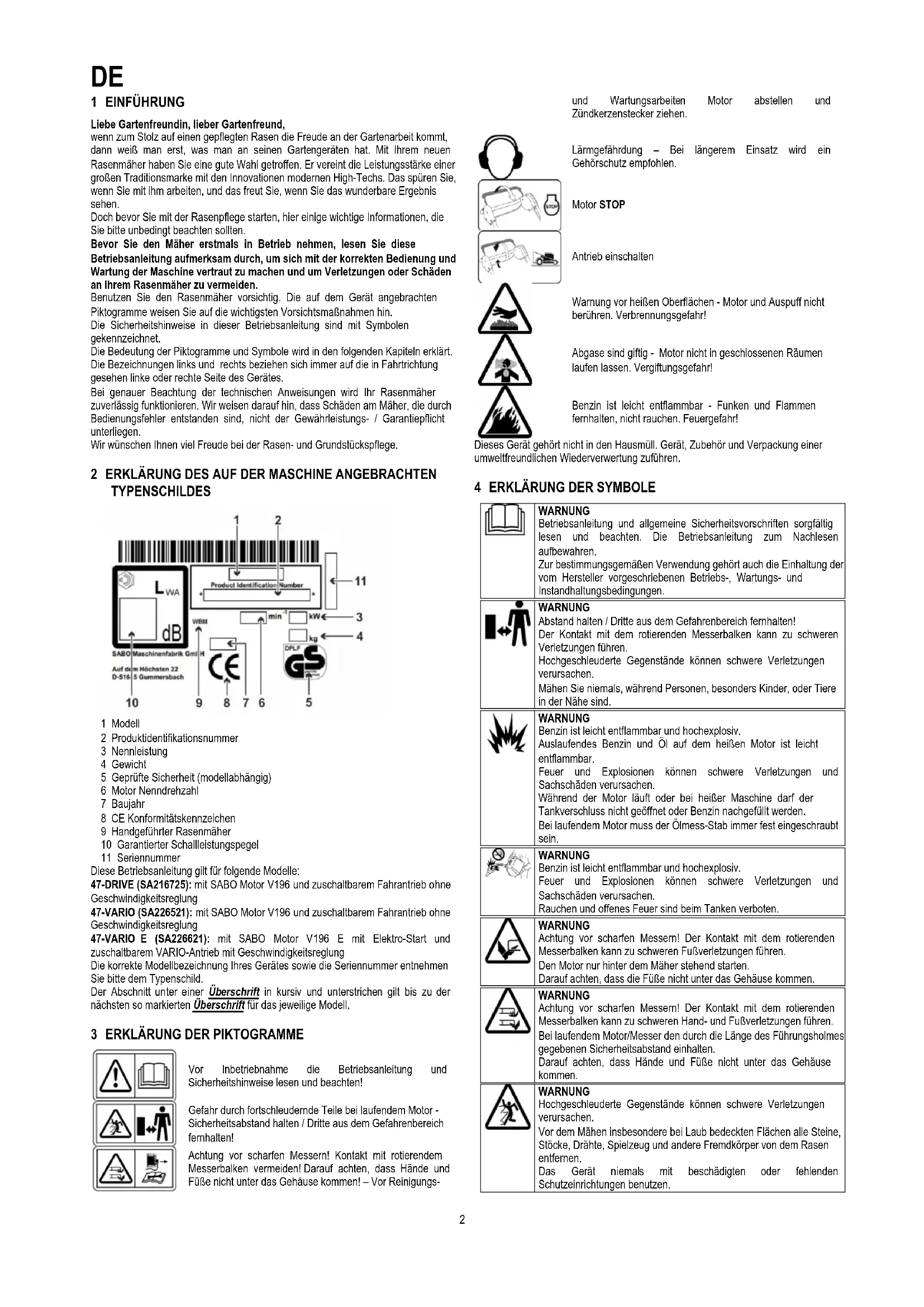 1 Modell 2 Produktidentifikationsnummer 3 Nennleistung 4 Gewicht 5 Geprüfte Sicherheit (modellabhängig) 6 Motor Nenndrehzahl 7 Baujahr 8 CE Konformitätskennzeichen 9 Handgeführter Rasenmäher 10 Garantierter Schallleistungspegel 11 Seriennummer Diese Betriebsanleitung gilt für folgende Modelle: 47-DRIVE (SA216725): mit SABO Motor V196 und zuschaltbarem Fahrantrieb ohne Geschwindigkeitsreglung 47-VARIO (SA226521): mit SABO Motor V196 und zuschaltbarem Fahrantrieb ohne Geschwindigkeitsreglung 47-VARIO E (SA226621): mit SABO Motor V196 E mit Elektro-Start und zuschaltbarem VARIO-Antrieb mit Geschwindigkeitsreglung Die korrekte Modellbezeichnung Ihres Gerätes sowie die Seriennummer entnehmen Sie bitte dem Typenschild. Der Abschnitt unter einer Überschrift in kursiv und unterstrichen gilt bis zu der nächsten so markierten Überschrift für das jeweilige Modell.