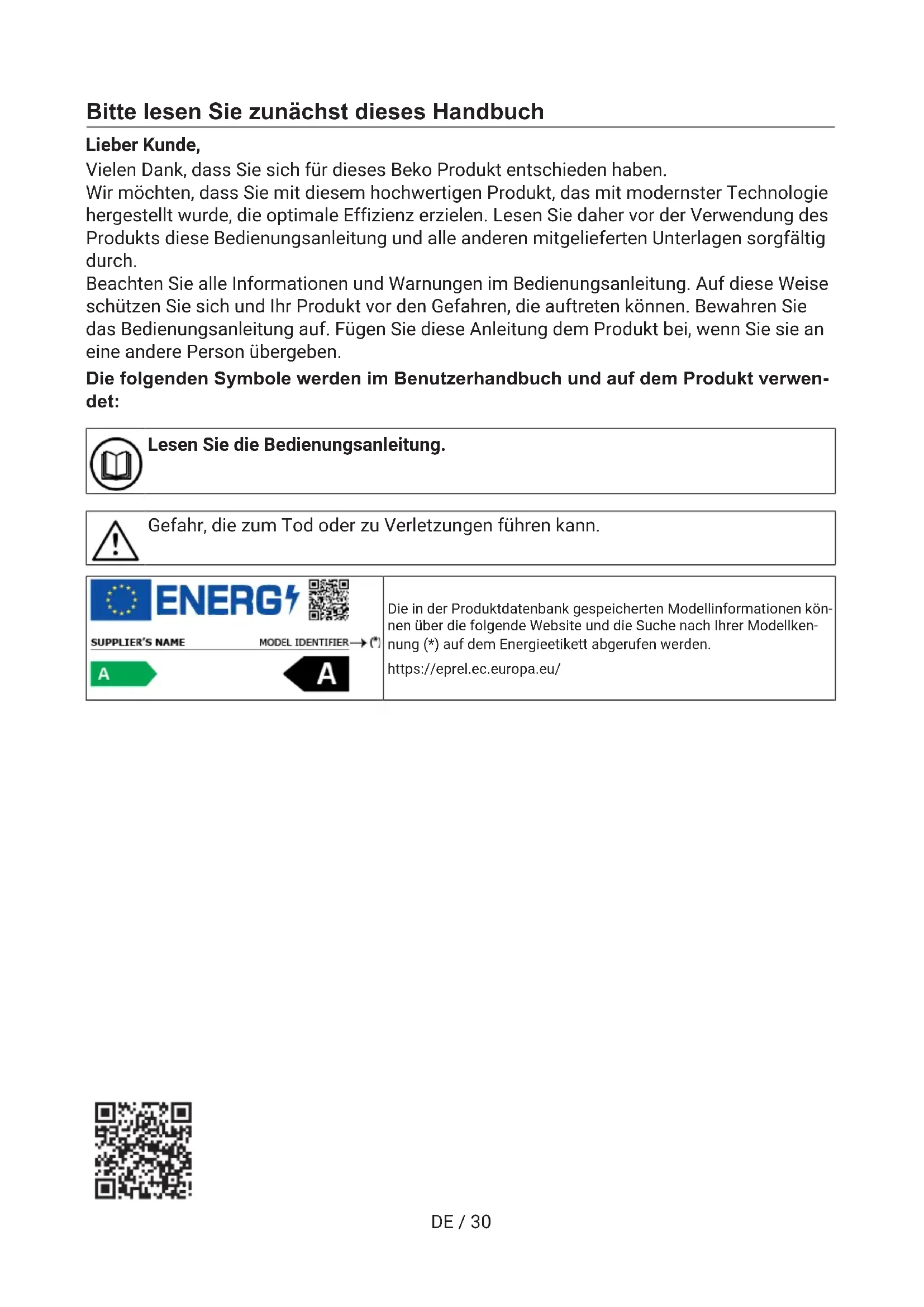 [}93]DE / 30 Bitte lesen Sie zunächst dieses Handbuch Lieber Kunde, Vielen Dank, dass Sie sich für dieses Beko Produkt entschieden haben. Wir möchten, dass Sie mit diesem hochwertigen Produkt, das mit modernster Technologie hergestellt wurde, die optimale Effizienz erzielen. Lesen Sie daher vor der Verwendung des Produkts diese Bedienungsanleitung und alle anderen mitgelieferten Unterlagen sorgfältig durch. Beachten Sie alle Informationen und Warnungen im Bedienungsanleitung. Auf diese Weise schützen Sie sich und Ihr Produkt vor den Gefahren, die auftreten können. Bewahren Sie das Bedienungsanleitung auf. Fügen Sie diese Anleitung dem Produkt bei, wenn Sie sie an eine andere Person übergeben. Die folgenden Symbole werden im Benutzerhandbuch und auf dem Produkt verwen- det: Lesen Sie die Bedienungsanleitung. Gefahr, die zum Tod oder zu Verletzungen führen kann. Die in der Produktdatenbank gespeicherten Modellinformationen kön- nen über die folgende Website und die Suche nach Ihrer Modellken- nung (*) auf dem Energieetikett abgerufen werden. https://eprel.ec.europa.eu/DE / 31 Inhaltsverzeichnis 1 Sicherheitshinweise....................... 32