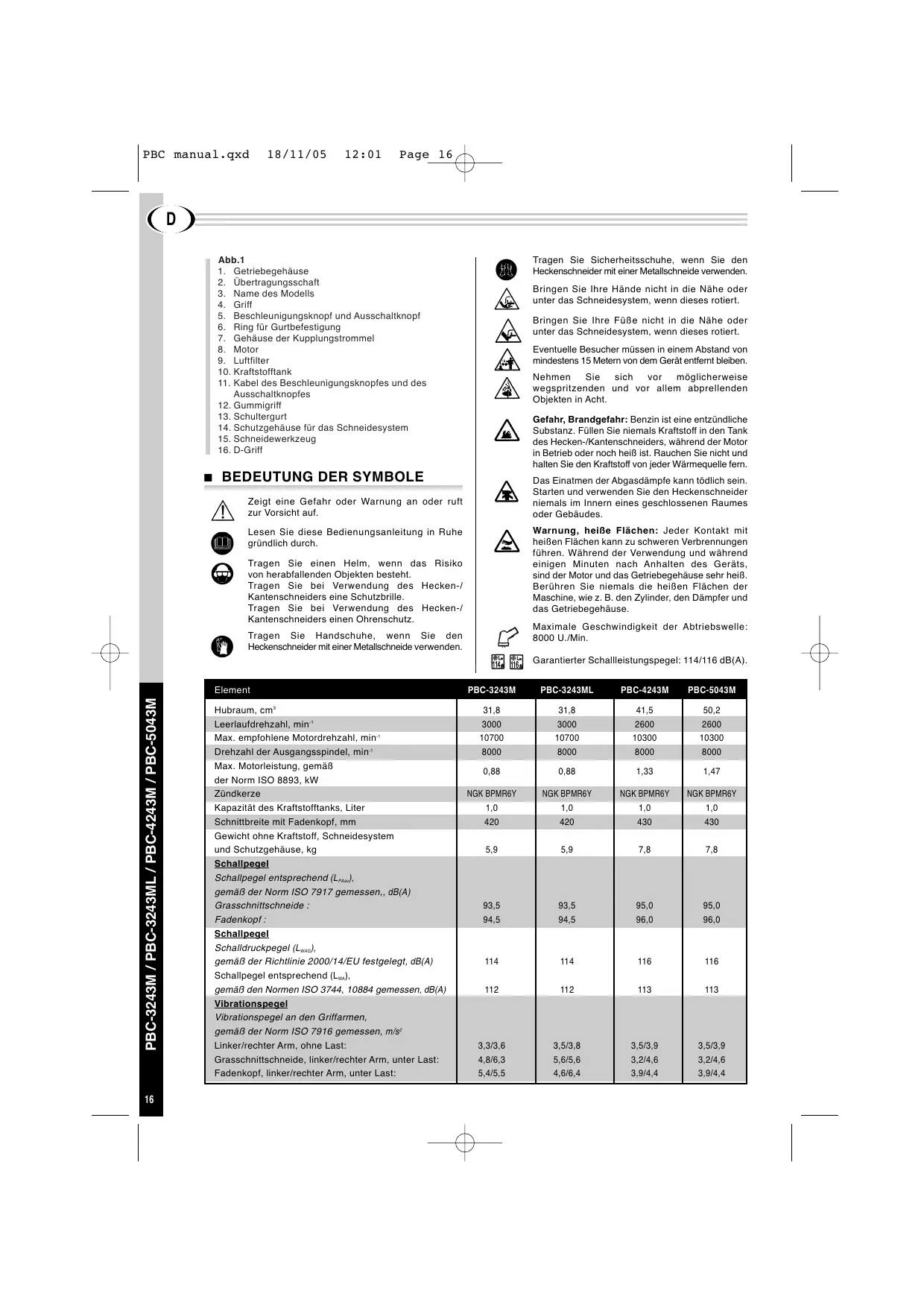 Das Einatmen der Abgasdämpfe kann tödlich sein. Starten und verwenden Sie den Heckenschneider niemals im Innern eines geschlossenen Raumes oder Gebäudes. Zeigt eine Gefahr oder Warnung an oder ruft zur Vorsicht auf. Warnung, heiße Flächen: Jeder Kontakt mit heißen Flächen kann zu schweren Verbrennungen führen. Während der Verwendung und während einigen Minuten nach Anhalten des Geräts, sind der Motor und das Getriebegehäuse sehr heiß. Berühren Sie niemals die heißen Flächen der Maschine, wie z. B. den Zylinder, den Dämpfer und das Getriebegehäuse. Lesen Sie diese Bedienungsanleitung in Ruhe gründlich durch. Tragen Sie einen Helm, wenn das Risiko von herabfallenden Objekten besteht. Tragen Sie bei Verwendung des Hecken-/ Kantenschneiders eine Schutzbrille. Tragen Sie bei Verwendung des Hecken-/ Kantenschneiders einen Ohrenschutz. Maximale Geschwindigkeit der Abtriebswelle: 8000 U./Min. Tragen Sie Handschuhe, wenn Sie den Heckenschneider mit einer Metallschneide verwenden. Garantierter Schallleistungspegel: 114/116 dB(A). PBC-3243M / PBC-3243ML / PBC-4243M / PBC-5043M Element