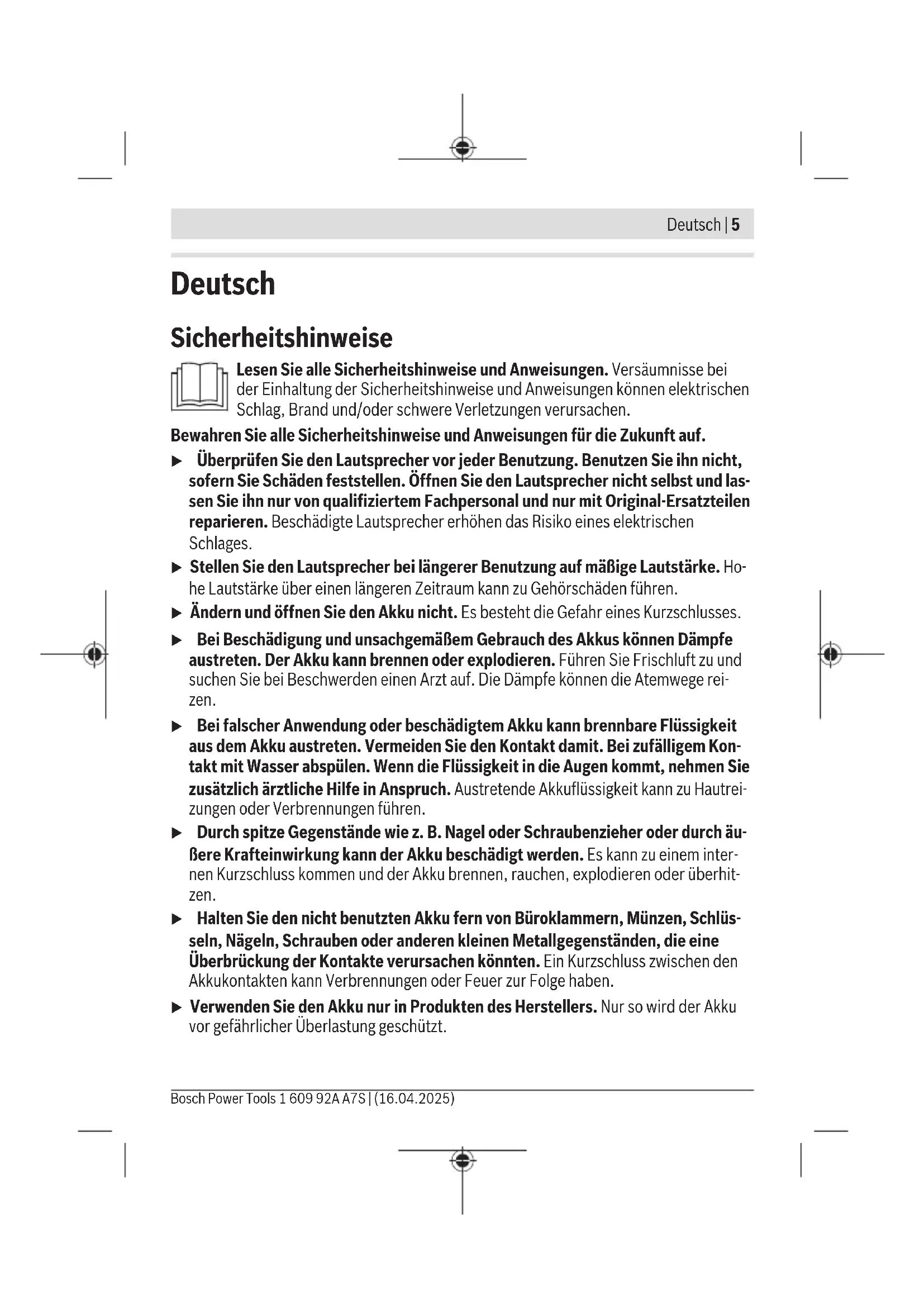 I/i 1 609 92A A7S | (16.04.2025) Bosch Power Tools| 3 (1) (2) (3) (4) (5)(6)(7) (8) (9) (10) (11) Bosch Power Tools 1 609 92A A7S | (16.04.2025)4 | (12) (13) (14) (15) 1 609 92A A7S | (16.04.2025) Bosch Power ToolsDeutsch | 5 Deutsch Sicherheitshinweise Lesen Sie alle Sicherheitshinweise und Anweisungen. Versäumnisse bei der Einhaltung der Sicherheitshinweise und Anweisungen können elektrischen Schlag, Brand und/oder schwere Verletzungen verursachen. Bewahren Sie alle Sicherheitshinweise und Anweisungen für die Zukunft auf. u Überprüfen Sie den Lautsprecher vor jeder Benutzung. Benutzen Sie ihn nicht, sofern Sie Schäden feststellen. Öffnen Sie den Lautsprecher nicht selbst und las- sen Sie ihn nur von qualifiziertem Fachpersonal und nur mit Original-Ersatzteilen reparieren. Beschädigte Lautsprecher erhöhen das Risiko eines elektrischen Schlages. u Stellen Sie den Lautsprecher bei längerer Benutzung auf mäßige Lautstärke. Ho- he Lautstärke über einen längeren Zeitraum kann zu Gehörschäden führen. u Ändern und öffnen Sie den Akku nicht. Es besteht die Gefahr eines Kurzschlusses. u Bei Beschädigung und unsachgemäßem Gebrauch des Akkus können Dämpfe austreten. Der Akku kann brennen oder explodieren. Führen Sie Frischluft zu und suchen Sie bei Beschwerden einen Arzt auf. Die Dämpfe können die Atemwege rei- zen. u Bei falscher Anwendung oder beschädigtem Akku kann brennbare Flüssigkeit aus dem Akku austreten. Vermeiden Sie den Kontakt damit. Bei zufälligem Kon- takt mit Wasser abspülen. Wenn die Flüssigkeit in die Augen kommt, nehmen Sie zusätzlich ärztliche Hilfe in Anspruch. Austretende Akkuflüssigkeit kann zu Hautrei- zungen oder Verbrennungen führen. u Durch spitze Gegenstände wie z. B. Nagel oder Schraubenzieher oder durch äu- ßere Krafteinwirkung kann der Akku beschädigt werden. Es kann zu einem inter- nen Kurzschluss kommen und der Akku brennen, rauchen, explodieren oder überhit- zen. u Halten Sie den nicht benutzten Akku fern von Büroklammern, Münzen, Schlüs- seln, Nägeln, Schrauben oder anderen kleinen Metallgegenständen, die eine Überbrückung der Kontakte verursachen könnten. Ein Kurzschluss zwischen den Akkukontakten kann Verbrennungen oder Feuer zur Folge haben. u Verwenden Sie den Akku nur in Produkten des Herstellers. Nur so wird der Akku vor gefährlicher Überlastung geschützt. Bosch Power Tools 1 609 92A A7S | (16.04.2025)6 | Deutsch u Laden Sie die Akkus nur mit Ladegeräten auf, die vom Hersteller empfohlen wer- den. Durch ein Ladegerät, das für eine bestimmte Art von Akkus geeignet ist, besteht Brandgefahr, wenn es mit anderen Akkus verwendet wird. Schützen Sie den Akku vor Hitze, z. B. auch vor dauernder Son- neneinstrahlung, Feuer, Schmutz, Wasser und Feuchtigkeit. Es besteht Explosions- und Kurzschlussgefahr. Die Wortmarke Bluetooth® wie auch die Bildzeichen (Logos) sind eingetragene Mar- ken und Eigentum der Bluetooth SIG, Inc. Jegliche Verwendung dieser Wortmarke/ Bildzeichen durch die RobertBosch PowerToolsGmbH erfolgt unter Lizenz. Produkt- und Leistungsbeschreibung Bitte beachten Sie die Abbildungen im vorderen Teil der Betriebsanleitung. Bestimmungsgemäßer Gebrauch Der Lautsprecher ist bestimmt zur Wiedergabe von Audiosignalen aus Quellen, die über Bluetooth® oder Multi-Speaker Sound verbunden sind. Abgebildete Komponenten Die Nummerierung der abgebildeten Komponenten bezieht sich auf die Darstellung des Lautsprechers auf der Grafikseite. (1) Taste Bluetooth® (2) Ein-/Aus-Taste (3) Statusanzeige (4) Taste Multi-Speaker Sound (5) Taste Lautstärke erhöhen (6) Taste Wiedergabe/Pause (7) Taste Lautstärke verringern (8) Tragegriff (9) Lautsprecher (10) Verriegelungshebel Akkuabdeckung