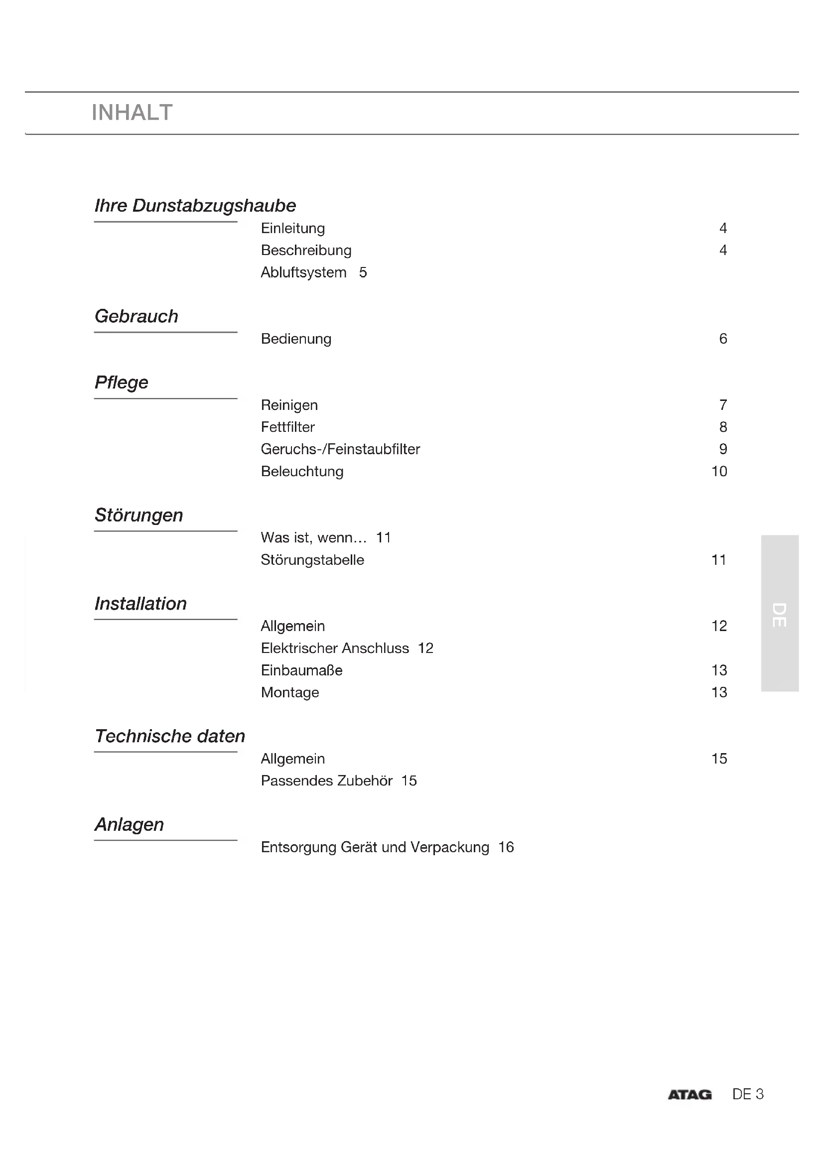 INHALT Ihre Dunstabzugshaube Einleitung 4 Beschreibung 4 Abluftsystem 5 Gebrauch Bedienung 6 Pflege Reinigen 7 Fettfilter 8 Geruchs-/Feinstaubfilter 9 Beleuchtung 10 Störungen Was ist, wenn… 11 Störungstabelle 11 Installation Allgemein 12 Elektrischer Anschluss 12 Einbaumaße 13 Montage 13 Technische daten Allgemein 15 Passendes Zubehör 15 Anlagen Entsorgung Gerät und Verpackung 16DE 4 Einleitung Herzlichen Glückwunsch zum Kauf Ihres neuen Geräts! Bei der Entwicklung dieses Produkts stand optimale Benutzerfreundlichkeit im Mittelpunkt. In diesem Handbuch erfahren Sie, wie Sie Ihr Gerät optimal verwenden. Neben Informationen zur Bedienung finden Sie hier auch Hintergrundinformationen, die bei der Verwendung dieses Geräts nützlich sein können. Lesen Sie vor der Inbetriebnahme des Geräts die separaten Sicherheitshinweise. Lesen Sie diese Bedienungsanleitung vor der ersten Inbetriebnahme sorgfältig durch, und heben Sie diese zum späteren Nachlesen gut auf. Beschreibung WO602