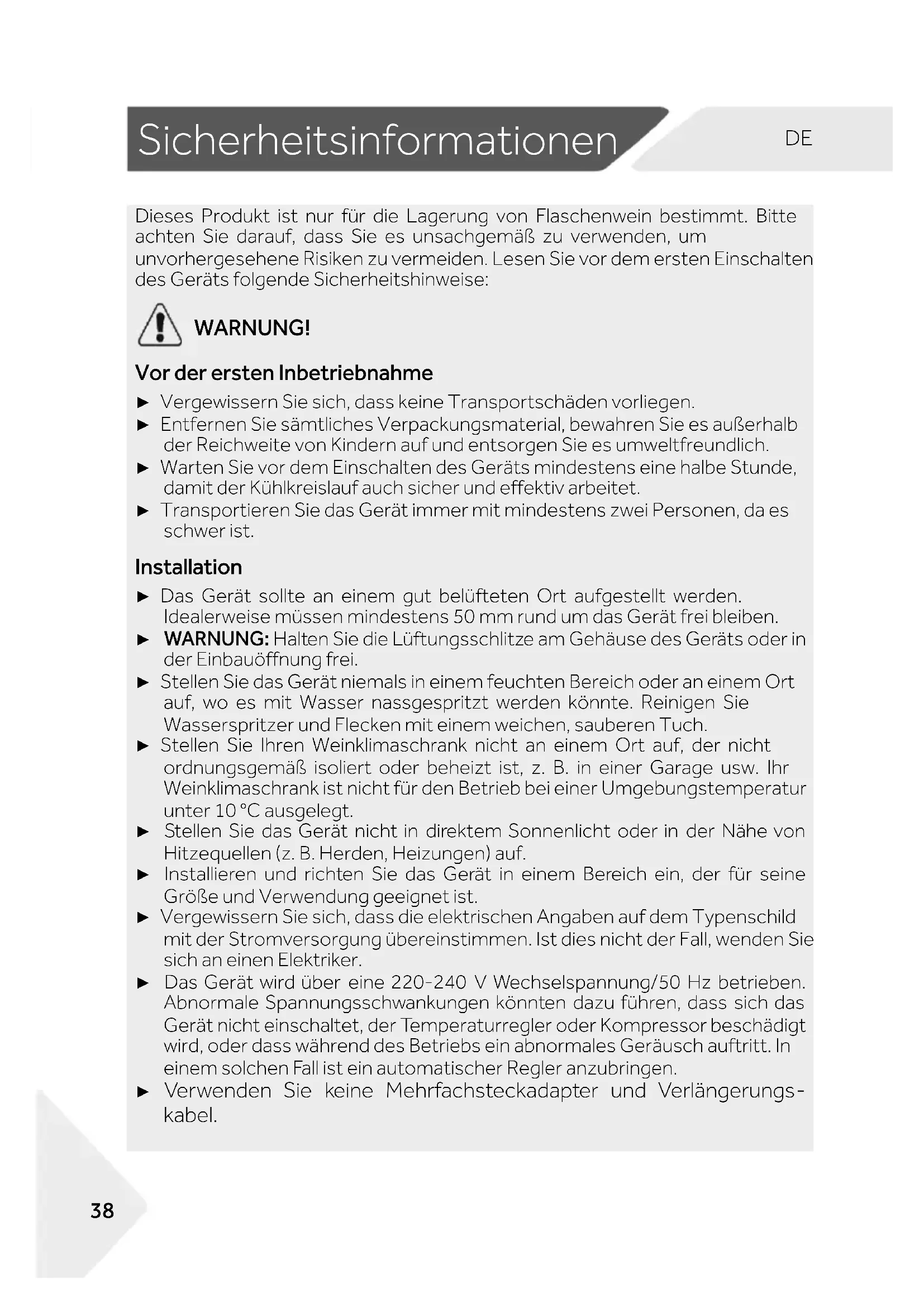 Dieses Produkt ist nur für die Lagerung von Flaschenwein bestimmt. Bitte achten Sie darauf, dass Sie es unsachgemäß zu verwenden, um unvorhergesehene Risiken zu vermeiden. Lesen Sie vor dem ersten Einschalten des Geräts folgende Sicherheitshinweise: WARNUNG! Vor der ersten Inbetriebnahme ► Vergewissern Sie sich, dass keine Transportschäden vorliegen. ► Entfernen Sie sämtliches Verpackungsmaterial, bewahren Sie es außerhalb der Reichweite von Kindern auf und entsorgen Sie es umweltfreundlich. ► Warten Sie vor dem Einschalten des Geräts mindestens eine halbe Stunde, damit der Kühlkreislauf auch sicher und effektiv arbeitet. ► Transportieren Sie das Gerät immer mit mindestens zwei Personen, da es schwer ist. Installation ► Das Gerät sollte an einem gut belüfteten Ort aufgestellt werden. Idealerweise müssen mindestens 50 mm rund um das Gerät frei bleiben. ► WARNUNG: Halten Sie die Lüftungsschlitze am Gehäuse des Geräts oder in der Einbauöffnung frei. ► Stellen Sie das Gerät niemals in einem feuchten Bereich oder an einem Ort auf, wo es mit Wasser nassgespritzt werden könnte. Reinigen Sie Wasserspritzer und Flecken mit einem weichen, sauberen Tuch. ► Stellen Sie Ihren Weinklimaschrank nicht an einem Ort auf, der nicht ordnungsgemäß isoliert oder beheizt ist, z. B. in einer Garage usw. Ihr Weinklimaschrank ist nicht für den Betrieb bei einer Umgebungstemperatur unter 10 °C ausgelegt. ► Stellen Sie das Gerät nicht in direktem Sonnenlicht oder in der Nähe von Hitzequellen (z. B. Herden, Heizungen) auf. ► Installieren und richten Sie das Gerät in einem Bereich ein, der für seine Größe und Verwendung geeignet ist. ► Vergewissern Sie sich, dass die elektrischen Angaben auf dem Typenschild mit der Stromversorgung übereinstimmen. Ist dies nicht der Fall, wenden Sie sich an einen Elektriker. ► Das Gerät wird über eine 220-240 V Wechselspannung/50 Hz betrieben. Abnormale Spannungsschwankungen könnten dazu führen, dass sich das Gerät nicht einschaltet, der Temperaturregler oder Kompressor beschädigt wird, oder dass während des Betriebs ein abnormales Geräusch auftritt. In einem solchen Fall ist ein automatischer Regler anzubringen. ► Verwenden Sie keine Mehrfachsteckadapter und Verlängerungs- kabel.Sicherheitsinformationen