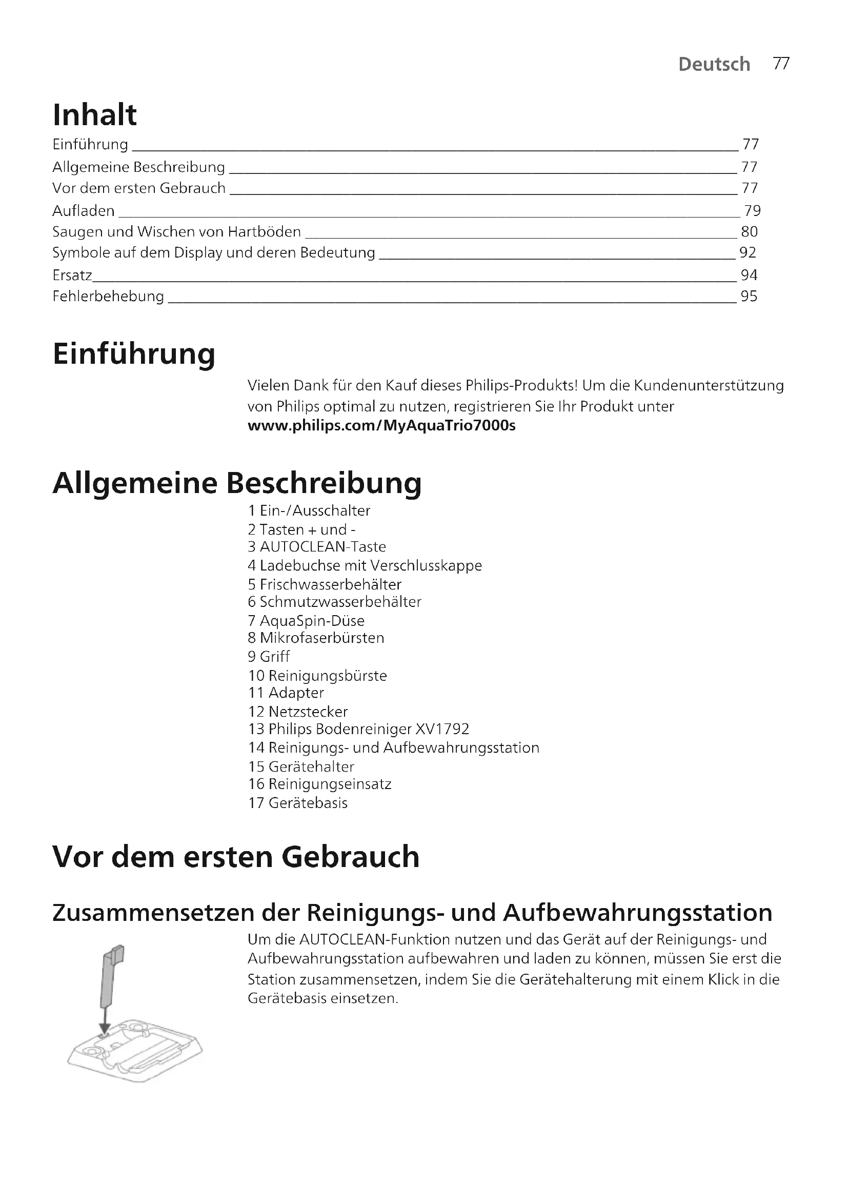 Deutsch Inhalt Einführung ________________________________________________________________________________ 77 Allgemeine Beschreibung ___________________________________________________________________ 77 Vor dem ersten Gebrauch ___________________________________________________________________ 77 Aufladen __________________________________________________________________________________ 79 Saugen und Wischen von Hartböden _________________________________________________________ 80 Symbole auf dem Display und deren Bedeutung _______________________________________________ 92 Ersatz_____________________________________________________________________________________ 94 Fehlerbehebung ___________________________________________________________________________ 95 Einführung Vielen Dank für den Kauf dieses Philips-Produkts! Um die Kundenunterstützung von Philips optimal zu nutzen, registrieren Sie Ihr Produkt unter www.philips.com/MyAquaTrio7000s Allgemeine Beschreibung 1 Ein-/Ausschalter 2 Tasten + und - 3 AUTOCLEAN-Taste 4 Ladebuchse mit Verschlusskappe 5 Frischwasserbehälter 6 Schmutzwasserbehälter 7 AquaSpin-Düse 8 Mikrofaserbürsten 9 Griff 10 Reinigungsbürste 11 Adapter 12 Netzstecker 13 Philips Bodenreiniger XV1792 14 Reinigungs- und Aufbewahrungsstation 15 Gerätehalter 16 Reinigungseinsatz 17 Gerätebasis Vor dem ersten Gebrauch Zusammensetzen der Reinigungs- und Aufbewahrungsstation Um die AUTOCLEAN-Funktion nutzen und das Gerät auf der Reinigungs- und Aufbewahrungsstation aufbewahren und laden zu können, müssen Sie erst die Station zusammensetzen, indem Sie die Gerätehalterung mit einem Klick in die Gerätebasis einsetzen.78 Deutsch Hinweis: Achten Sie darauf, dass der Reinigungseinsatz in der Gerätebasis liegt und die Temperatur des Raums, in dem das Gerät aufbewahrt, aufgeladen und gereinigt wird, zwischen 5°C und 35°C liegt. Hinweis: Sie können die Reinigungsbürste auch im Reinigungseinsatz aufbewahren. 1 Um das Gerät zusammenzusetzen, stecken Sie den Griff in das Gerät (er rastet hörbar ein). 2 Sie können das Gerät in der Reinigungs- und Aufbewahrungsstation verstauen. Setzen Sie das Gerät so auf die Gerätehalterung, dass das Ende der Gerätehalterung in das Gerät geschoben wird. Wenn Sie das Gerät erneut auseinandernehmen müssen, gehen Sie folgendermaßen vor: 1 Führen Sie einen Stift/Schlitz-Schraubendreher in die Öffnung an der Rückseite des Geräts ein, und ziehen Sie den Griff nach oben. 2 Ziehen Sie den Griff aus dem Gerät, während Sie weiterhin den Schraubendreher in die Öffnung schieben.79 Deutsch Aufladen Das Gerät ist mit einem 25V Lithium-Ionen-Akku ausgestattet. Das Laden dauert 4 Stunden. 1 Um das Gerät aufzuladen, öffnen Sie die Verschlusskappe an der Rückseite des Geräts. 2 Stecken Sie den Gerätestecker in die Buchse auf der Rückseite des Geräts. Stecken Sie dann den Adapter in die Steckdose. 3 Auf dem Display blinkt ein Wert zwischen „0%“ und „90%“, um anzuzeigen, dass das Gerät aufgeladen wird. 4 Wenn das Gerät vollständig aufgeladen ist, leuchtet der Wert „100%“ auf dem Display auf. Nach ein paar Minuten schaltet sich der Display aus. 5 Ziehen Sie den Gerätestecker aus der Buchse an der Rückseite des Geräts. 6 Schließen Sie die Verschlusskappe. Warnhinweis: Laden Sie das Gerät bei Temperaturen über 5°C und unter 35°C auf. Bewahren Sie es auch in diesem Temperaturbereich auf.80 Deutsch Hinweis: Sie können das Gerät in der Reinigungs- und Aufbewahrungsstation aufladen. Hinweis: Sie können das Gerät separat an einem Ort aufladen, der für Sie praktisch ist. Saugen und Wischen von Hartböden Das Gerät verwenden Der Frischwasserbehälter und der Schmutzwasserbehälter sind bei der Lieferung bereits am Gerät angebracht. Sie können das Gerät zur Reinigung von Hartböden verwenden. Hinweis: Dieses Gerät ist für gleichzeitiges Saugen und Wischen geeignet. Es ist nicht notwendig, den Fußboden vor dem Wischen zu saugen. Das Gerät ist für das Saugen und Wischen aller Arten von Hartböden geeignet, mit Ausnahme von nicht versiegelten Holzfußböden. Sie können das Gerät in einem kleinen Bereich testen, der nicht direkt ins Auge fällt, um sicherzugehen, dass das Gerät für Ihren Boden geeignet ist. 1 Drücken Sie die Taste zur Entriegelung des Frischwasserbehälters nach unten, und nehmen Sie den Frischwasserbehälter heraus. 2 Öffnen Sie die Verschlusskappe des Frischwasserbehälters.81 Deutsch 3 Füllen Sie 15ml XV1792 Philips Fußbodenreiniger in den Frischwasserbehälter ein. Achtung: Philips hat dieses Gerät ausschließlich mit XV1792 Philips Bodenreiniger getestet. Andere Reinigungsmittel bilden mitunter zu viel Schaum, was die Leistung des Geräts beeinträchtigt und zu Fehlfunktionen führen kann. XV1792 Philips Bodenreiniger ist in ausgewählten Geschäften verfügbar. Wenn Sie einen anderen geeigneten Fußbodenreiniger verwenden, füllen Sie höchstens 15ml davon in den Frischwasserbehälter ein. 4 Füllen Sie den Frischwasserbehälter bis oben hin mit kaltem oder lauwarmem Leitungswasser. Achtung: Das Leitungswasser, das in den Frischwasserbehälter gefüllt wird, darf nicht wärmer als 50°C sein. 5 Schließen Sie die Verschlusskappe des Wasserbehälters. 6 Setzen Sie den Frischwasserbehälter wieder in das Gerät ein.82 Deutsch 7 Nehmen Sie das Gerät aus der Reinigungs- und Aufbewahrungsstation, und stellen Sie es auf den Boden. Setzen Sie Ihren Fuß auf die AquaSpin-Düse, und ziehen Sie den Griff nach hinten, um die AquaSpin-Düse zu entriegeln. Das Gerät ist nun einsatzbereit. 8 Drücken Sie den Ein-/Ausschalter , um das Gerät einzuschalten. Das Gerät wird eingeschaltet. Achtung: Lassen Sie das Gerät nicht unbeaufsichtigt, wenn die AquaSpin-Düse entriegelt oder das Gerät eingeschaltet ist. 9 Verwenden Sie die Tasten + und -, um zwischen drei verschiedenen Einstellungen zu wählen: