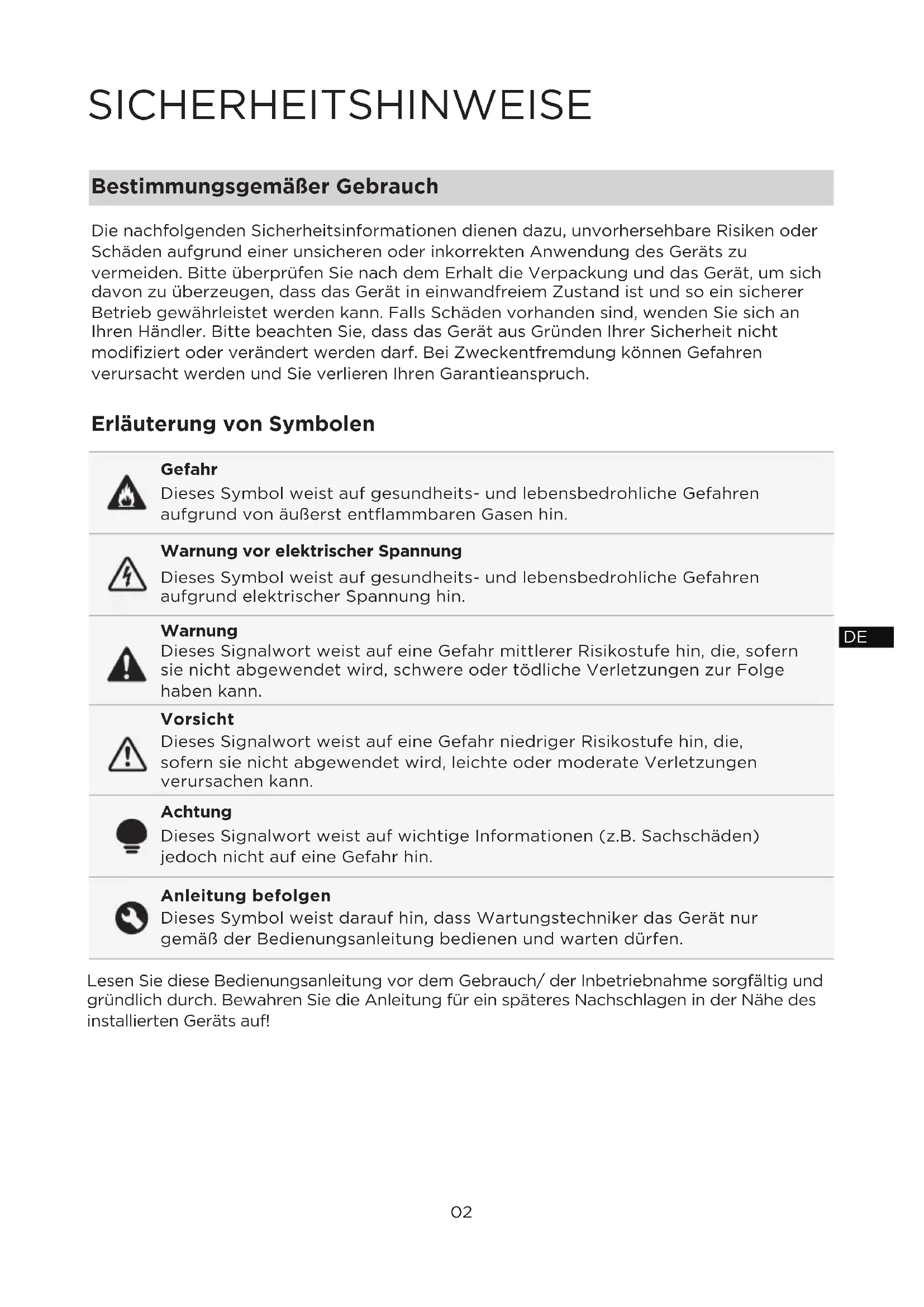 Lesen Sie diese Bedienungsanleitung vor dem Gebrauch/ der Inbetriebnahme sorgfältig und gründlich durch. Bewahren Sie die Anleitung für ein späteres Nachschlagen in der Höhe des installierten Geräts auf!