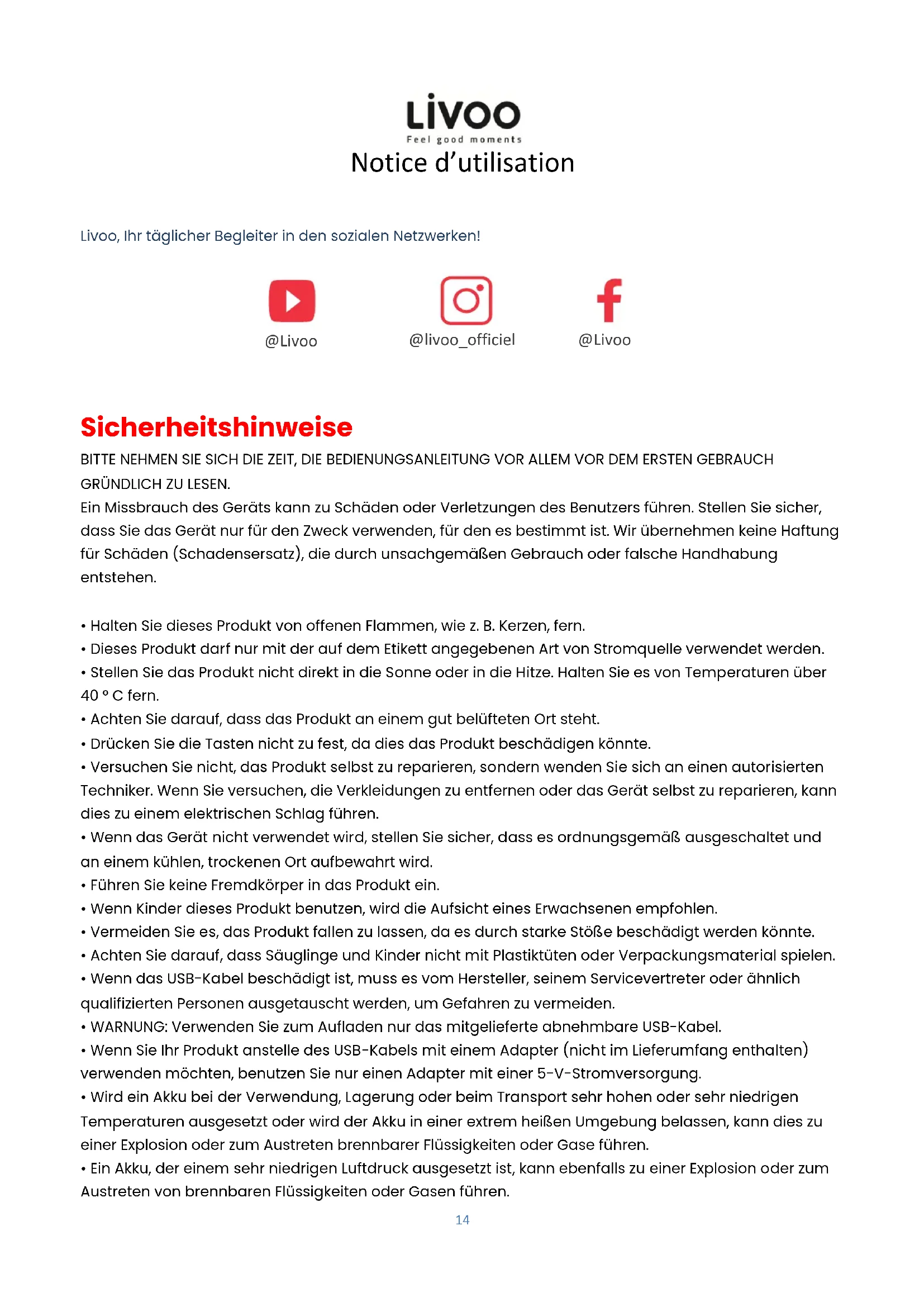 - Ein Akku, der einem sehr niedrigen Luftdruck ausgesetzt ist, kann ebenfalls zu einer Explosion oder zum Austreten von brennbaren Flüssigkeiten oder Gasen führen. @livoo_officiel @Livoo @LivooNotice d’utilisation
