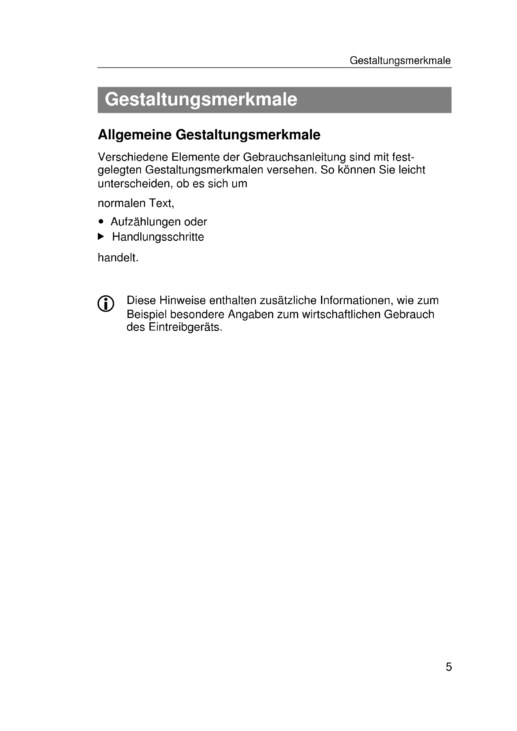 Diese Hinweise enthalten zusätzliche Informationen, wie zum Beispiel besondere Angaben zum wirtschaftlichen Gebrauch des Eintreibgeräts.Gestaltungsmerkmale