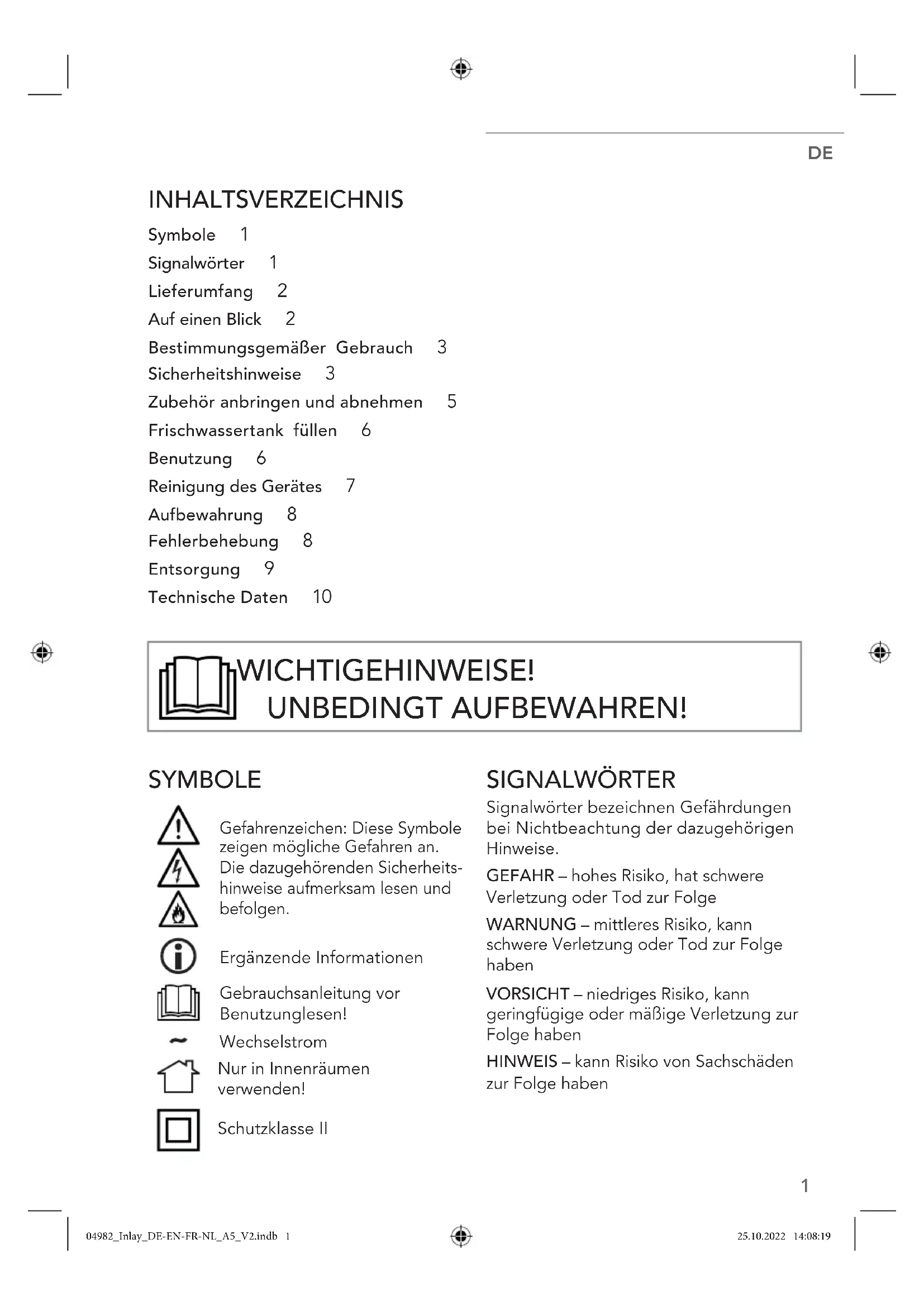 INHALTSVERZEICHNIS Symbole 1 Signalwörter 1 Lieferumfang 2 Auf einen Blick 2 Bestimmungsgemäßer Gebrauch 3 Sicherheitshinweise 3 Zubehör anbringen und abnehmen 5 Frischwassertank füllen 6 Benutzung 6 Reinigung des Gerätes 7 Aufbewahrung 8 Fehlerbehebung 8 Entsorgung 9 Technische Daten 10 SYMBOLE Gefahrenzeichen: Diese Symbole zeigen mögliche Gefahren an. Die dazugehörenden Sicherheits- hinweise aufmerksam lesen und befolgen. Ergänzende Informationen Gebrauchsanleitung vor Benutzung lesen! Wechselstrom Nur in Innenräumen verwenden! Schutzklasse II SIGNALWÖRTER Signalwörter bezeichnen Gefährdungen bei Nichtbeachtung der dazugehörigen Hinweise. GEFAHR – hohes Risiko, hat schwere Verletzung oder Tod zur Folge WARNUNG – mittleres Risiko, kann schwere Verletzung oder Tod zur Folge haben VORSICHT – niedriges Risiko, kann geringfügige oder mäßige Verletzung zur Folge haben HINWEIS – kann Risiko von Sachschäden zur Folge haben WICHTIGE HINWEISE! UNBEDINGT AUFBEWAHREN! 04982_Inlay_DE-EN-FR-NL_A5_V2.indb 104982_Inlay_DE-EN-FR-NL_A5_V2.indb 1 25.10.2022 14:08:1925.10.2022 14:08:19DE