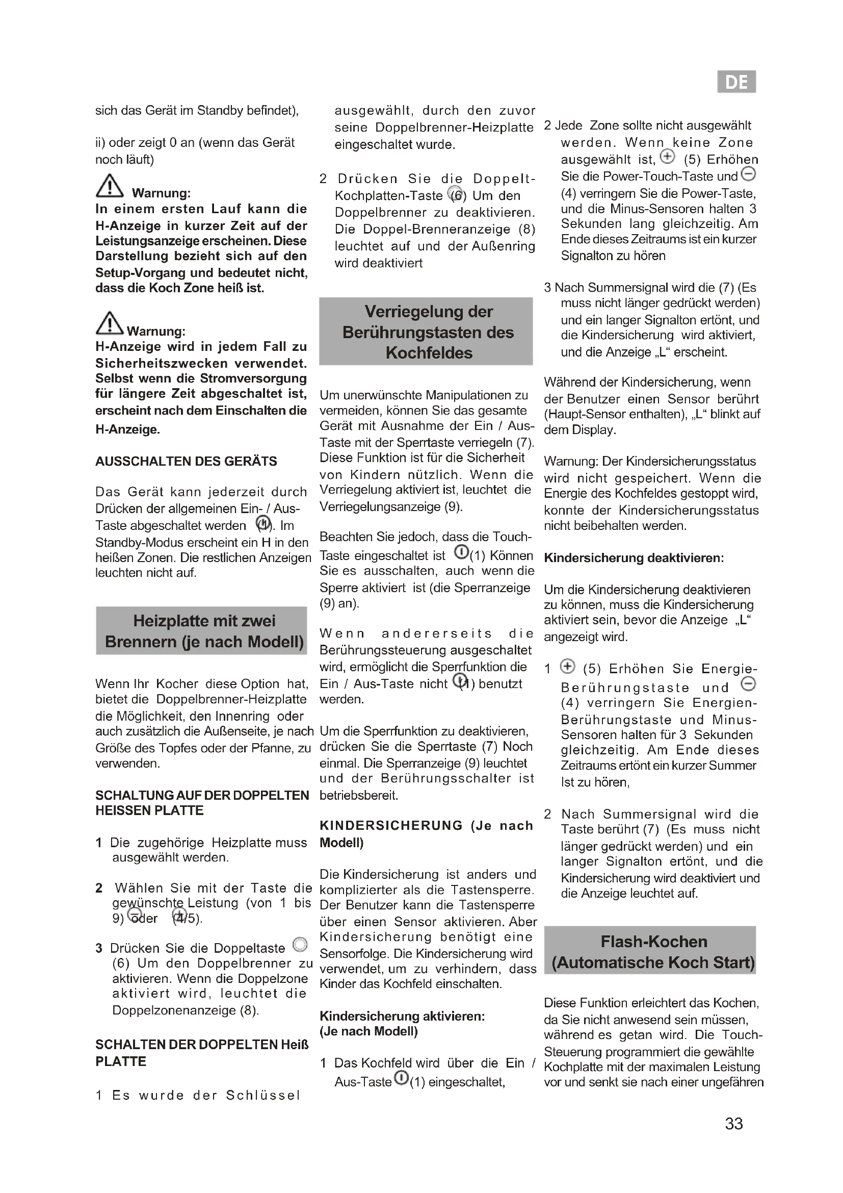 noch läuft) Warnung: In einem ersten Lauf kann die H-Anzeige in kurzer Zeit auf der Leistungsanzeige erscheinen. Diese Darstellung bezieht sich auf den Setup-Vorgang und bedeutet nicht, dass die Koch Zone heiß ist. Warnung: H-Anzeige wird in jedem Fall zu Sicherheitszwecken verwendet. Selbst wenn die Stromversorgung für längere Zeit abgeschaltet ist, erscheint nach dem Einschalten die H-Anzeige.