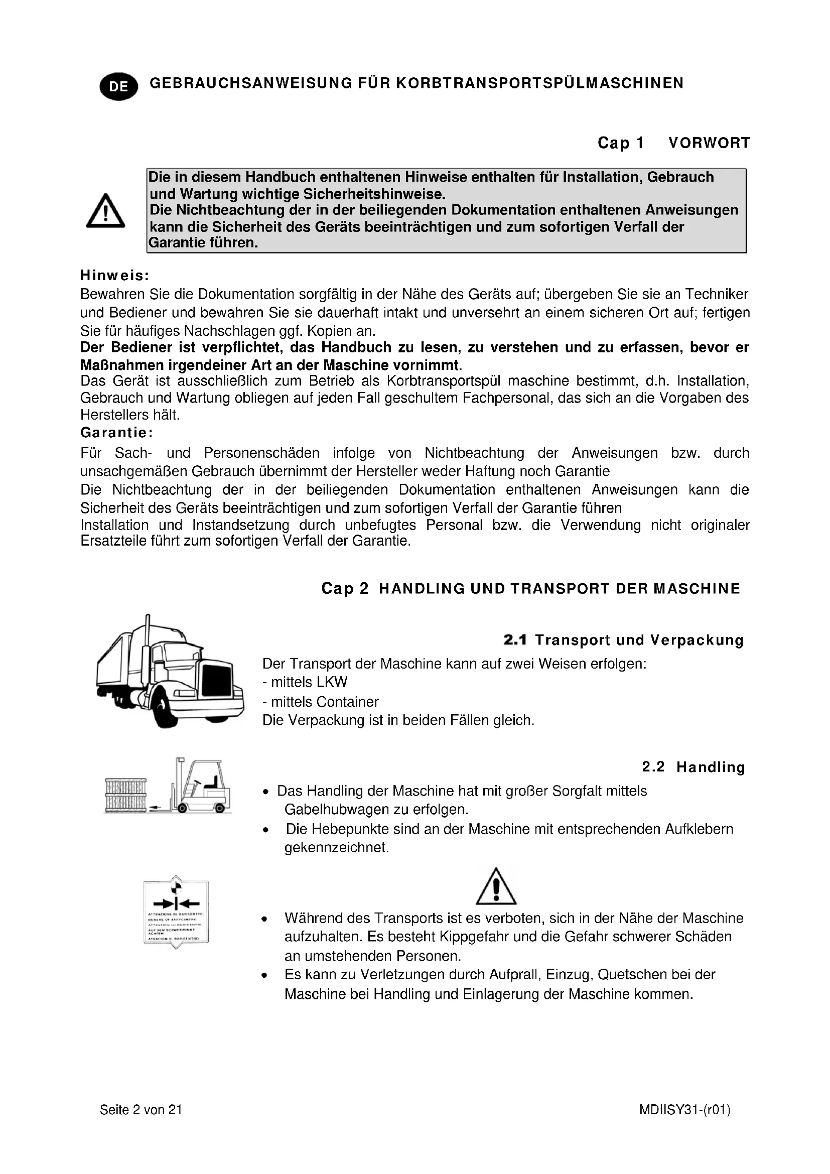 - Es kann zu Verletzungen durch Aufprall, Einzug, Quetschen bei der Maschine bei Handling und Einlagerung der Maschine kommen.GEBRAUCHSANWEISUNG FÜR KORBTRANSPORTSPÜLMASCHINEN MDIISY31-(r01) Seite 3 von 21