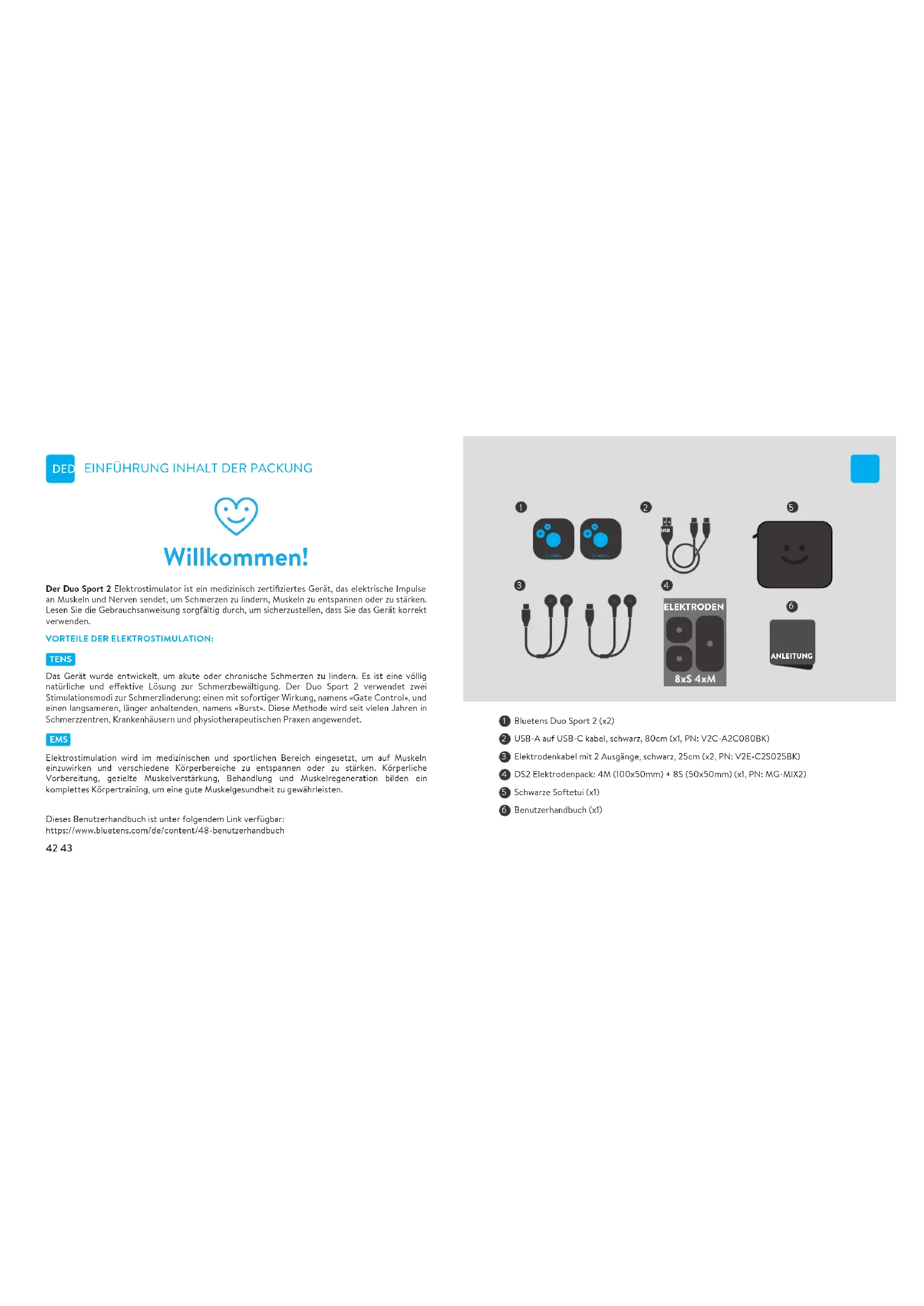 FR FR 40 4140 41Der Duo Sport 2 Elektrostimulator ist ein medizinisch zertifiziertes Gerät, das elektrische Impulse an Muskeln und Nerven sendet, um Schmerzen zu lindern, Muskeln zu entspannen oder zu stärken. Lesen Sie die Gebrauchsanweisung sorgfältig durch, um sicherzustellen, dass Sie das Gerät korrekt verwenden. Willkommen! VORTEILE DER ELEKTROSTIMULATION:Das Gerät wurde entwickelt, um akute oder chronische Schmerzen zu lindern. Es ist eine völlig natürliche und eektive Lösung zur Schmerzbewältigung. Der Duo Sport 2 verwendet zwei Stimulationsmodi zur Schmerzlinderung: einen mit sofortiger Wirkung, namens «Gate Control», und einen langsameren, länger anhaltenden, namens «Burst». Diese Methode wird seit vielen Jahren in Schmerzzentren, Krankenhäusern und physiotherapeutischen Praxen angewendet.Elektrostimulation wird im medizinischen und sportlichen Bereich eingesetzt, um auf Muskeln einzuwirken und verschiedene Körperbereiche zu entspannen oder zu stärken. Körperliche Vorbereitung, gezielte Muskelverstärkung, Behandlung und Muskelregeneration bilden ein komplettes Körpertraining, um eine gute Muskelgesundheit zu gewährleisten.Dieses Benutzerhandbuch ist unter folgendem Link verfügbar:https://www.bluetens.com/de/content/48-benutzerhandbuch TENS EMS Bluetens Duo Sport 2 (x2)USB-A auf USB-C kabel, schwarz, 80cm (x1, PN: V2C-A2C080BK)Elektrodenkabel mit 2 Ausgänge, schwarz, 25cm (x2, PN: V2E-C2S025BK)DS2 Elektrodenpack: 4M (100x50mm) + 8S (50x50mm) (x1, PN: MG-MIX2)Schwarze Softetui (x1)Benutzerhandbuch (x1)