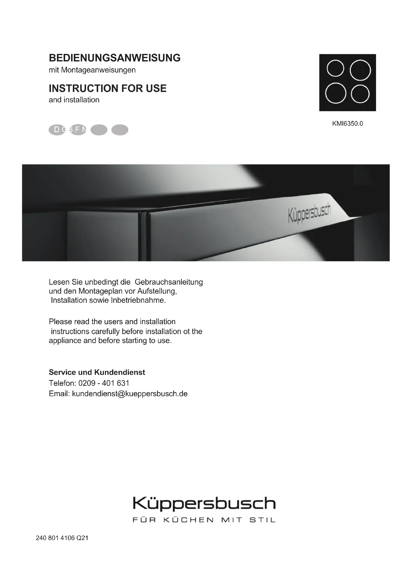 and installation D GB F NL Lesen Sie unbedingt die Gebrauchsanleitung und den Montageplan vor Aufstellung, Installation sowie Inbetriebnahme. Please read the users and installation instructions carefully before installation ot the appliance and before starting to use. Service und Kundendienst Telefon: 0209 - 401 631 Email: kundendienst@kueppersbusch.de KMI6350.02